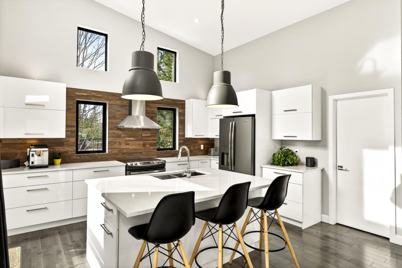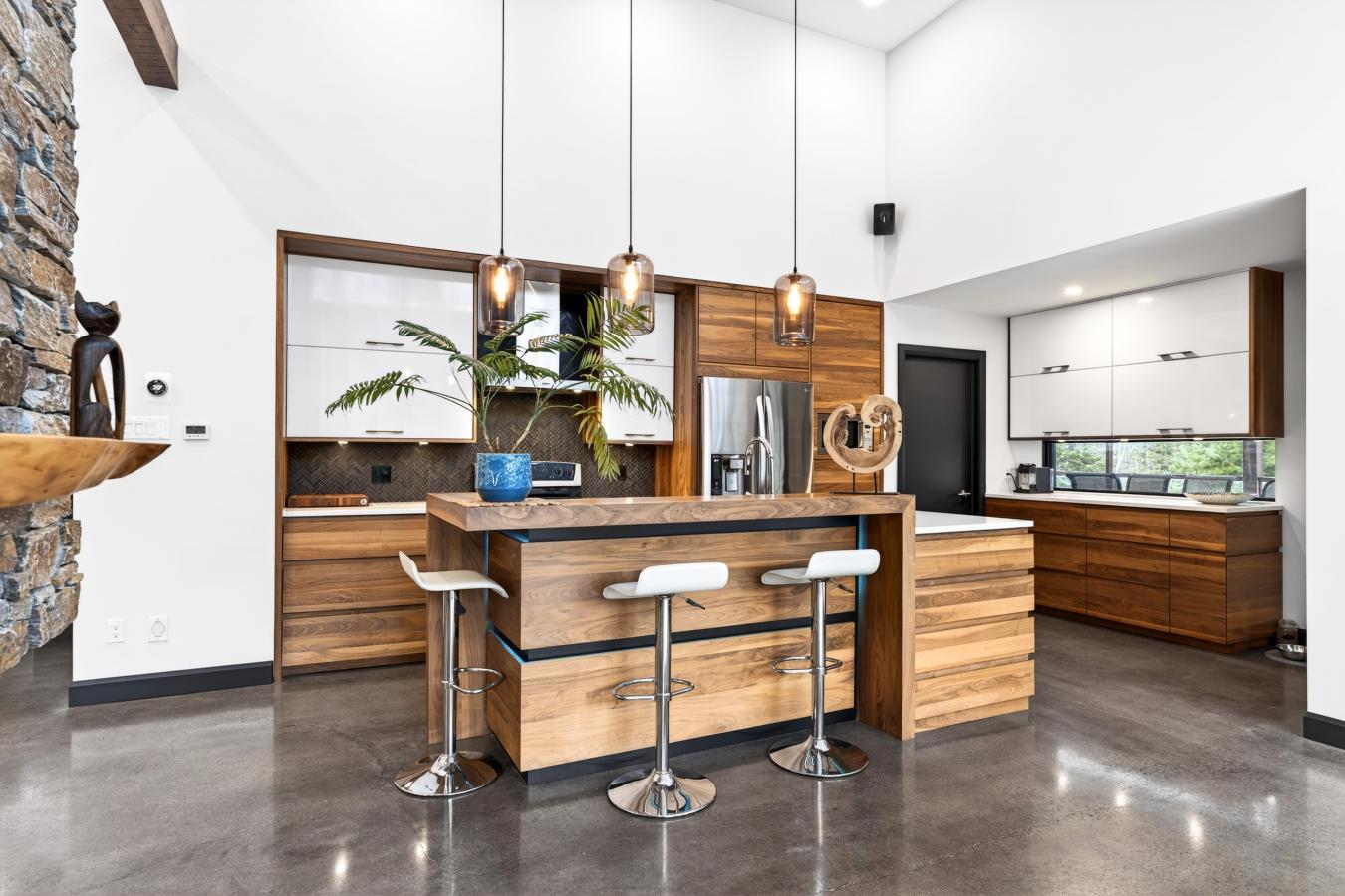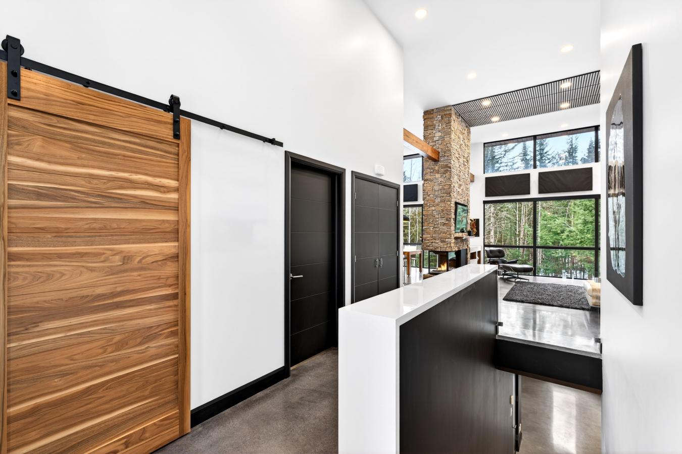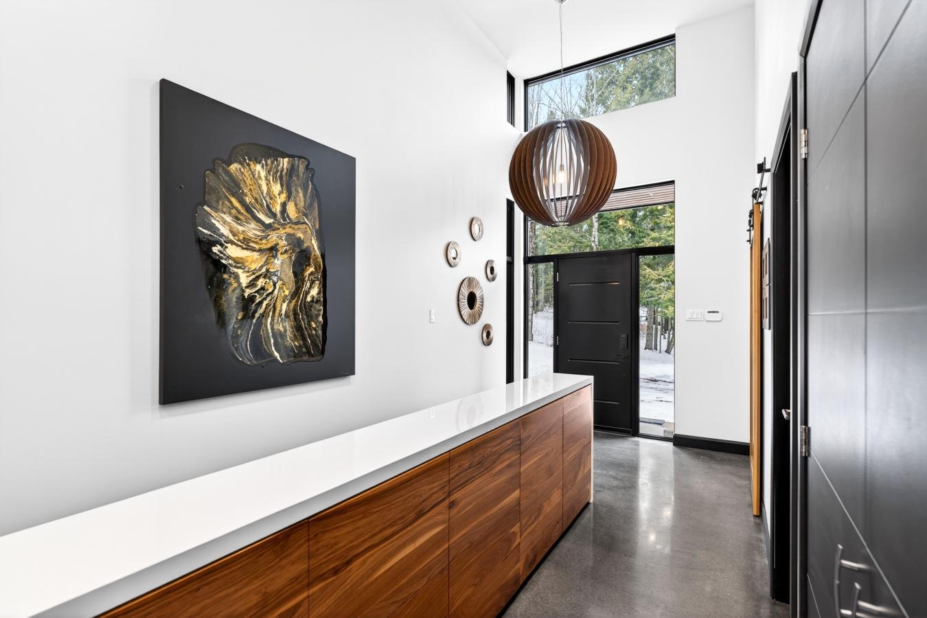 Imagine living in the heart of a peaceful, natural setting, in a property with a clean, Nordic design. Offering 32,750 sq ft of land, this home provides an exceptional living environment. Its bright, open-concept living area, enhanced by a nearly 14-foot ceiling and abundant windows, is centered around a warm, wood-burning fireplace.