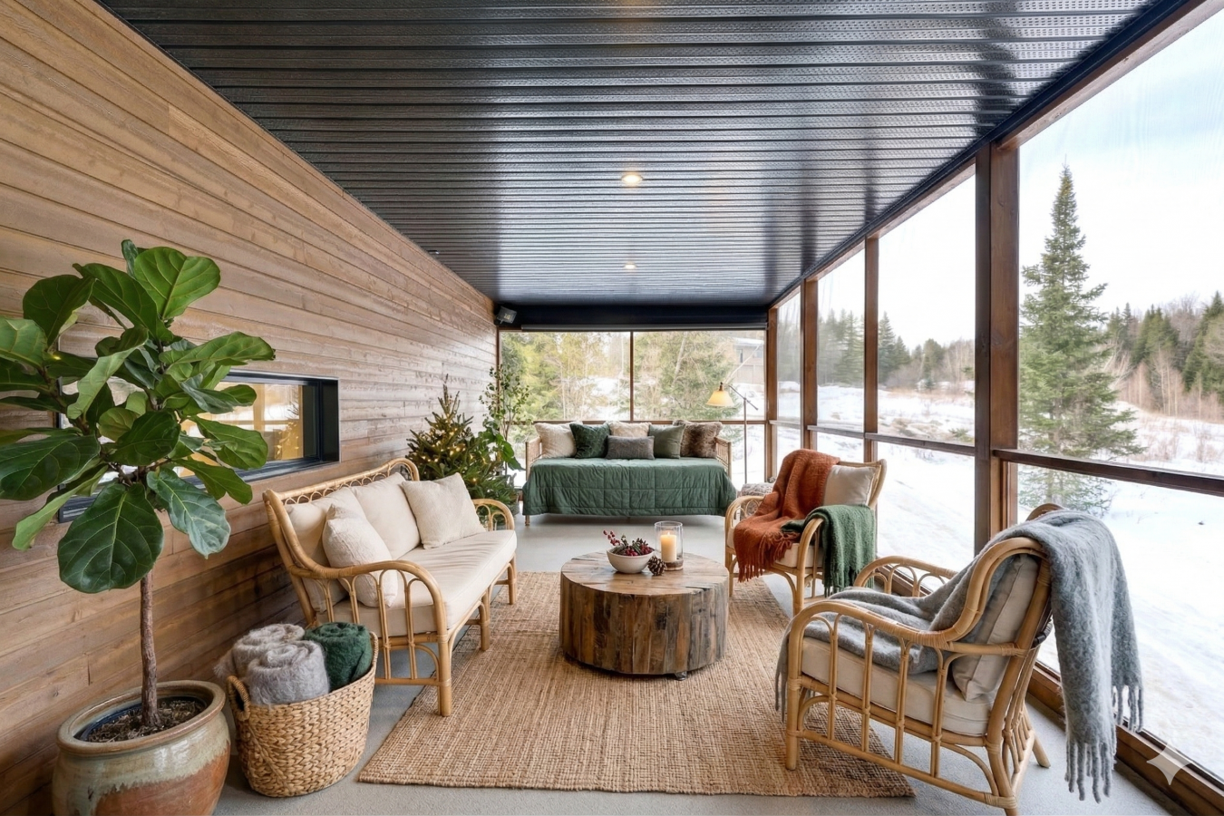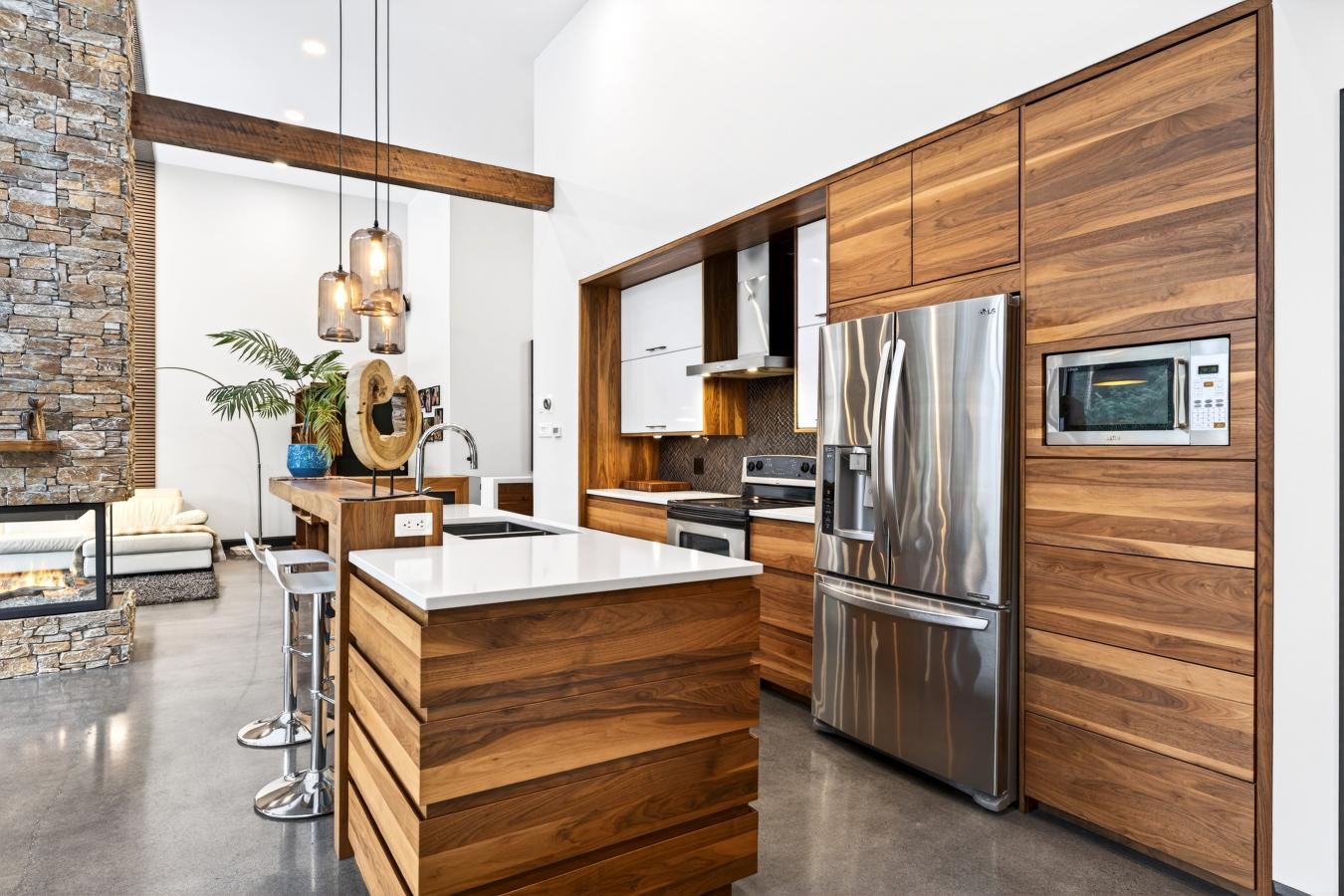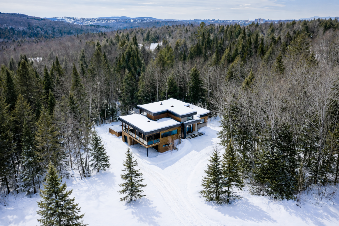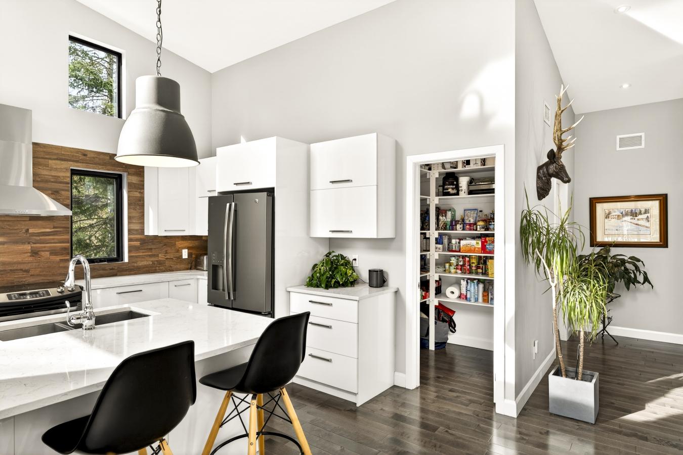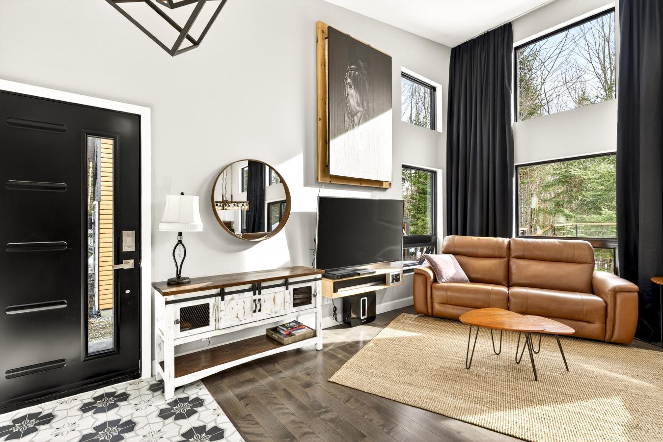 Imagine living in the heart of a peaceful, natural setting, in a property with a clean, Nordic design. Offering 32,750 sq ft of land, this home provides an exceptional living environment. Its bright, open-concept living area, enhanced by a nearly 14-foot ceiling and abundant windows, is centered around a warm, wood-burning fireplace.