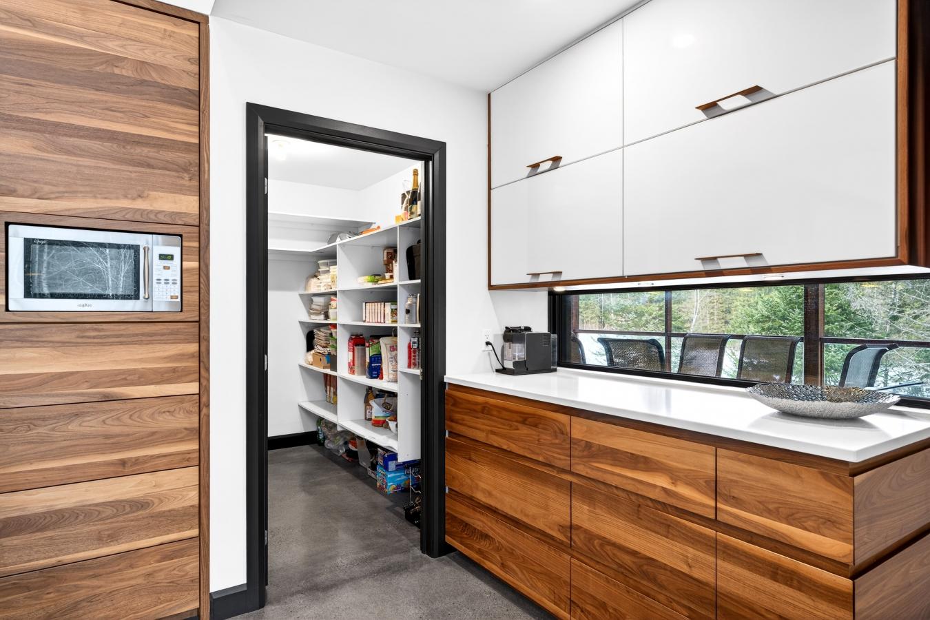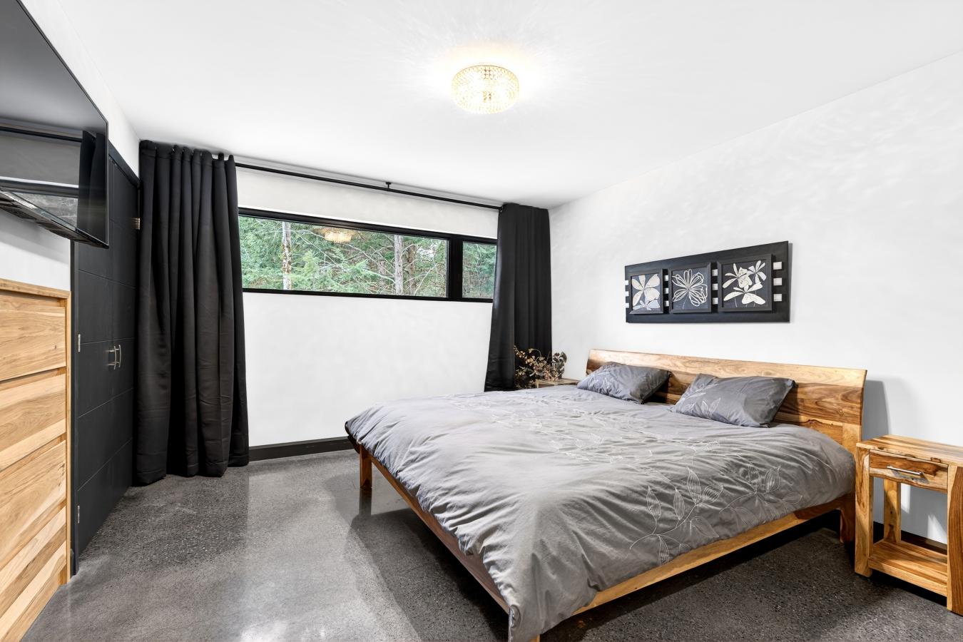 A true haven of peace, this upscale property boasts contemporary architecture and fine materials, situated on a private, nearly 2.5-acre wooded lot on a cul-de-sac. The living area, with its 14-foot ceiling and spectacular glass wall, showcases a three-sided stone fireplace, a solid walnut kitchen, and radiant concrete floors. Three bedrooms and a spa-style bathroom are located on the main floor.