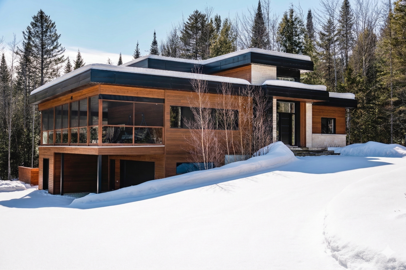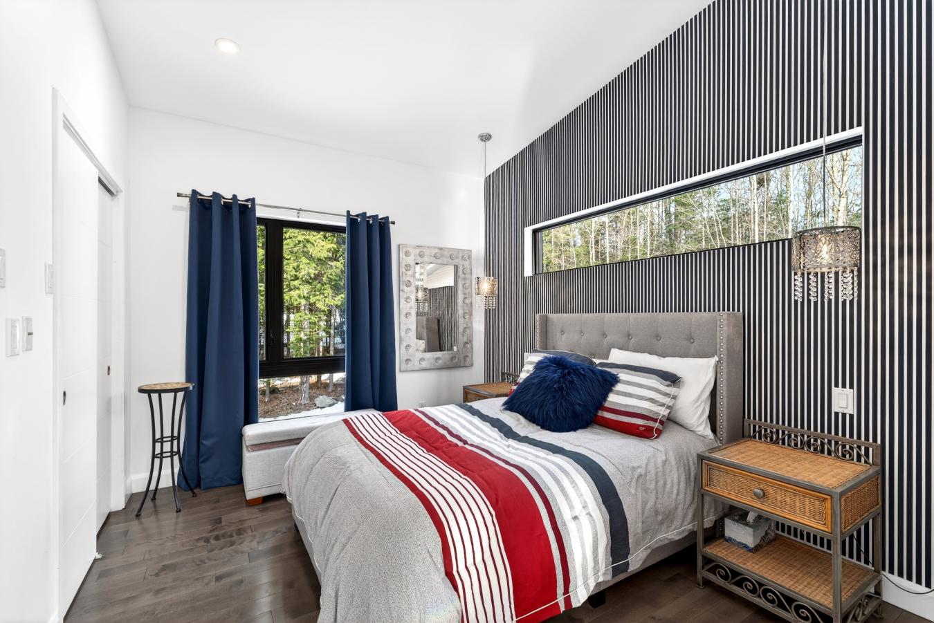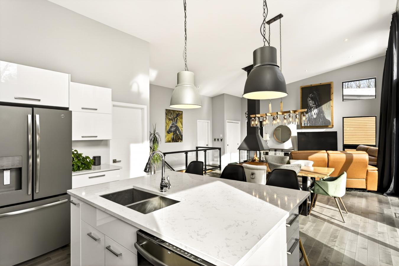 Imagine living in the heart of a peaceful, natural setting, in a property with a clean, Nordic design. Offering 32,750 sq ft of land, this home provides an exceptional living environment. Its bright, open-concept living area, enhanced by a nearly 14-foot ceiling and abundant windows, is centered around a warm, wood-burning fireplace. A modern kitchen features quartz countertops and a welcoming island. Three bedrooms and two bathrooms. A versatile basement and a large double garage complete the picture. The private lot includes a natural stream. All this, close to Lac dArgent, Mont Orford, and Magog.