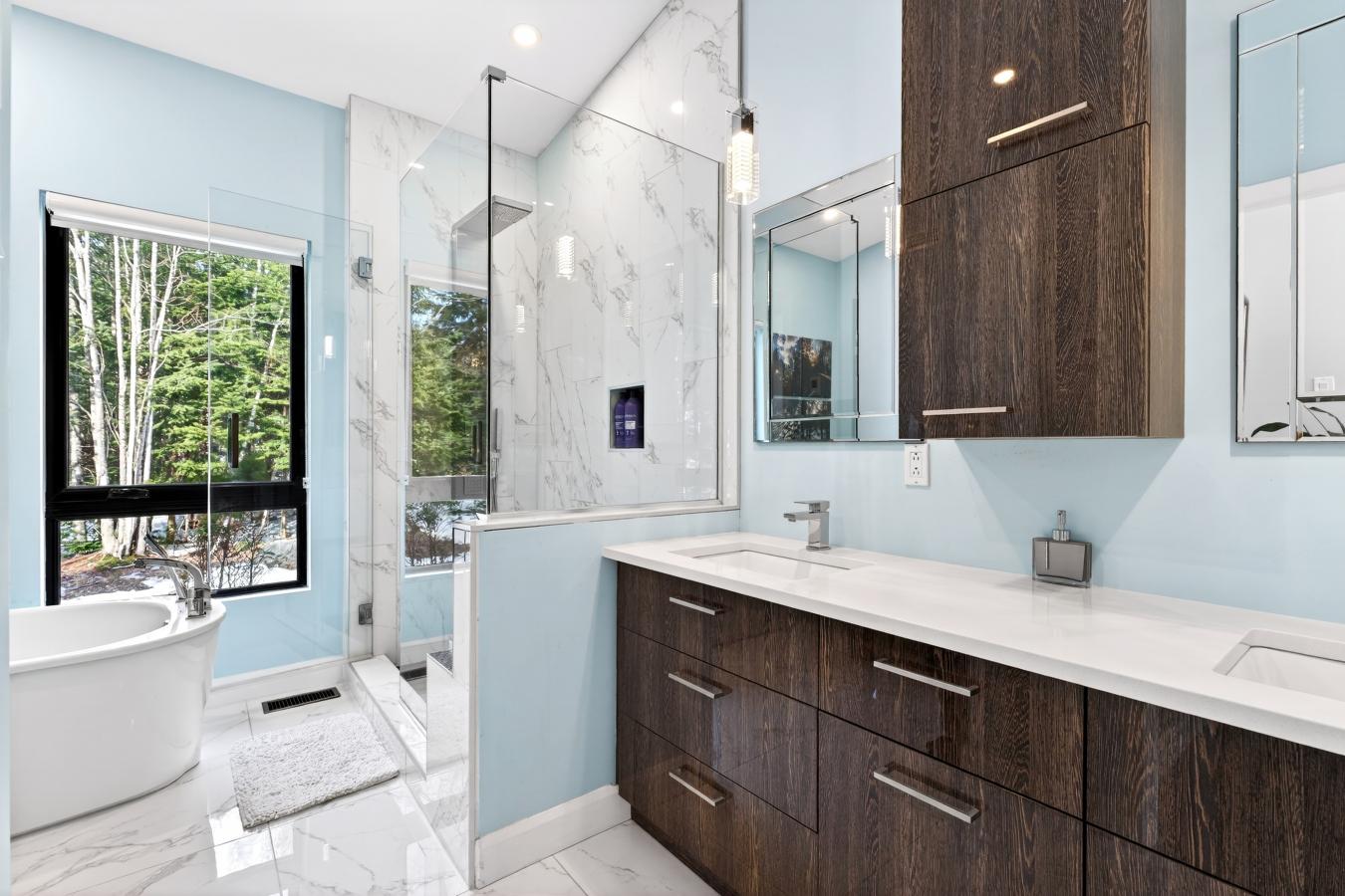 A true haven of peace, this upscale property boasts contemporary architecture and fine materials, situated on a private, nearly 2.5-acre wooded lot on a cul-de-sac. The living area, with its 14-foot ceiling and spectacular glass wall, showcases a three-sided stone fireplace, a solid walnut kitchen, and radiant concrete floors. Three bedrooms and a spa-style bathroom are located on the main floor. The bright walk-out basement offers the potential for a multi-generational living space. A large three-season sunroom, a double garage, and an attached shed complete the property. Just 5 minutes from the CHUS hospital, the highway, and local shops.
