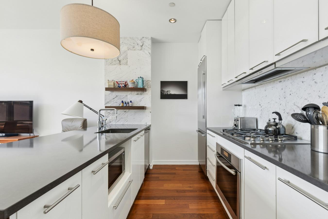 Welcome to Apt 4G at 80 Metropolitan Avenue, located in prime north Williamsburg and offering a rare 25-year tax abatement through 2035. This bright 1-bedroom, 1-bathroom apartment includes a gorgeous, nearly 400-square-foot private rooftop cabana and boasts nearly 700 square feet of living space. Perched on the 4th floor of a 6-story building designed by the renowned Greenberg Farrow architecture firm and developed by Steiner Equities. The residence features 10-foot ceilings and oversized windows that bring in abundant natural light and provide views of the open skies. The living room showcases an impressive width of over 15 feet, providing flexibility for various layouts, including options for both dining and a home office. The luxurious open kitchen comes equipped with high-end appliances, including a Liebherr refrigerator, a Miele oven, a Miele cooktop, and a Bosch dishwasher. Marble finishes and polished Caesarstone countertops elevate the kitchens aesthetic, complemented by lacquer and glass cabinetry featuring Wenge details. A garbage disposal is also included for convenience. The bathroom is designed with a custom Wenge vanity, a Grohe rainwater showerhead, and a deep soaking tub, ensuring a comfortable and stylish experience. The apartment includes abundant closet space and a washer/dryer for added practicality. The interiors are adorned with Peruvian lapacho walnut hardwood floors, enhancing the overall appeal. Whats more is the home boasts "acoustical privacy," where every effort has been made to ensure a serene living environment. The quality construction includes extra insulation between walls, a staggered stud system, double layers of sheetrock, and thick concrete slabs between floors, making for a quiet living experience. Perhaps the highlight of this extraordinary opportunity is your own privately deeded rooftop sanctuary, where you can entertain and dine al fresco, escape the daily city bustle, or enjoy your morning coffee or tea in the warmth of the rising sun. The cabana is fully equipped with water and electricity. A deeded parking space is also available for an additional 125,000. 80 Metropolitan boasts the highest quality amenities, including a 24-hour doorman, indoor swimming pool, fitness center, yoga room, private parking garage, zen garden, media lounge w/kitchenette, refrigerated storage, a bike room, and a roof deck with Williamsburg Bridge views. You also have the added bonus of a rare 25-year tax abatement with 10 years remaining. This full-service building is conveniently situated in the heart of Williamsburg, a short distance from Domino Park, Marsha P. Johnson State Park, Bushwick Inlet Park, Trader Joes, Whole Foods, the best shopping & dining, and a multitude of convenient transportation choices with the East River Ferry and the L, G, J, M, and Z trains. Please email for an appointment.