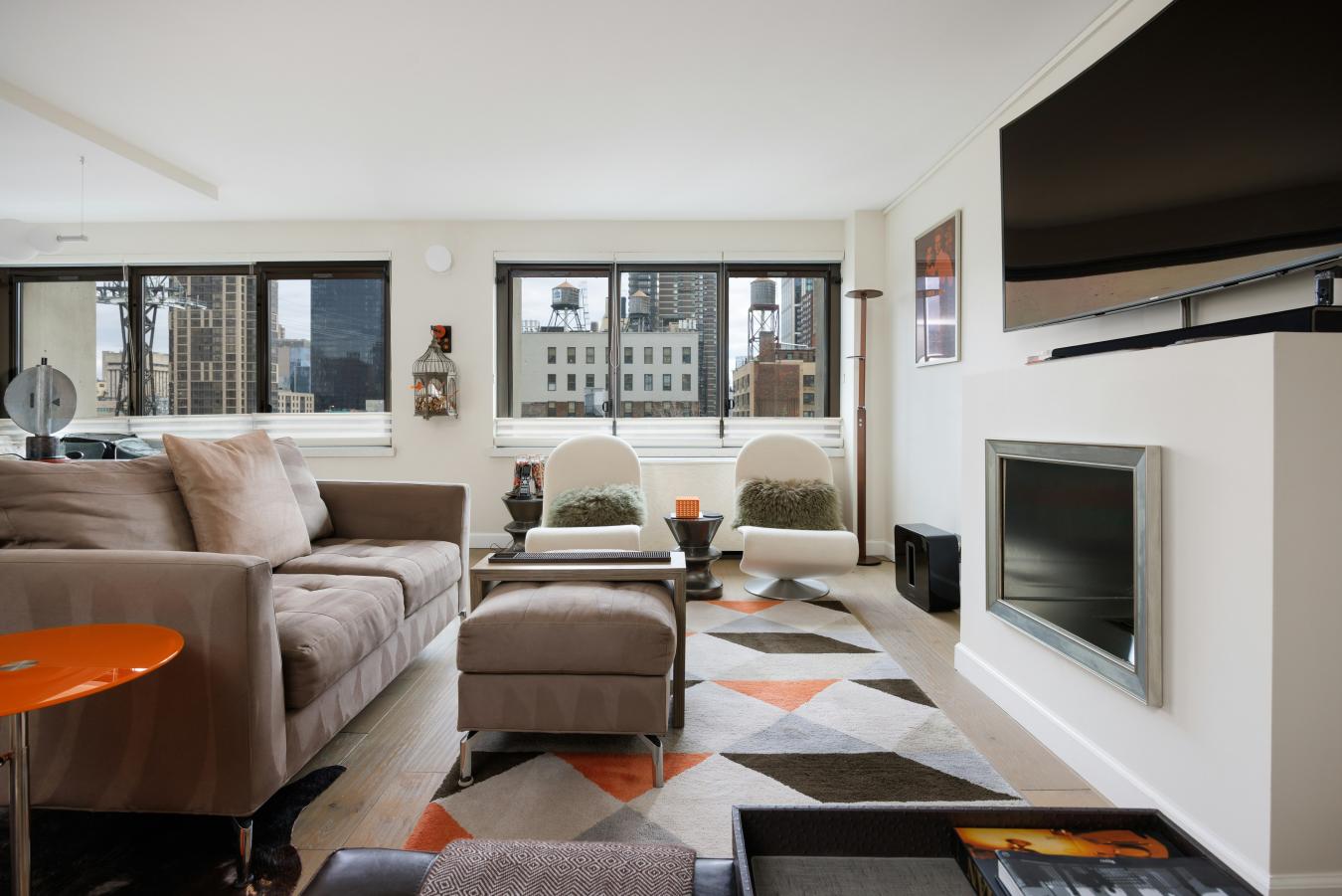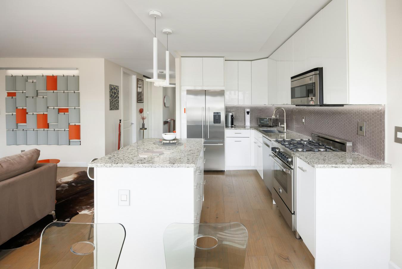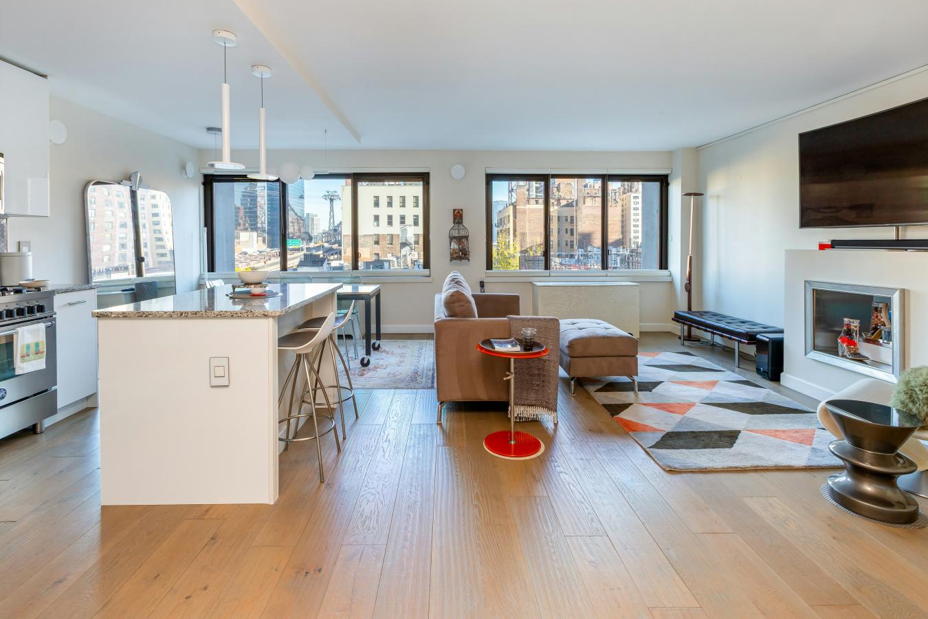 Iconic Bridge & Tram Views with a Versatile Bonus Room Residence 607 at The Landmark is a beautifully renovated home where refined design meets intuitive functionality. Thoughtfully curated and impeccably executed, this residence offers comfort, flexibility, and architectural distinction in the heart of the East Side. Though technically a one-bedroom, a generously scaled alcove provides remarkable versatility- effortlessly functioning as a second bedroom, private office, gym, or studio. A rare double-sided, clean-burning fireplace- framed in a metallic, heat-treated wood surround serves as a striking architectural focal point, seamlessly connecting the living area and primary suite. The sleek, contemporary kitchen pairs crisp white cabinetry and a matte tile backsplash with thoughtfully integrated storage and premium appliances, including a Bertazzoni gas range, Fisher & Paykel refrigerator, and Bosch dishwasher. Island seating for two allows the space to transition naturally from chefs workspace to inviting setting for morning coffee or relaxed entertaining. The tranquil primary suite feels both serene and expansive, featuring paneled walls, motorized Hunter Douglas shades, and a customized walk-in closet. The en-suite bath is elegantly appointed with dual marble-topped vanities, a glass-enclosed shower, and a towel warmer. Just off the flexible bonus room- currently outfitted with custom Italian Murphy-style bunk beds- a second full bath includes a deep Duravit soaking tub. Additional upgrades include Caesarstone window sills, quiet double-pane windows, custom PTAC covers, eight-foot doors, hands-free lighting, and abundant storage throughout. Residents enjoy one of the East Sides most beautifully landscaped roof decks, along with a modern lobby, on-floor laundry, and direct garage access with Zipcar. Two pets welcome. With buses at your doorstep and multiple subway lines, Whole Foods, and Trader Joes just blocks away, Residence 607 offers sophisticated interiors paired with seamless city convenience.