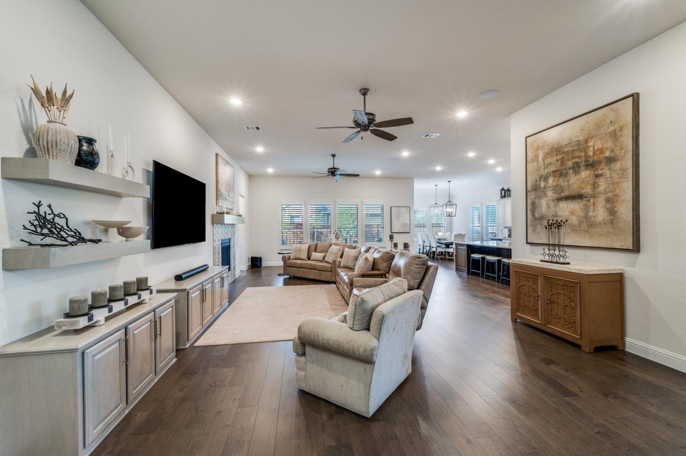 Welcome to 2729 Ashford, a beautifully upgraded one-owner home situated on an oversized corner lot in the exclusive Waterford Point village of The Tribute. Thoughtfully designed and meticulously maintained, this stunning residence offers 3 bedrooms, all with ensuite baths, a half bath for guests, a dedicated office, spacious living areas, and a 3-car garage. Rich engineered wood floors flow throughout the main living spaces, including the kitchen, office, primary suite, and powder bath, complemented by custom lighting, plantation shutters, blackout shades in the primary bedroom, and a surround sound system. The chefs kitchen features an oversized island with solid slab granite, two-tone cabinetry, a built-in wine cooler, a Blanco sink, soft-close cabinetry and drawers, and a custom California Closet pantry. The dining area was structurally expanded to create a more open layout for entertaining. The family room showcases a fireplace with upgraded tile surround, a custom mantle, built-in cabinetry, and surround sound. The private primary suite offers a tray ceiling and custom bath with added vanity, walk-in shower with upgraded tile and bench, large soaking tub, and custom California Closet system. Additional upgrades include an expanded laundry room with custom cabinetry, a custom office with built-ins and a double-sided desk, ensuite secondary bedrooms with upgraded cabinetry and California Closet systems, epoxy garage floors with built-in shelving, 8-foot garage doors, and a whole house Culligan water system with reverse osmosis and a softener. The landscaped yard features stone-bordered beds, uplighting, and an extended travertine patio with outdoor speakers and a remote screen for year-round outdoor living. Located in Waterford Point within The Tribute, residents enjoy access to two award-winning golf courses, miles of scenic trails, resort pools, and pickleball courts. A new marina is opening this year with 400 boat slips and a lakeside cafe, with 400 additional slips planned in 2027.