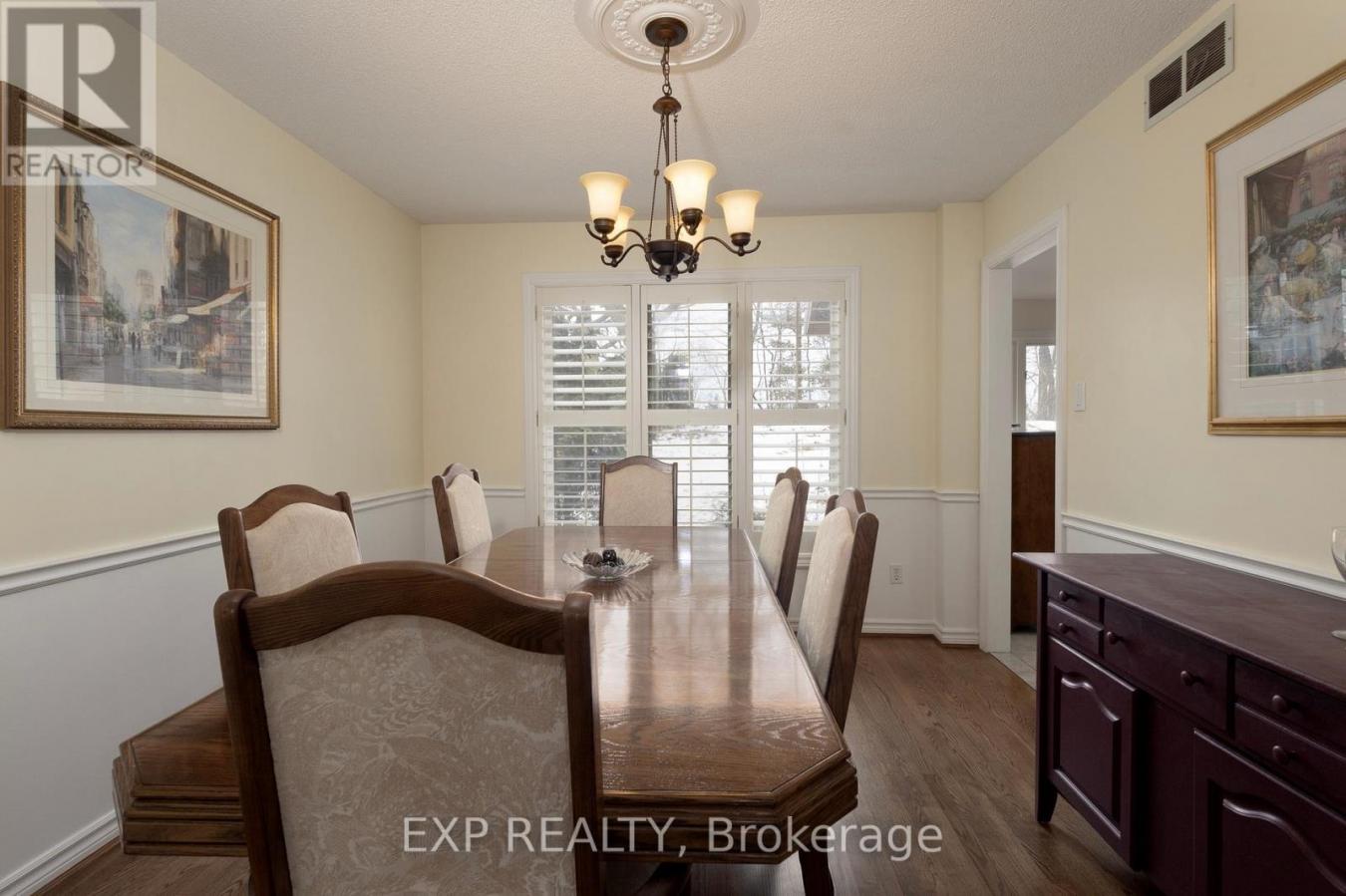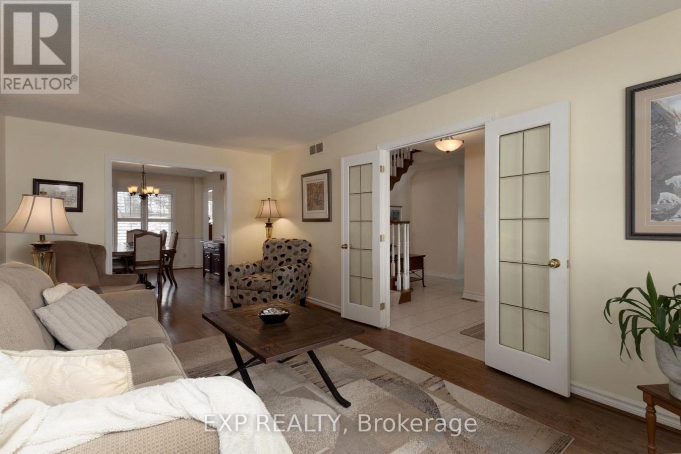 Welcome to this beautifully maintained home on a quiet street with friendly neighbours, backing onto the Mill Pond with seasonal water views and stunning sunsets. The large front porch is the perfect place to relax and take in the peaceful surroundings, while the private backyard offers a composite deck, patio behind the garage, hot tub (as is), irrigation system, and mature landscaping with cedar, hedges, bushes, and perennials. Inside, elegant French doors open to a bright living room, where rich hardwood flooring flows seamlessly into a spacious formal dining room. The refreshed kitchen features stainless steel appliances with a built-in microwave, quartz countertops, an updated backsplash, sink, and cabinet doors, while ceramic tile flooring continues into the laundry room. A cozy family room with a wood-burning fireplace and a convenient 2-piece bath complete the main level. The second floor offers four spacious bedrooms, all with hardwood flooring, a main 4-piece bath, and a primary retreat with walk-in closet and beautifully renovated 5-piece ensuite featuring a soaker tub, double sink vanity, and separate shower. The fully finished basement adds excellent living space with a large, open-concept recreation room, an additional bedroom, office area, workshop/hobby room, fruit cellar, and enlarged basement windows for natural light. An exercise room provides potential to convert into a spacious bathroom with ensuite privileges. Additional highlights include an owned water softener. Enjoy a spacious cement driveway accommodating six cars plus a two-car garage. Notable updates include the kitchen refresh (2018), primary ensuite renovation (2019), bathroom fixture updates (2020), finished basement with enlarged windows (2022), new furnace and water heater (2024), and garage door mechanism replacement (2025). A wonderful opportunity to enjoy space, privacy, and thoughtful updates in a beautiful natural setting. (id:58753)