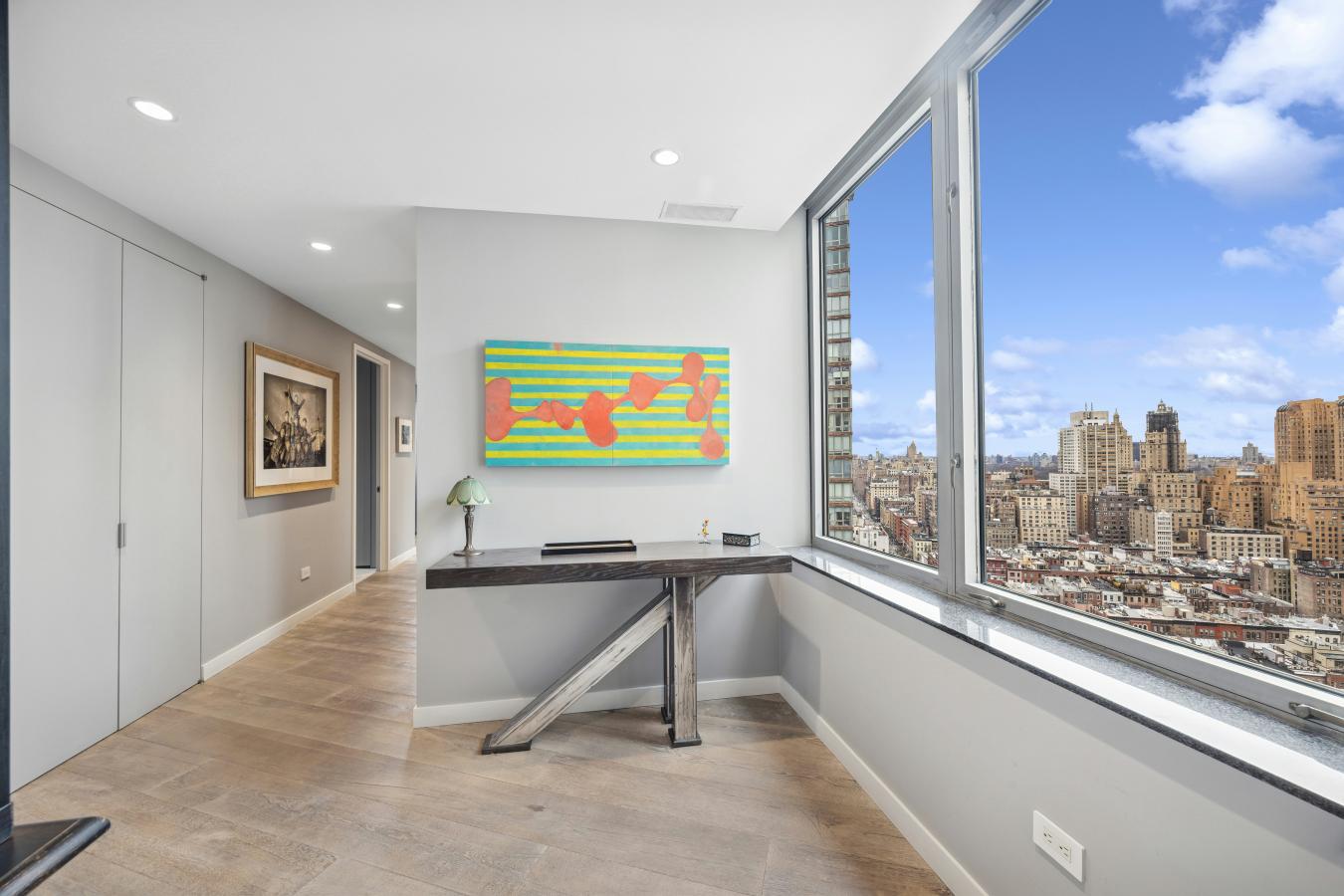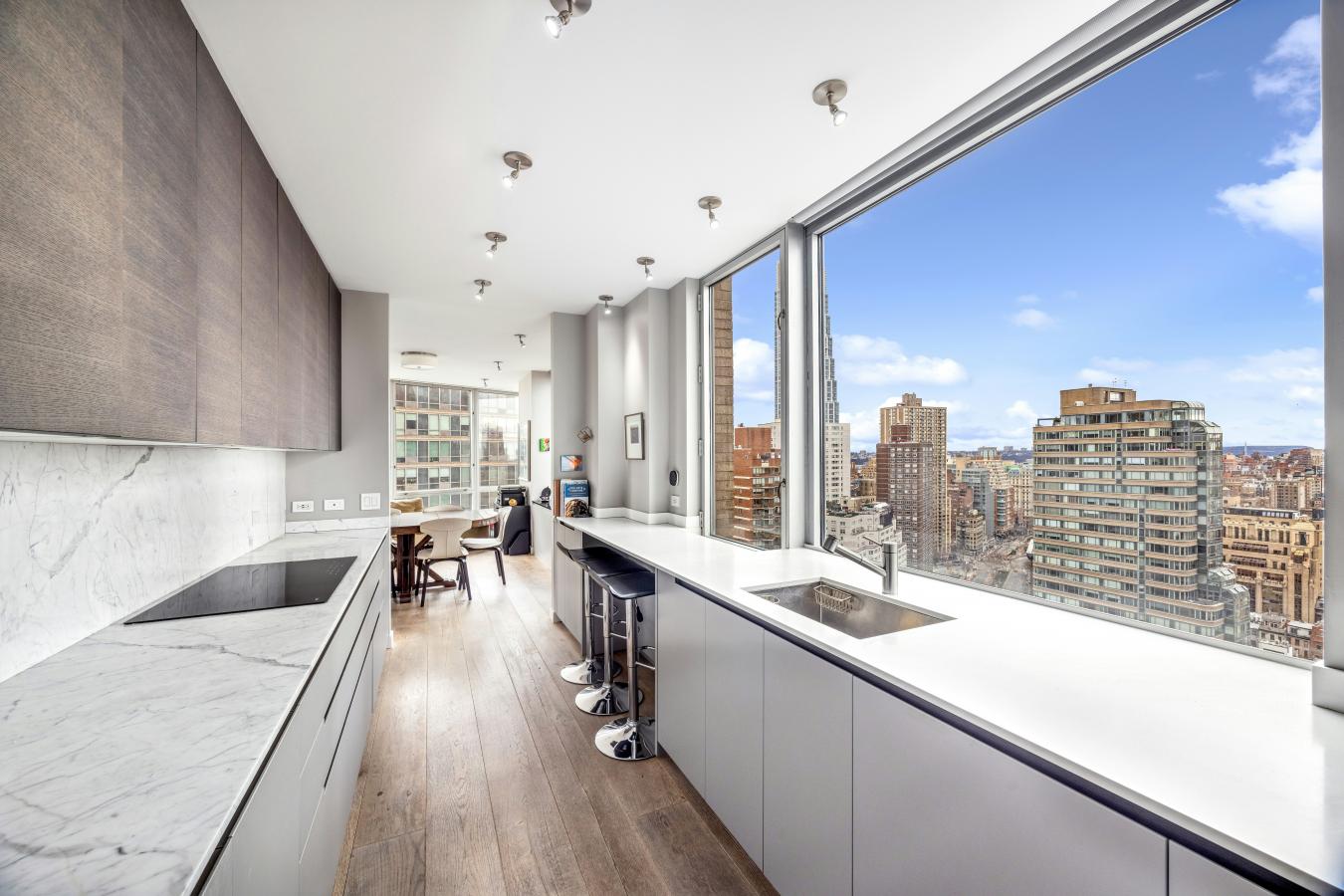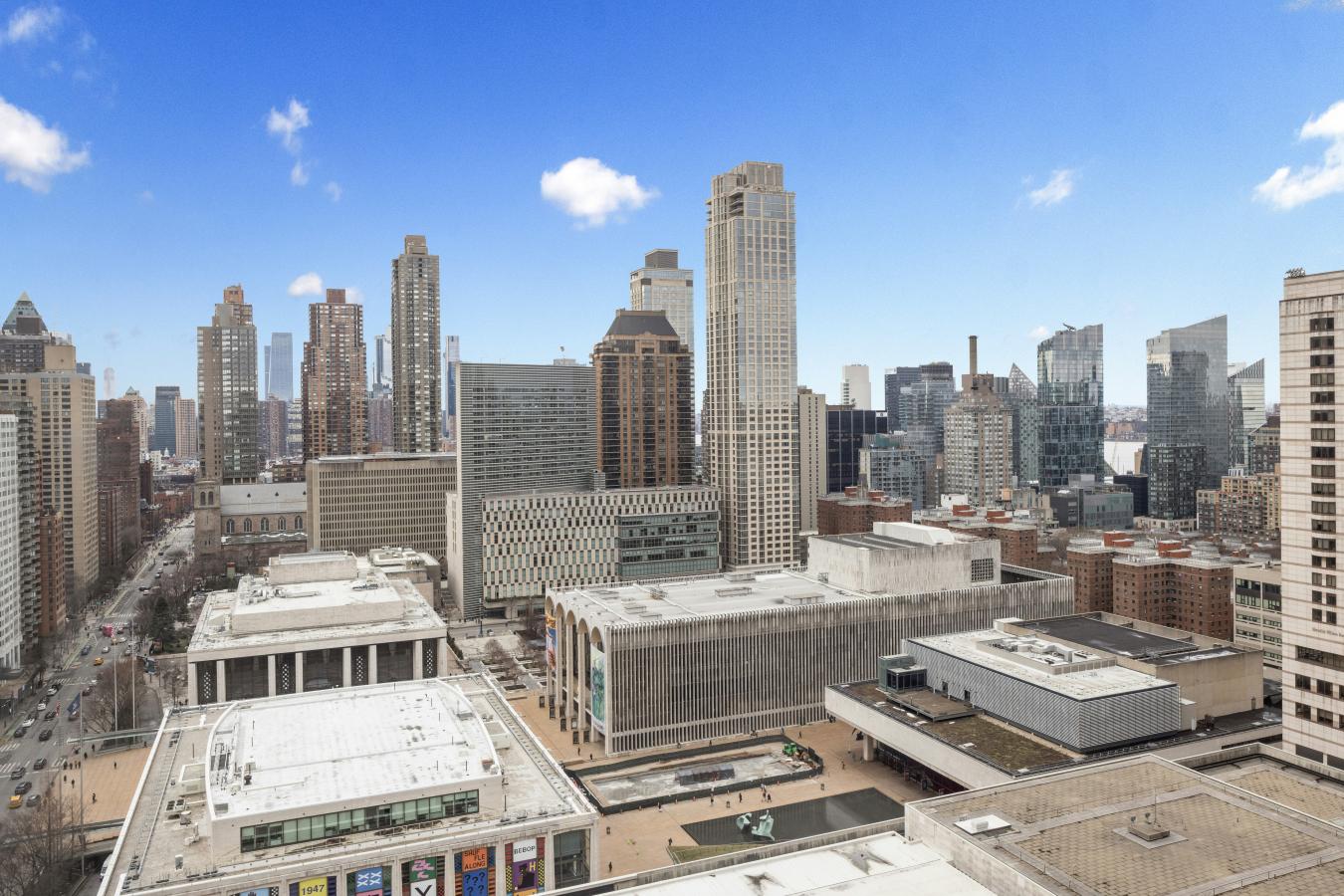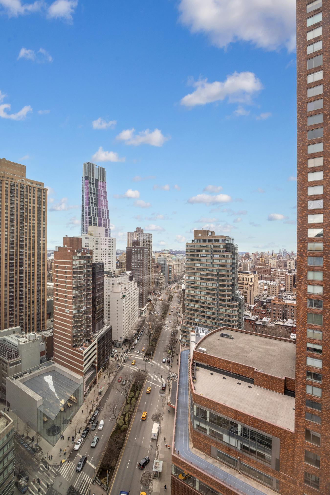 A DIAMOND IN THE SKY Residence 26A at 150 Columbus Avenue rises high above Lincoln Center, boasting sweeping views from One World Trade Center to the GW Bridge to Central Park. Perfectly positioned in the cultural heart of the Upper West Side and steps from world-famous restaurants and shops, this pristine two-bedroom, two-and-a-half-bath condominium offers panoramic skyline vistas from every room through expansive floor-to-ceiling windows with north, south and east exposures. A gracious, windowed foyer opens to a thoughtfully designed split-bedroom layout with the option of a convertible 3rd bedroom. The expansive living and dining room are bathed in natural light while the nighttime skyline provides a breathtaking backdrop for entertaining. The sleek chefs kitchen with stunning 180-degree views is beautifully appointed with custom Varenna/Poliform cabinetry, Corian and Statuarietto marble countertops and backsplash. It boasts a full suite of Sub-Zero and Wolf appliances, including state of the art induction cooktop, steam-convection oven, wall oven and an 86-bottle wine refrigerator. The serene primary suite features extensive custom-fitted Poliform closets and a spa-caliber five-fixture marble bath with double vanity and glass-enclosed shower. The secondary bedroom enjoys open city and Central Park views, exquisite built-ins and its own en-suite bath with soaking tub and floor to ceiling Italian marble tile. Additional highlights include 10-inch European White Oak floors, radiant-heated bathroom tile floors, motorized solar and blackout shades throughout, integrated LED lighting, abundant custom storage and built-in bar, windowed powder room and a vented washer/dryer. Just one block from Central Park and at the gateway to Lincoln Center for the Performing Arts, this pet-friendly condominium is reknowned for its superb 24-hour doorman and concierge service. Also known as One Lincoln Plaza, the building is situated at the crossroads of bus and subway lines that can transport you to anywhere in Manhattan in just 20 minutes.