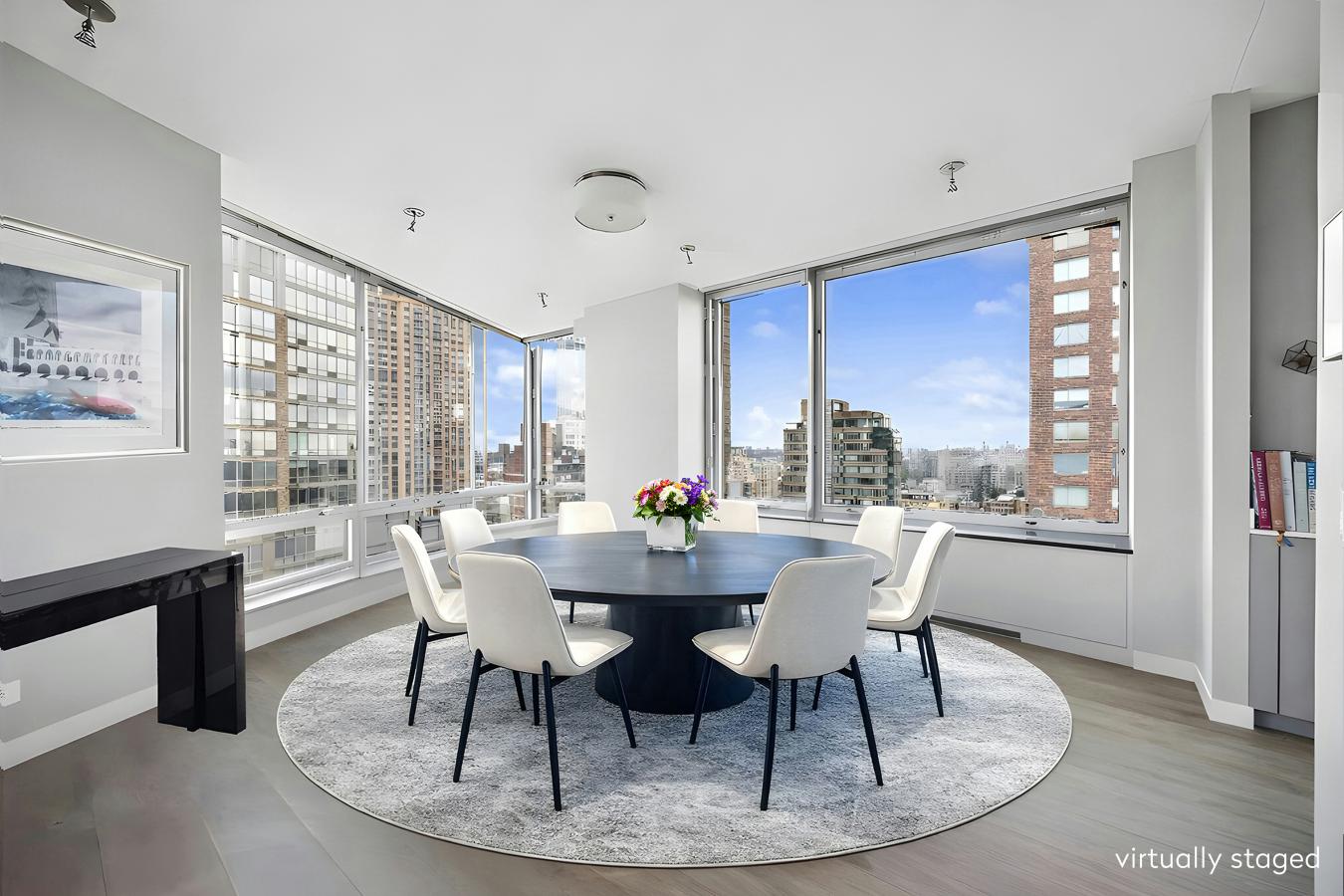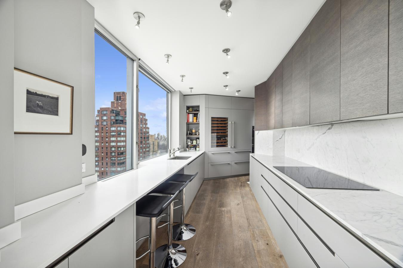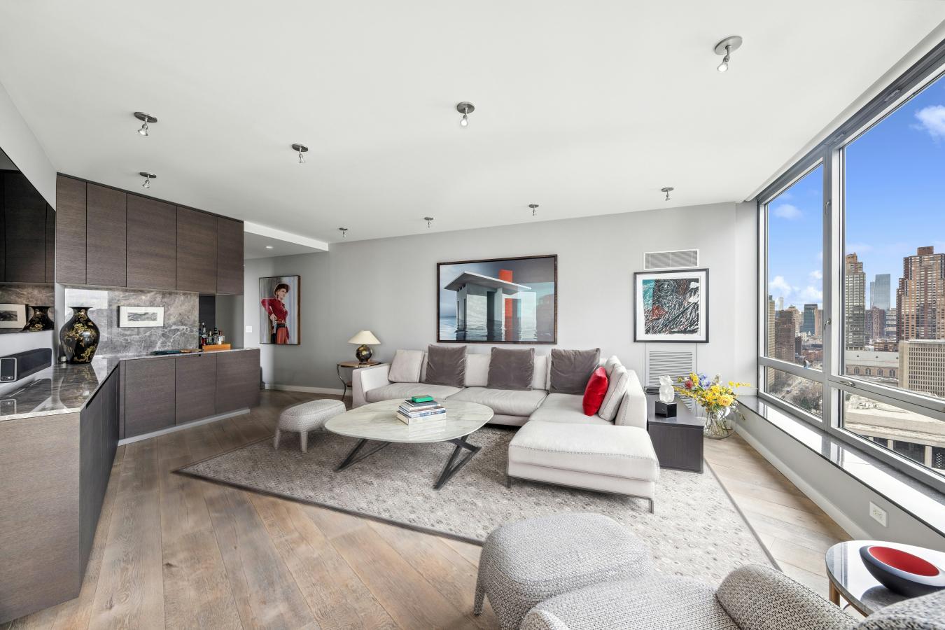 A DIAMOND IN THE SKY Residence 26A at 150 Columbus Avenue rises high above Lincoln Center, boasting sweeping views from One World Trade Center to the GW Bridge to Central Park. Perfectly positioned in the cultural heart of the Upper West Side and steps from world-famous restaurants and shops, this pristine two-bedroom, two-and-a-half-bath condominium offers panoramic skyline vistas from every room through expansive floor-to-ceiling windows with north, south and east exposures. A gracious, windowed foyer opens to a thoughtfully designed split-bedroom layout with the option of a convertible 3rd bedroom. The expansive living and dining room are bathed in natural light while the nighttime skyline provides a breathtaking backdrop for entertaining. The sleek chefs kitchen with stunning 180-degree views is beautifully appointed with custom Varenna/Poliform cabinetry, Corian and Statuarietto marble countertops and backsplash. It boasts a full suite of Sub-Zero and Wolf appliances, including state of the art induction cooktop, steam-convection oven, wall oven and an 86-bottle wine refrigerator. The serene primary suite features extensive custom-fitted Poliform closets and a spa-caliber five-fixture marble bath with double vanity and glass-enclosed shower. The secondary bedroom enjoys open city and Central Park views, exquisite built-ins and its own en-suite bath with soaking tub and floor to ceiling Italian marble tile. Additional highlights include 10-inch European White Oak floors, radiant-heated bathroom tile floors, motorized solar and blackout shades throughout, integrated LED lighting, abundant custom storage and built-in bar, windowed powder room and a vented washer/dryer. Just one block from Central Park and at the gateway to Lincoln Center for the Performing Arts, this pet-friendly condominium is reknowned for its superb 24-hour doorman and concierge service. Also known as One Lincoln Plaza, the building is situated at the crossroads of bus and subway lines that can transport you to anywhere in Manhattan in just 20 minutes.
