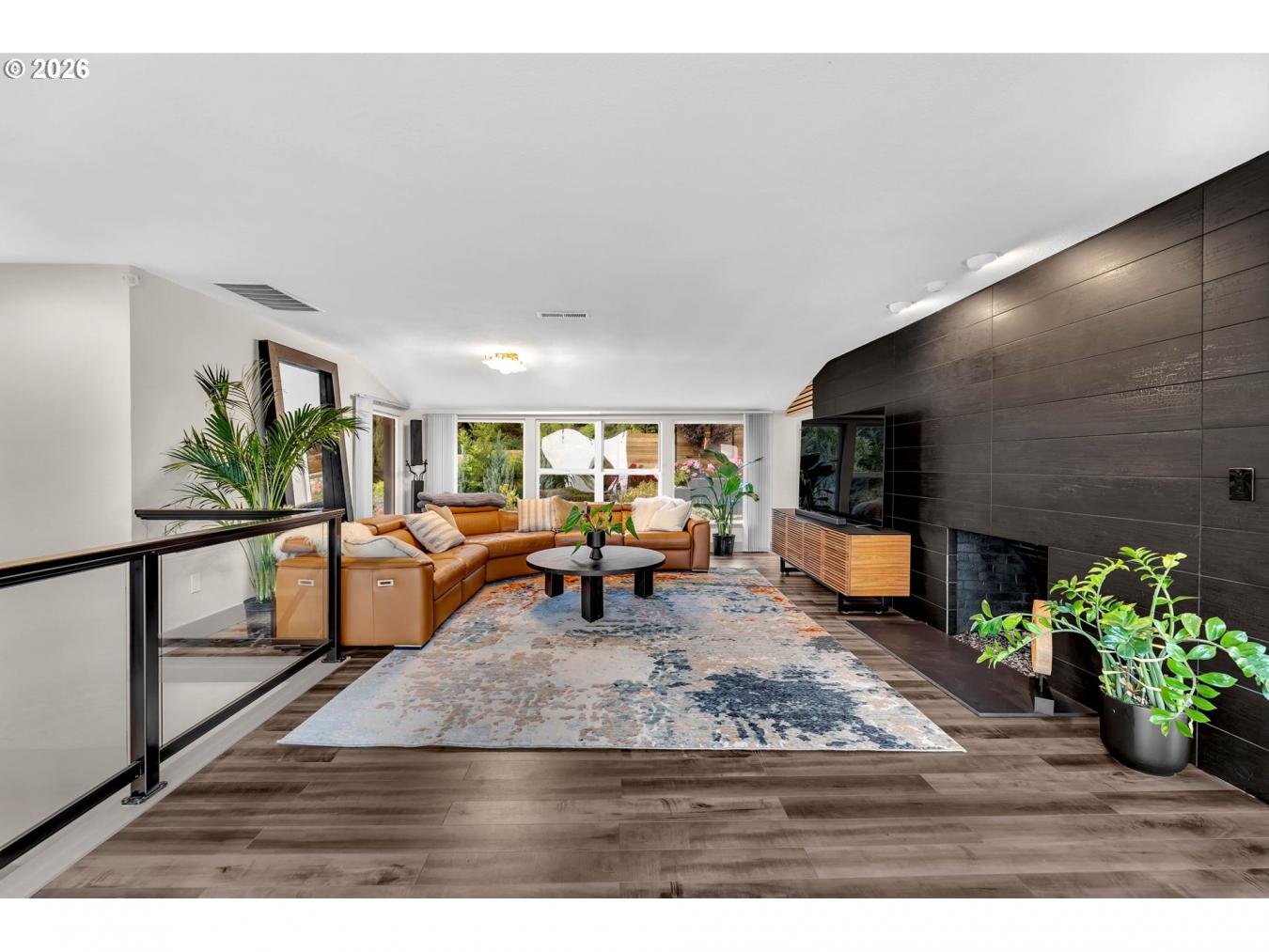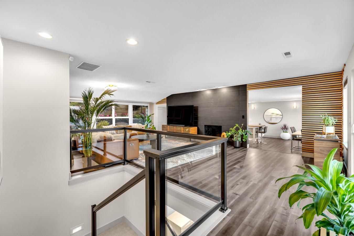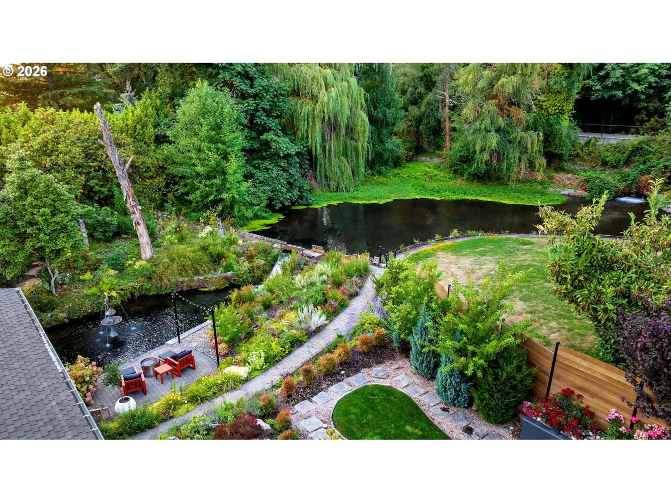 This 5003 sq ft Mid-Century Modern estate offers unparalleled luxury with breathtaking, unobstructed views of the Columbia River and Portland Airport visible from its expansive deck that provides both an open area for those warm nights and an enclosed heated area if needed. The reflective tint windows provide optimal privacy and UV protection. Nestled on a secluded cul-de-sac within a .67-acre lot, the property features a natural spring-fed pond with cascading waterfalls into the Columbia River, surrounded by lush rose gardens and fruit trees. The homes exterior is complemented by a 3-car extended garage and additional parking for up to 9 cars, ensuring ample space for family and guests. This exquisite home provides main-level living on each level. The main level provides 2 ensuite bedrooms, 2 laundry rooms, 3 fireplaces, and a hidden 13 x 13 pantry, all finished with high-end materials such as quartz countertops, stainless steel appliances, heated floors, towel racks, and floating/soft-close cabinetry. The lower level offers a versatile living space, perfect for multigenerational living or short-term rental, with 2 additional bedrooms, a full kitchen, an eating area, and family and living rooms, each with its own fireplace. This level also features its own entry and luxurious finishes similar to the main floor, along with a private observatory bridge overlooking the pond and waterfalls. Designed for comfort and flexibility, this home can accommodate extended family or serve as an income-generating property, with each level providing separate living quarters. Combining natural beauty with modern elegance, this property is a true Pacific Northwest retreat, ideal for those seeking a private oasis with the potential for rental income or a multigenerational living arrangement.