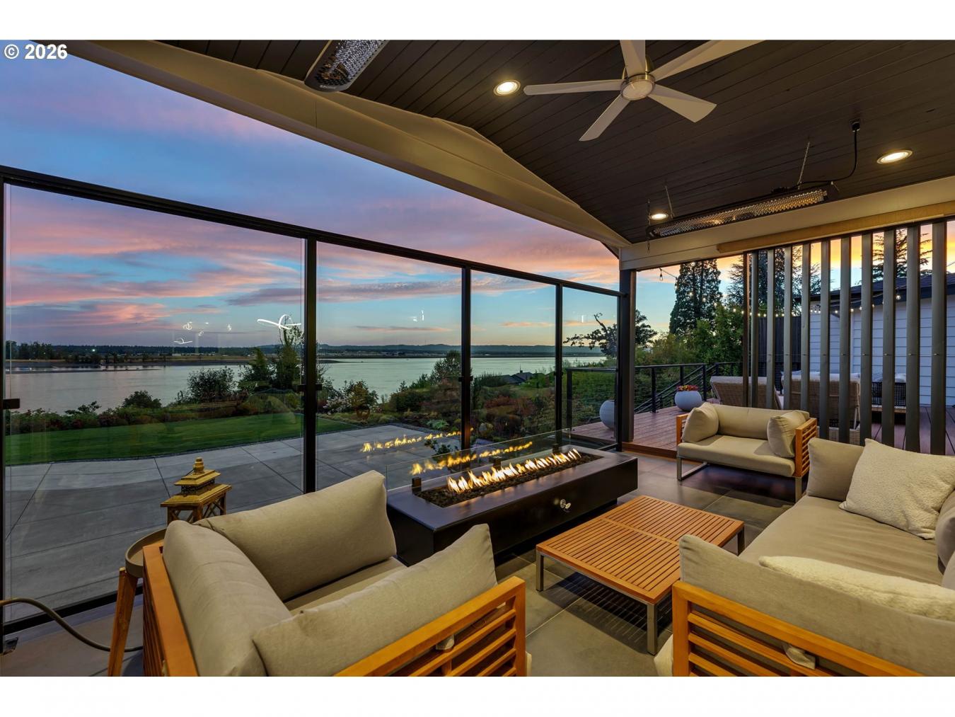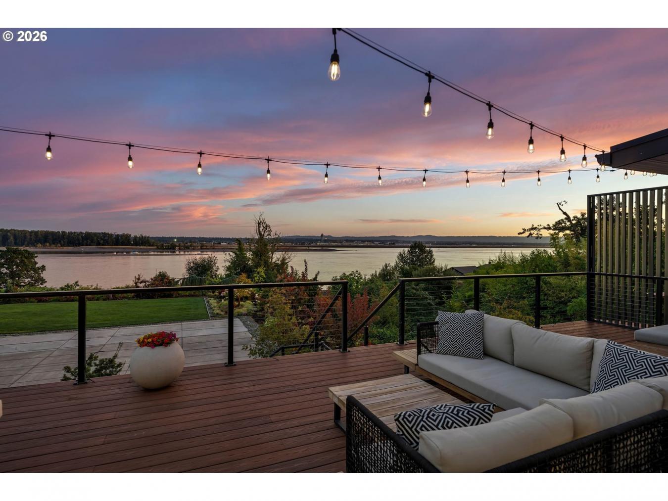 This 5003 sq ft Mid-Century Modern estate offers unparalleled luxury with breathtaking, unobstructed views of the Columbia River and Portland Airport visible from its expansive deck that provides both an open area for those warm nights and an enclosed heated area if needed. The reflective tint windows provide optimal privacy and UV protection. Nestled on a secluded cul-de-sac within a .