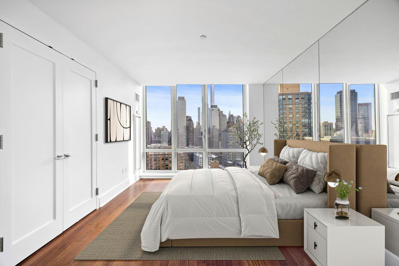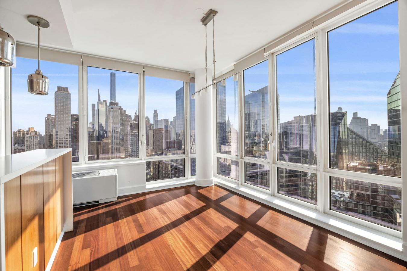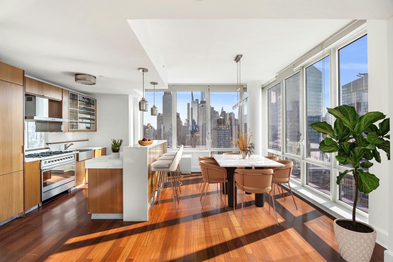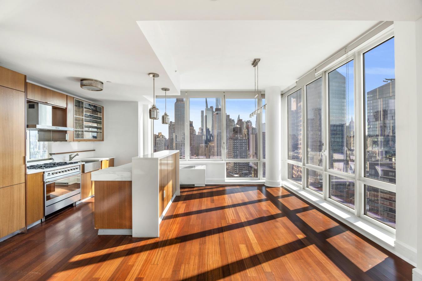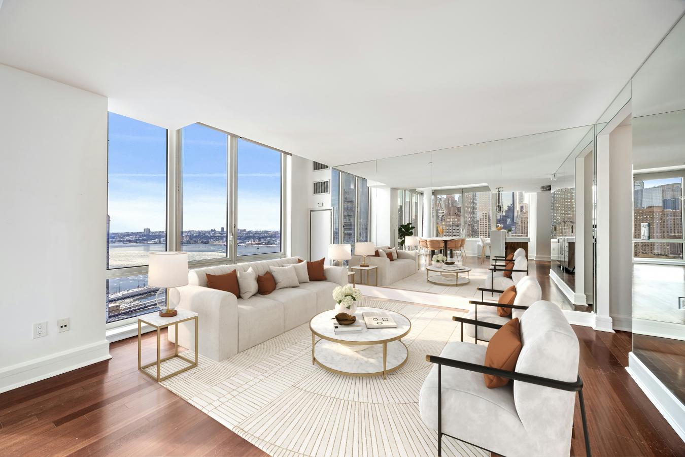 Unit 3004 at 60 Riverside Boulevard is a stunning corner home composed of two bedrooms and two-and-a-half bathrooms with picturesque open views stretching from the city skyline to the Hudson River. A spacious foyer perfectly separates the living spaces from the bedrooms, and is complete with a powder room and coat closet. As you walk in towards the joint living and dining area, you are greeted by an abundance of natural light and sweeping views thanks to the south and east facing floor-to-ceiling windows. Designed for both entertaining and everyday cooking, the open contemporary kitchen has an island with Blizzard Quartzite countertops that blend in naturally with the sleek teak cabinetry as well as top-of-the-line Miele and Smeg appliances. Both bedrooms face east and lay discreetly in a separate wing of the apartment, ensuring exceptional peace and privacy. The king-sized primary suite has three closets, one of which is a large and outfitted walk-in. The five-fixture ensuite primary bathroom has a double vanity done in Bianco Dolomite marble, a Zuma deep soaking bathtub, and a glass shower. The second bedroom is spacious and features an ensuite bathroom with custom crackle porcelain tile. There is an in-unit washer and dryer as well as central air throughout the home. A premier Extell property, The Aldyn is a luxury condominium on Riverside Boulevard offering one of the largest amenity packages in the city. Residents enjoy a state-of-the-art fitness center, spa facilities, a 75-foot indoor swimming pool, full-length basketball court, rock climbing wall, bowling alley, childrens playroom, private landscaped courtyard, and on-site parking. There is full-time doorman and concierge. The Lincoln Square neighborhood conveniently presents unlimited cultural, dining, and shopping offerings. Just outside your front door, Riverside Park South has recently completed a multi-phase revitalization, unveiling 27.5 acres of riverfront parkland with various esplanades, walking and bike paths, soccer field, handball and basketball courts, and more. Experience vibrant, waterfront living at 60 Riverside Boulevard.