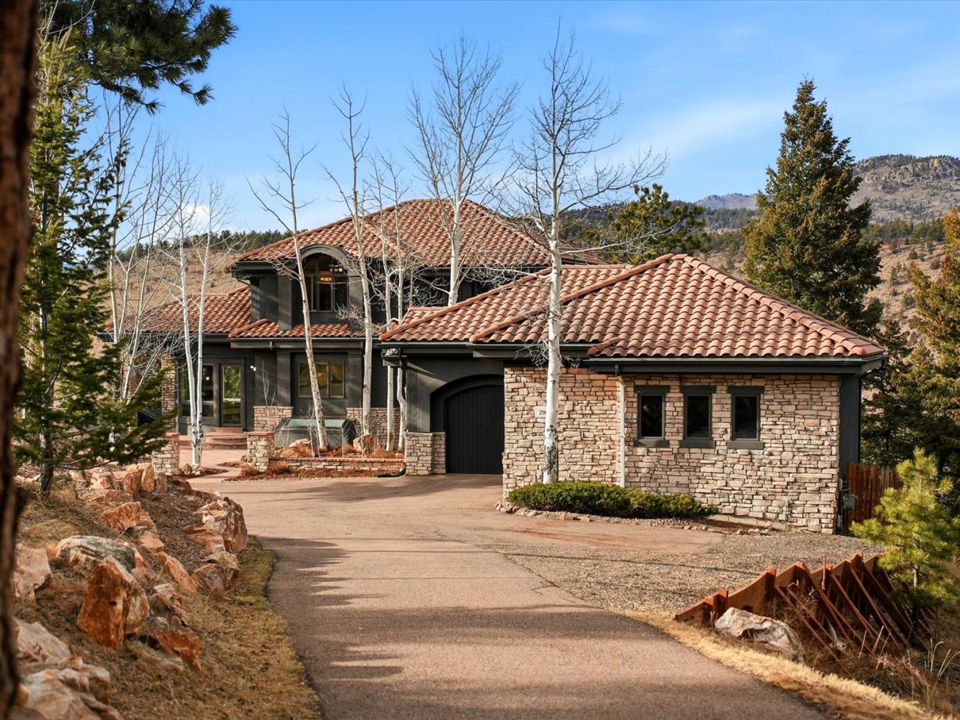 Top-of-the-World Views: Luxury, Privacy & Endless Colorado Skies. Perched atop 10 quiet, private acres in Evergreens exclusive Skyhill Estates, 290 Skyhill is one of just six homes in a gated enclave of prestigious 10-acre estates. Set at the end of the road with no visible neighbors, this 5,155 sq ft retreat offers panoramic views, soaring ceilings, Brazilian slate floors, and radiant in-floor heat throughout. Enjoy a new Sub-Zero fridge, updated kitchen, generator, water filtration RO, fiber Starlink internet, and buried on-site power lines to protect your views. Flexible spaces include a reading nook, TV room, and home office. Community tennis & pickleball. Just minutes to Denver, Golden, Evergreen, and ski resorts-yet a world apart. Inside, the thoughtfully designed space features soaring ceilings, dramatic windows, and slate flooring that frames mountain beauty from every room. The upper-level primary suite offers spectacular views, a renovated spa bath, and a walk-in closet. Downstairs, with soaring ceiling height and walkout light and windows, a large TV room/office, two bedrooms, and a built-in reading nook create flexible space for work or guests. Power outages? Not for you! A new generator keeps everything running. 290 Skyhill offers what few others can: luxury infrastructure, privacy without isolation, designer finishes, and unforgettable views-all in a coveted Evergreen location. Its the rare mountain home that checks every box-and exceeds expectations.