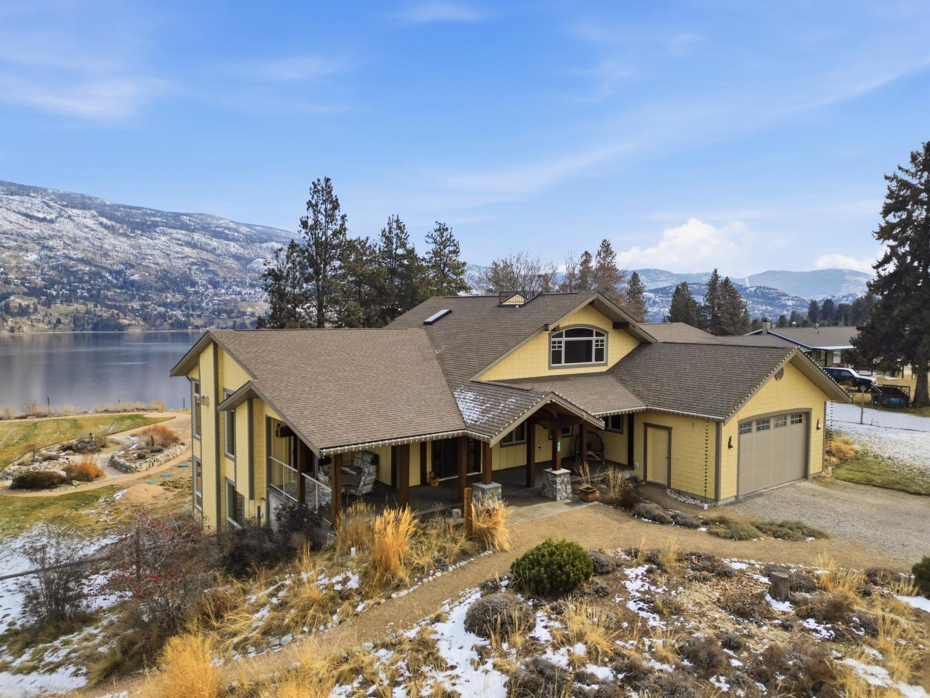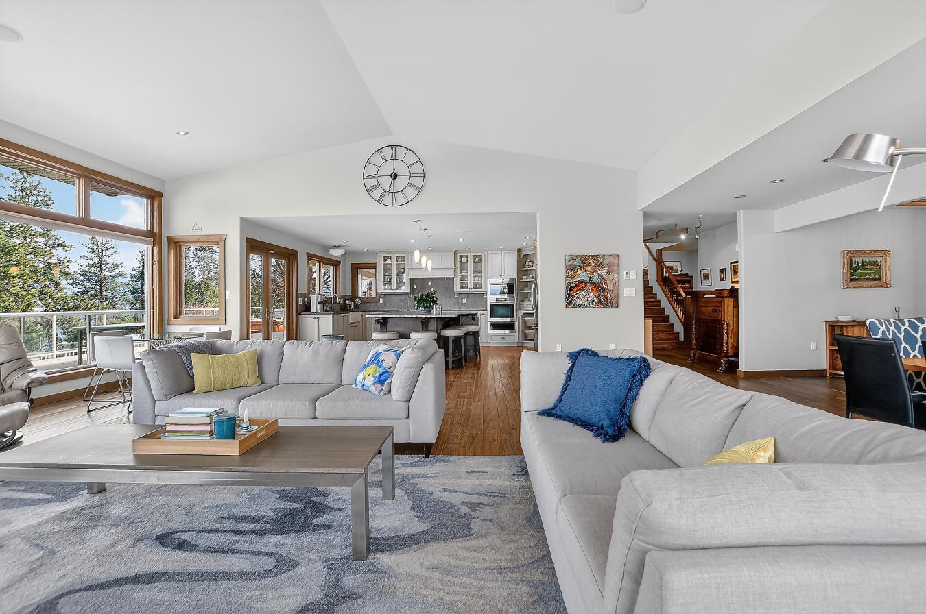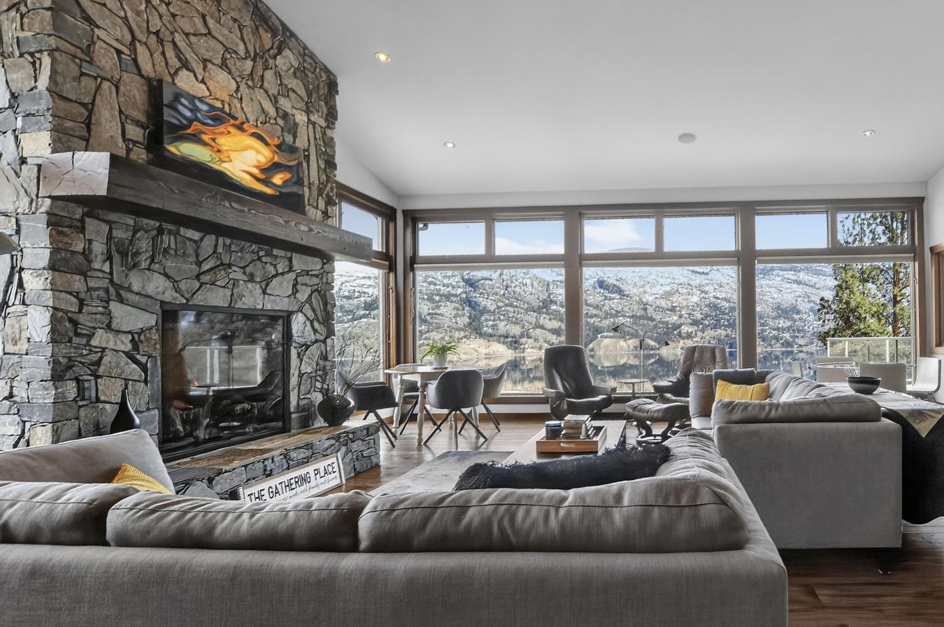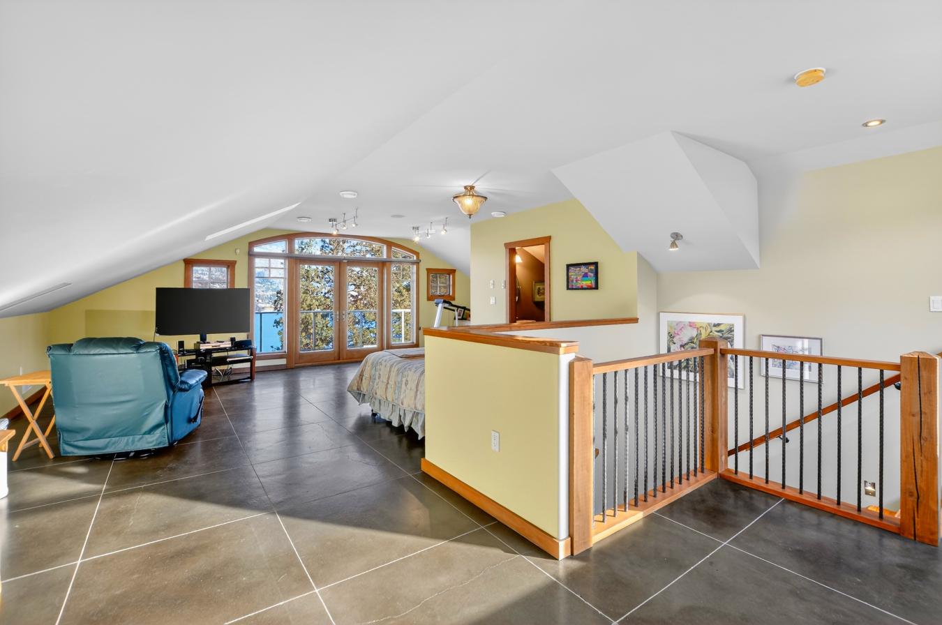 Set above Skaha Lake in Kaleden, next to the KVR Trail, this custom home is one of those properties people slow down to admire. It offers 7,000 sqft of living space with 5 baths, 4 bedrooms, plus an additional 2 bedrooms set up in the flex room on the main floor & the loft. With almost 2.5 acres, it has space to add features like a pool & a pool house. The covered front porch with its barrel-style ceiling flows right into the foyer. In the great room, the timber mantle & stone fireplace anchor the space, while the fir trim throughout adds elegance & shows that no expense was spared in building this home. The kitchen has a massive granite-topped island, Miele appliances, banquette seating, & direct access to the concrete stamped deck w/ glass railing for unobstructed views of nature. The primary suite is a retreat with French doors to a private sitting area, a two-way fireplace, and a renovated ensuite with a soaker tub. The loft is the perfect space for a bedroom or home office/art studio. The lower level adds a full kitchen, media room, games area, 3 bedrooms & storage. Excellent opportunity for a short-term rental setup. The detached 4-bay garage is a dream for hobbies, cars, or toys. ICF construction, geothermal, stamped concrete with radiant floor on all 3 levels. Step-free access on the main floor, wider interior hallways, and direct access to the backyard path, which leads to a magical viewpoint, add comfort and flexibility for new homeowners to age in place. (id:55532)