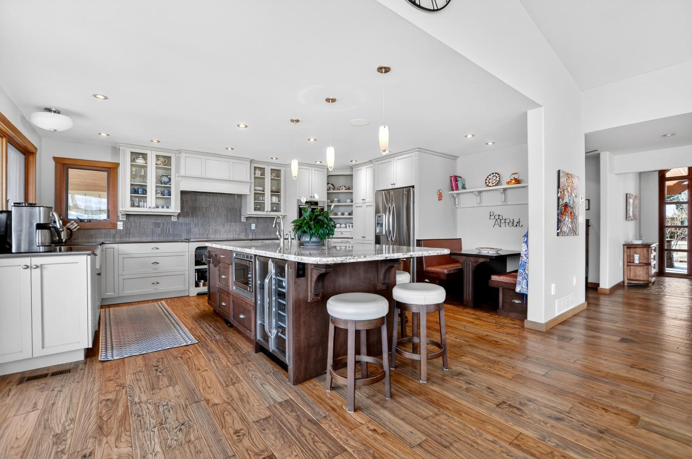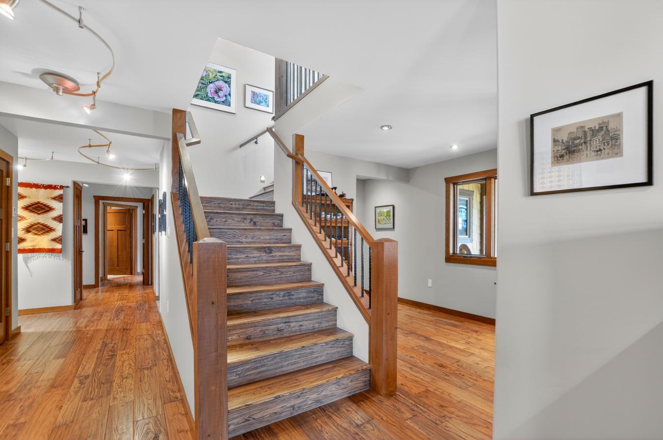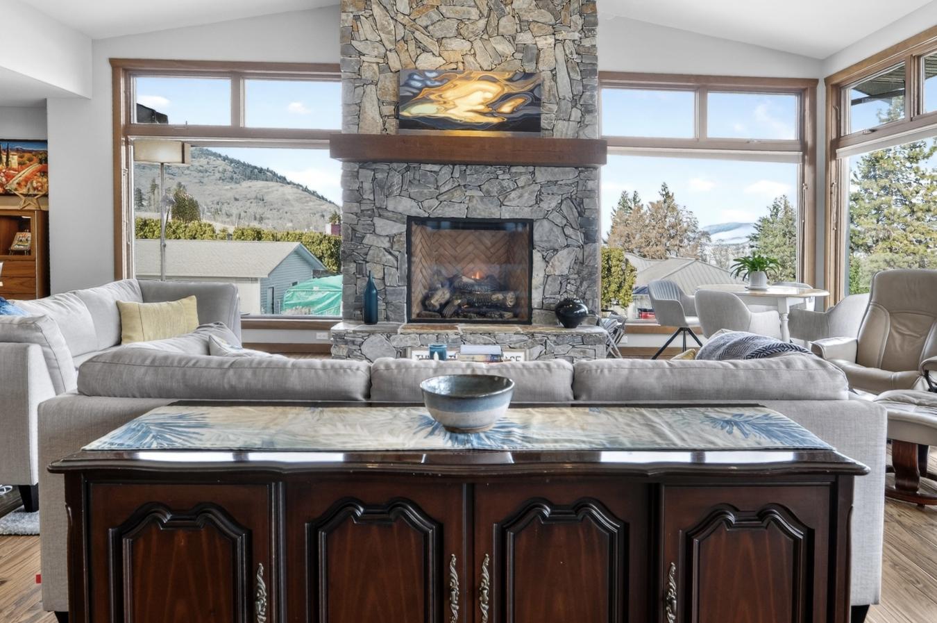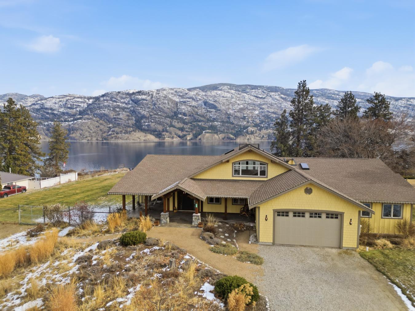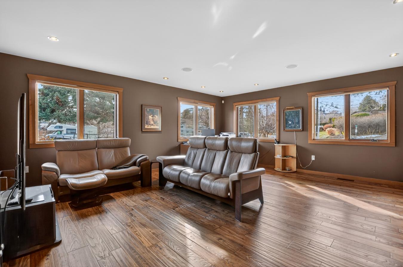 Set above Skaha Lake in Kaleden, next to the KVR Trail, this custom home is one of those properties people slow down to admire. It offers 7,000 sqft of living space with 5 baths, 4 bedrooms, plus an additional 2 bedrooms set up in the flex room on the main floor & the loft. With almost 2.5 acres, it has space to add features like a pool & a pool house. The covered front porch with its barrel-style ceiling flows right into the foyer. In the great room, the timber mantle & stone fireplace anchor the space, while the fir trim throughout adds elegance & shows that no expense was spared in building this home. The kitchen has a massive granite-topped island, Miele appliances, banquette seating, & direct access to the concrete stamped deck w/ glass railing for unobstructed views of nature. The primary suite is a retreat with French doors to a private sitting area, a two-way fireplace, and a renovated ensuite with a soaker tub. The loft is the perfect space for a bedroom or home office/art studio. The lower level adds a full kitchen, media room, games area, 3 bedrooms & storage. Excellent opportunity for a short-term rental setup. The detached 4-bay garage is a dream for hobbies, cars, or toys. ICF construction, geothermal, stamped concrete with radiant floor on all 3 levels. Step-free access on the main floor, wider interior hallways, and direct access to the backyard path, which leads to a magical viewpoint, add comfort and flexibility for new homeowners to age in place. (id:55532)