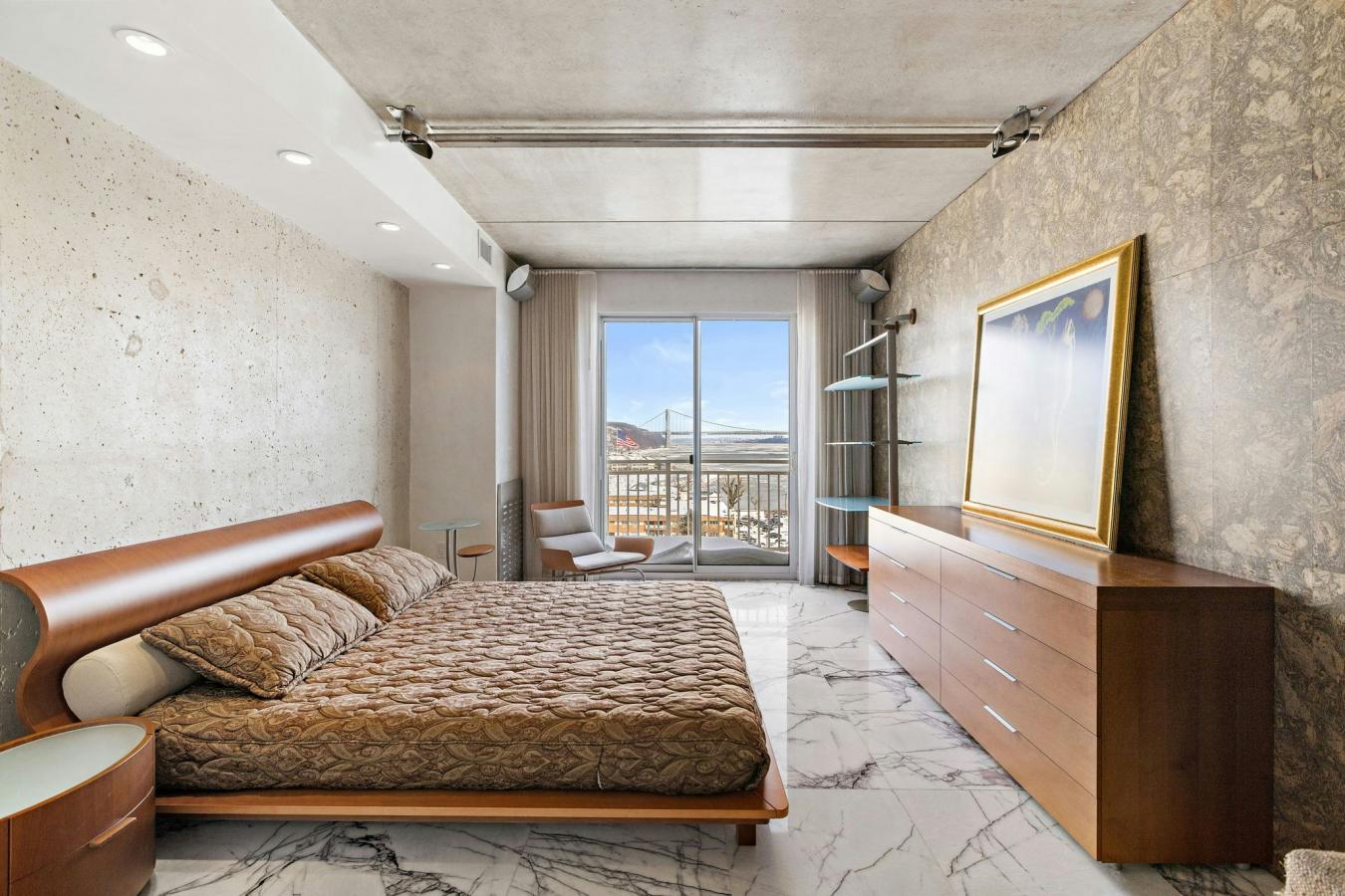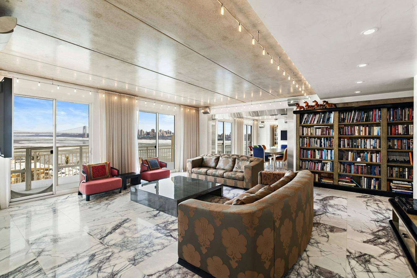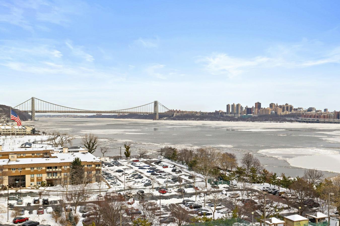 Welcome to this one-of-a-kind, sprawling penthouse located in the always desirable Admirals Walk building in Edgewater. Originally two separate units, the home underwent a high-end, gut-renovation combining the two units to create a total of 3042 ft. This meticulous renovation has created a unique home, with spectacular views of the George Washington Bridge, New York City and the Hudson River. Step inside and discover stunning views from every window, polished concrete and Venetian plaster ceilings, and radiant heated translucent marble flooring throughout. The center of the home is where you will find the custom chefs kitchen, featuring a commercial-grade Wolf oven and cooktop, Wolf convection microwave and stainless steel drawers and warming drawers, a Miele vented hood and dishwasher. The center island is complete with a Thinkglass bar top and a marble countertop, which leads to the expansive dining room and separate living room, both flooded with natural light from four floor-to-ceiling glass doors which open out to two separate balconies, providing stunning views of the George Washington Bridge and the Hudson River. The living room and dining room are book ended by double sided wood-burning fireplaces. Here you will also find a Butlers pantry, complete with custom Stainless steel cabinetry by Neff, a Miele coffee station, Kohler sink, sub zero wine fridge and custom coat closet. The primary bedroom suite offers a Custom Italian closet system, Bang and Olufsen audio and TV and access to your private balcony. The spa-like primary bathroom features a custom double vanity, glass countertops, wall-mounted, Kohler sinks, a separate steam shower with glass enclosure, an effervescent, chromotherapy infinity bathtub. Within the primary suite there is also a separate dressing area with custom closets, access to the balcony and a fireplace. This can be used as a separate nursery or den/office. Adjacent to the dining area is where you will find a large custom office, which can easily be converted to a third bedroom and a powder room with a custom cast iron sink. The second bedroom has custom Italian closets an en-suite bathroom with a glass enclosed shower, a separate make up stand and its own private entrance to the balconies. Integrated Lutron lighting system and a Bang and Olufsen audio system throughout the home. A total of eight zones of radiant heat and four separate HVAC zones. Every inch of this spectacular residence has been thoughtfully renovated with vision and incredible attention to detail. Admirals walk is a professionally managed, waterfront community. Enjoy low taxes in this amenity-rich building, offering a gated entry with a security guard, 24 hour doorman, two tennis courts, a basketball court, an outdoor pool, a pavilion with a community room and fitness center. Your HOA includes all amenities, internet, premium streaming cable and water. Ideally located, less than a five minute walk from the ferry to New York City which means you can be in NYC in 11 minutes, and 2 blocks to Whole Foods and Veterans Park. Penthouse 8 is complete with a total of 3 parking spots, 2 assigned premium outdoor spots by the entrance and deeded covered parking spot in the garage. Yes, you truly can have it all!
