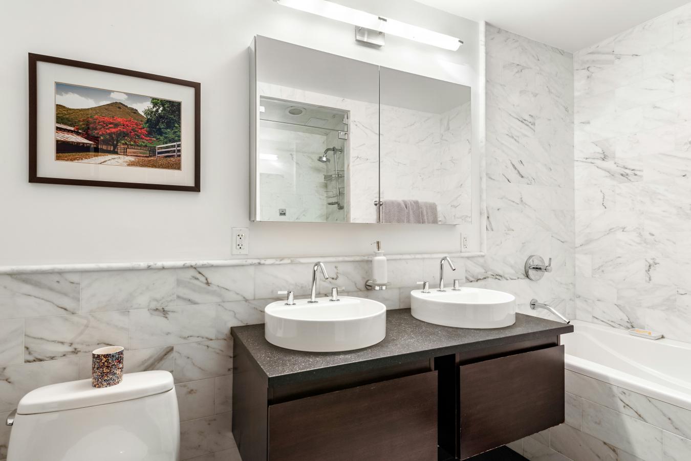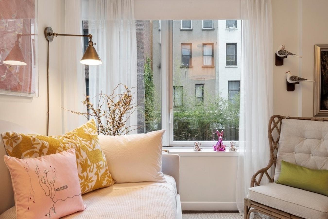 Upon entering this elevated first floor, garden-facing, renovated and move-in ready 3 bedroom and 2.5 bath condominium, one is immediately struck by the sunny corner views facing quiet gardens and greenery. The separate entrance foyer has 3 generous closets, an LG washer and dryer, and a beautifully renovated powder room. The gorgeous open square shaped kitchen with stunning light wood paneling is a chefs delight, and has top of the line appliances, a huge breakfast bar, wine fridge, and plenty of storage. The living room is spacious, and accommodates large dining and seating areas that, coupled with the adjacent kitchen, lends itself to entertaining or relaxing in total luxury! All three quiet and bright bedrooms are large and have excellent closet space. The views are lovely and enveloped by trees. The primary bedroom is oversized with 2 walk-in closets and a marble 5 fixture en-suite bath with double sinks and a separate tub and shower. Other features include 9 high ceilings, beautiful high gloss hardwood floors throughout, 8 closets including that increasingly rare linen closet, central air-conditioning, large white framed windows, and motorized blinds. Hudson Hill Condominium has a full time doorman, fitness center, garden, and bike room, and is pet friendly! Located by Clinton, Columbus Circle, and Central Park, residents enjoy the convenience of great shopping, restaurants and transportation. Flip Tax/ Transfer Fee is equal to two months of common charges paid by purchaser.