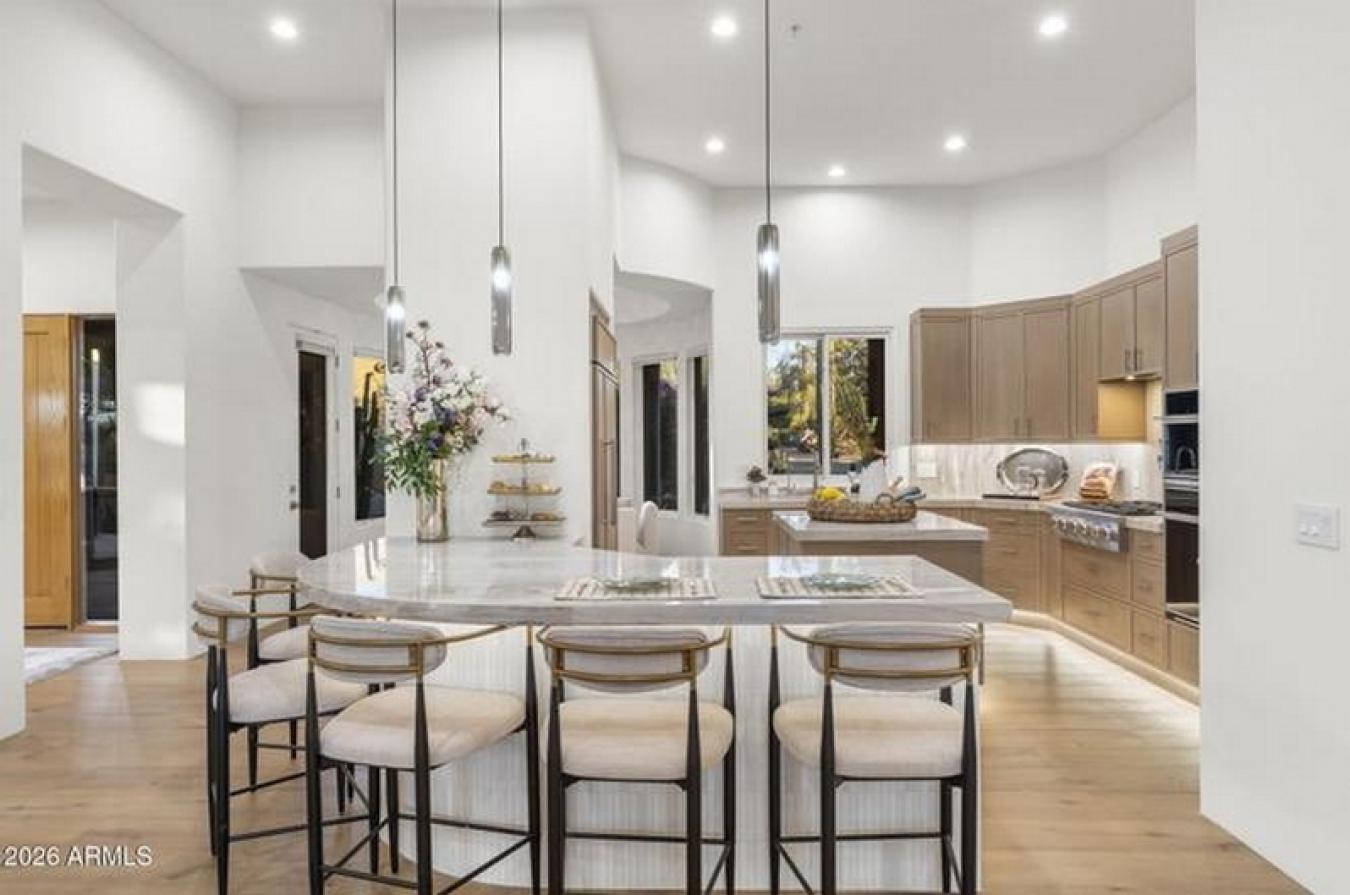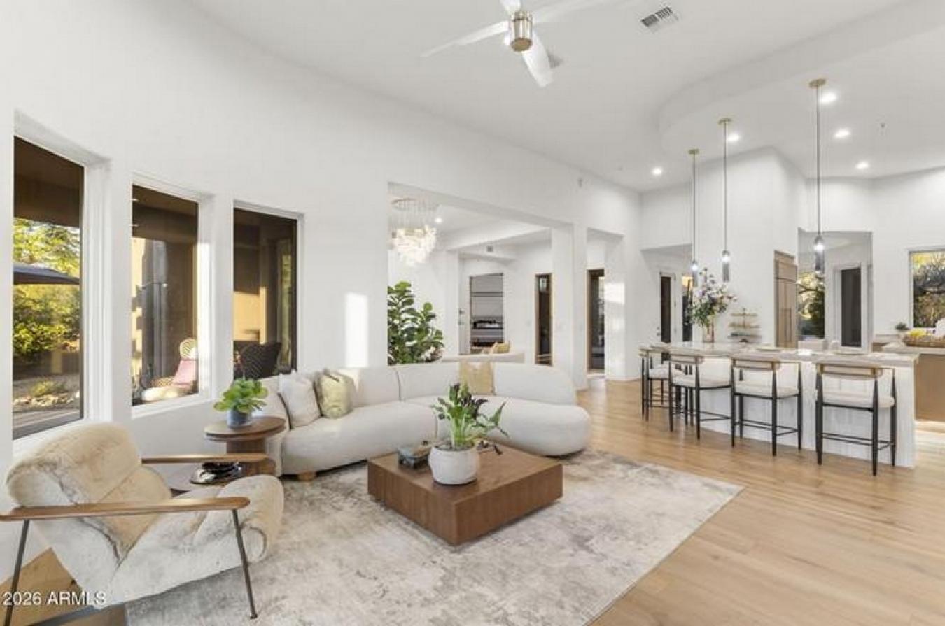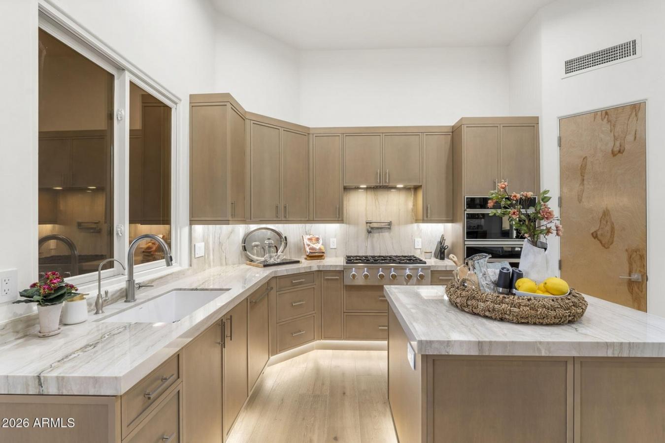 Nestled within the prestigious gated community of Troon, this beautifully remodeled home offers refined desert living with high-end finishes throughout. The chefs kitchen features striking quartzite countertops, custom cabinetry, and premium Monogram appliances, including a six-burner gas range and double ovens-perfect for entertaining.