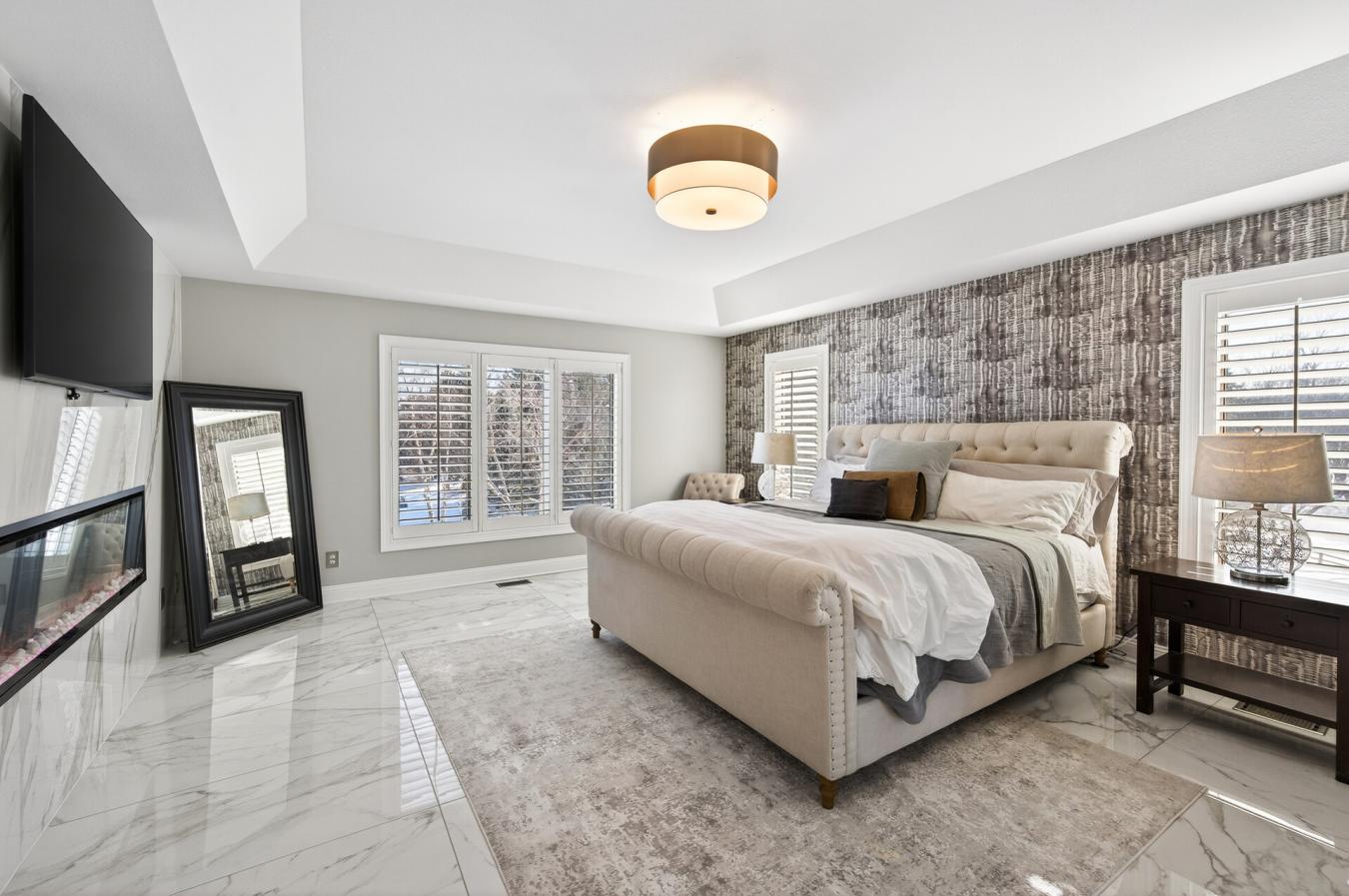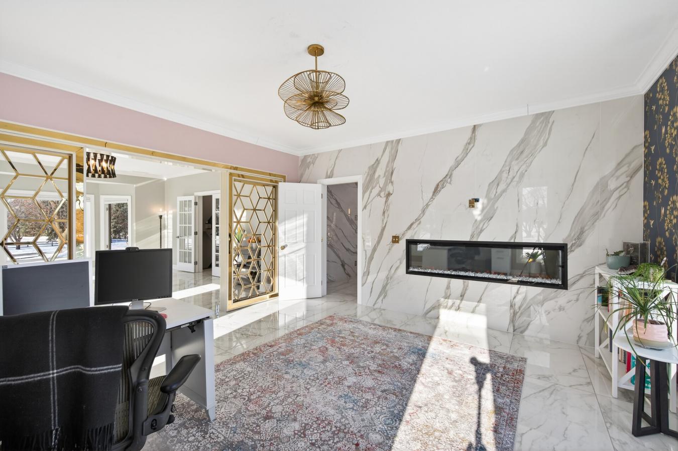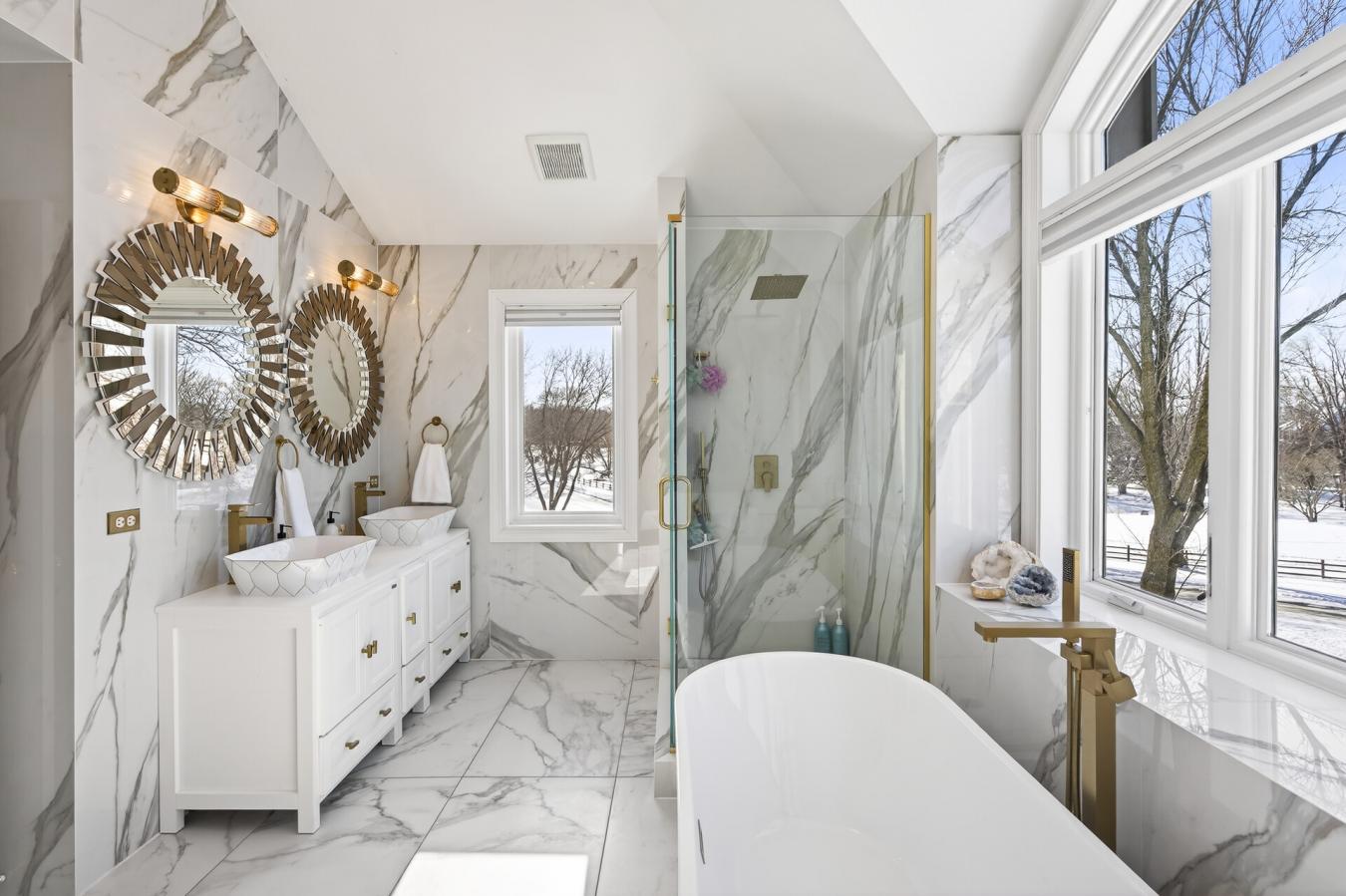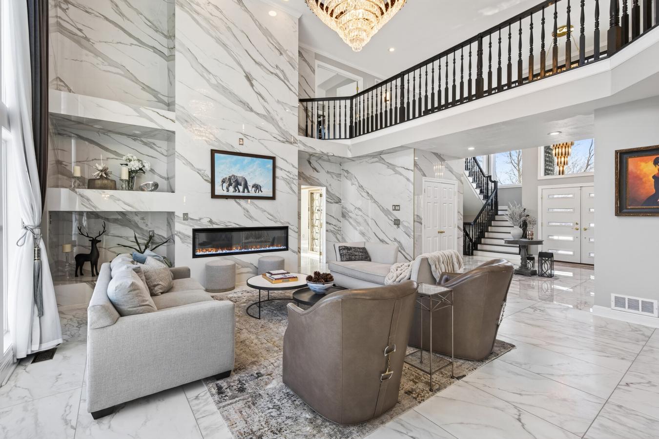 Welcome to this stunning 5-bedroom, 7-bathroom luxury home set on a private 2 acre lot in the highly sought-after Tuckborough Farms community. A circular driveway and stamped concrete walkways lead to the impressive brick-and-stone exterior. Inside, the grand foyer showcases soaring 18-foot ceilings, a statement chandelier, and marble floors throughout the main level. The dramatic family room features floor-to-ceiling windows, a double-sided electric fireplace with marble surround and custom shelving, and breathtaking backyard views. The chefs kitchen offers quartz and marble countertops, an expansive center island with breakfast bar seating, soft-close cabinetry, stainless steel appliances, and a high-end Wolf range and oven. The kitchen flows seamlessly into the informal dining area, sunroom, and expansive deck-ideal for indoor-outdoor entertaining. The main level also includes a formal dining room, private office with shared fireplace, elegant living room, two half bathrooms, laundry room, mudroom with cubbies, and access to the three-car garage with storage and workspace. Upstairs, the luxurious primary suite features double doors, tray ceilings, marble flooring, an electric fireplace, two walk-in closets with built-ins, and a spa-like bathroom with soaking tub, walk-in shower, and double vanity. Three additional bedrooms, a Jack-and-Jill bath, bonus room, and full bathroom complete the upper level. The walkout lower level is an entertainers dream with a spacious family room, sitting area with double-sided fireplace, wet bar, exercise room with private bath, recreation room, fifth bedroom, and additional bath. Step outside to the exceptional backyard featuring a fully fenced in-ground heated pool, patio, expansive deck, fire pit area, and open green space. This remarkable property offers high-end finishes, thoughtful design, and exceptional indoor and outdoor living in a premier location.