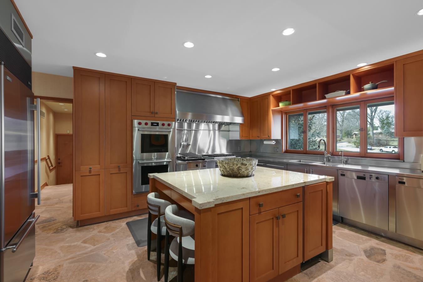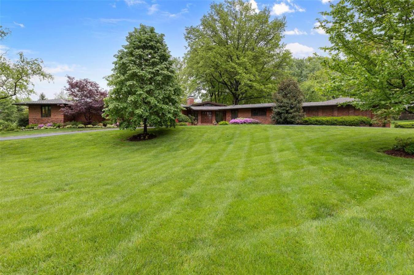 Tucked at the end of a private cul-de-sac on 1.87 acres, this 4,600 square foot mid-century modern residence delivers an exceptional blend of architectural sophistication, privacy, and scale, all within the award-winning Ladue School District. Designed with intention, the home offers four bedrooms, four-and-a-half baths, and a gracious, flowing floor plan that effortlessly accommodates both intimate daily living and elevated entertaining. Recent enhancements - including fresh paint throughout, like-new carpet, upgraded lighting, and newer blinds - lend the interiors a crisp, contemporary feel. The dramatic vaulted living room is anchored by a cozy fireplace and framed by a striking wall of windows that captures views of the patio and pool beyond. Stunning kitchen is a true design statement, featuring flagstone flooring, rich hardwood cabinetry, marble and stainless-steel countertops, and a curated suite of designer appliances. Two additional living spaces provide exceptional flexibility for gathering and entertaining, each offering direct access to the rear patio and pool. The main-floor primary suite serves as a private retreat, complete with dual full baths, walk-in closets, a spacious sleeping area, and direct access to a secluded patio. Additional modern upgrades include whole-home Legrand switches and outlets, smart thermostats, and fully updated hardwired and wireless networking. The lower level now features a newly added egress window, while the remodeled pool bathroom enhances convenience for outdoor living. Outdoors, the property unfolds into multiple patios, a beautiful in-ground pool, and meticulously landscaped grounds-ideal for both quiet relaxation and entertaining at scale. Additional amenities include a large laundry room, three-car garage, generator, and inground sprinkler system. A rare offering of refined luxury in one of Frontenacs most coveted settings!
