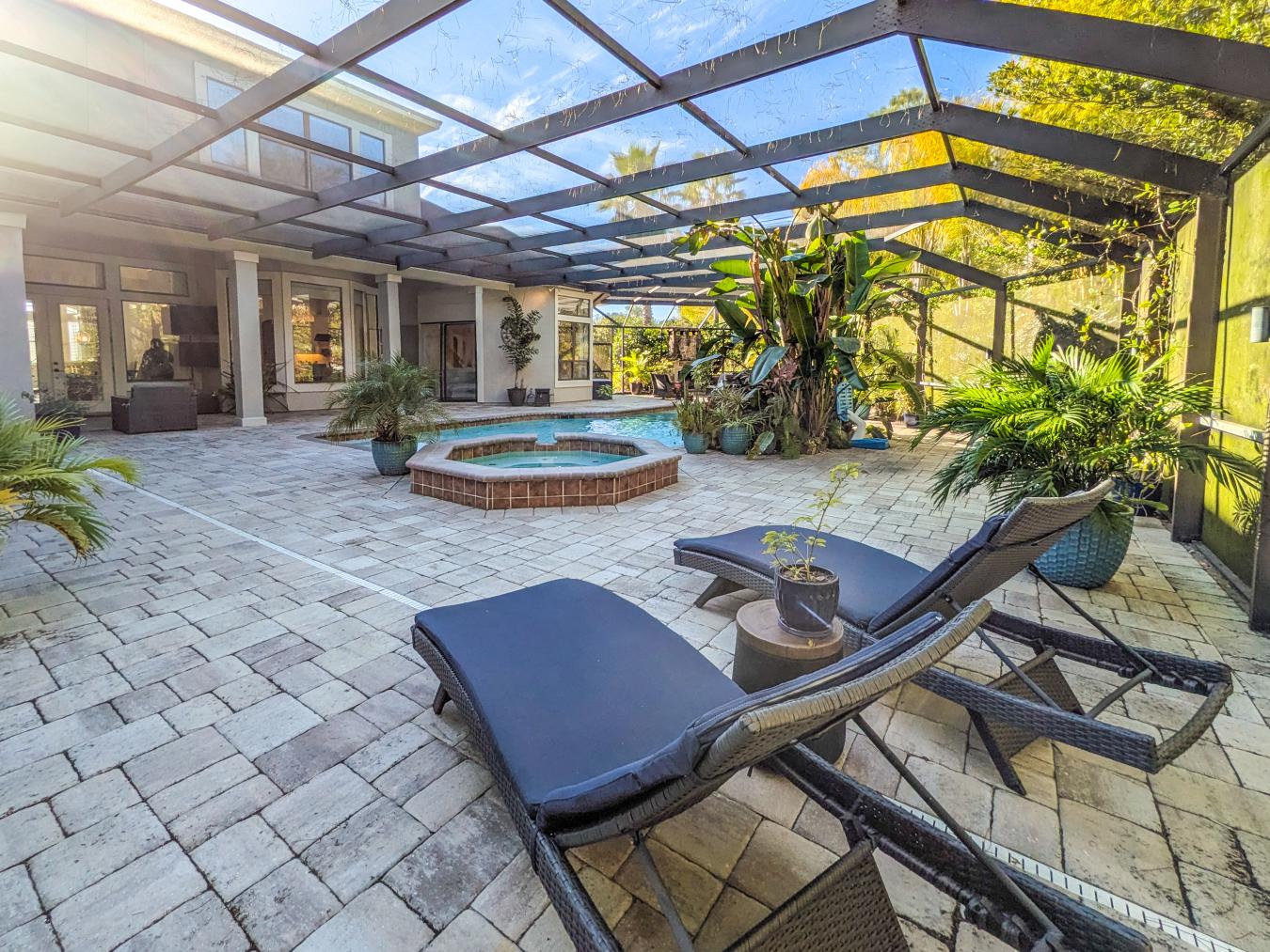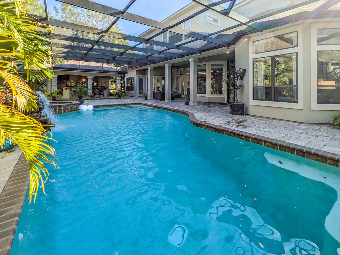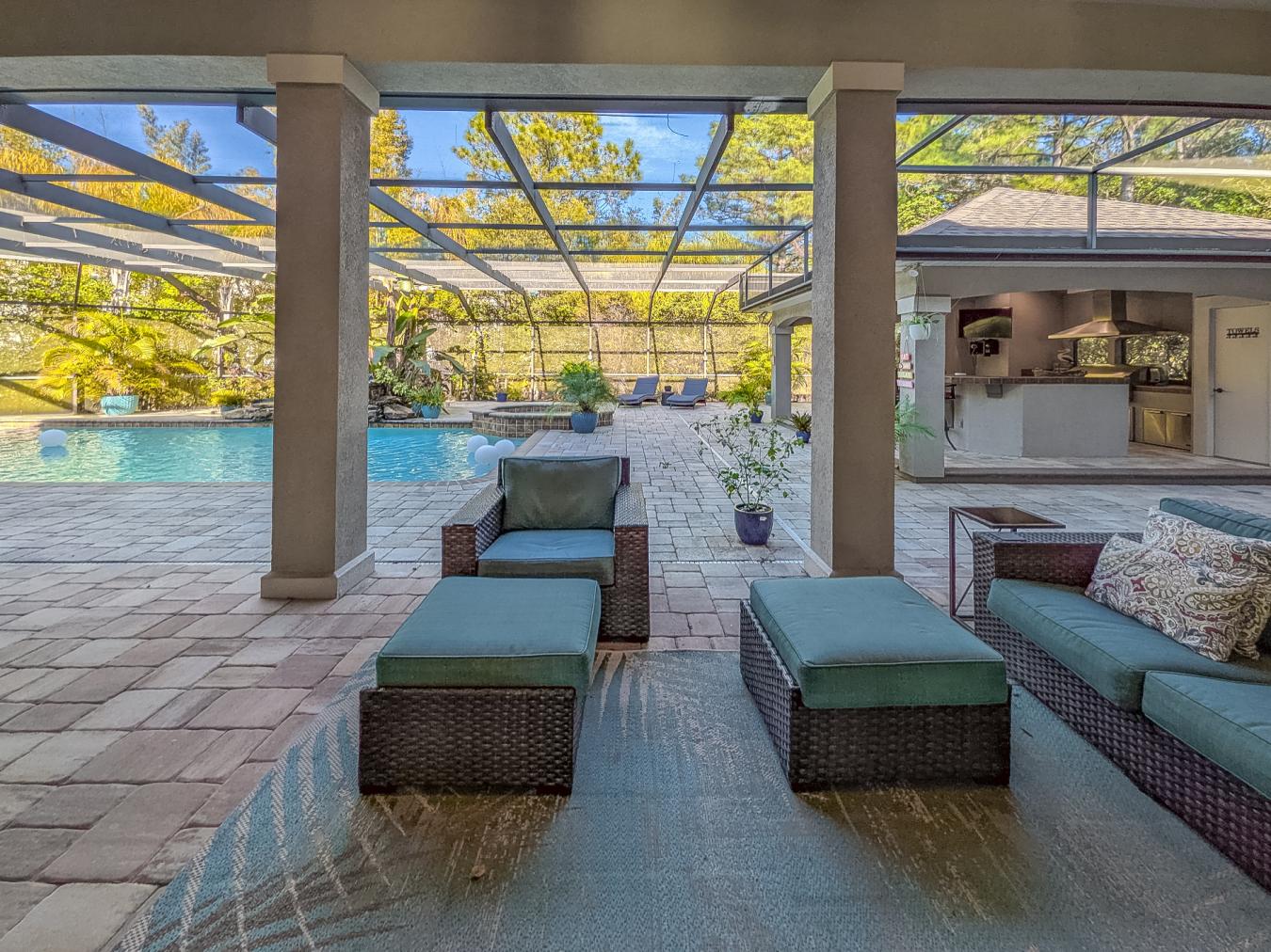 Welcome to luxury living in Highland Glen, a gated community with no CDD fees, where this exceptional home sits on an estate-sized .78-acre lot. Built for entertaining, the true showpiece is the resort-style backyard-featuring a summer kitchen and cabana, heated pool with a custom rock waterfall, hot tub, putting green, outdoor fireplace, pool bath, and outdoor shower.