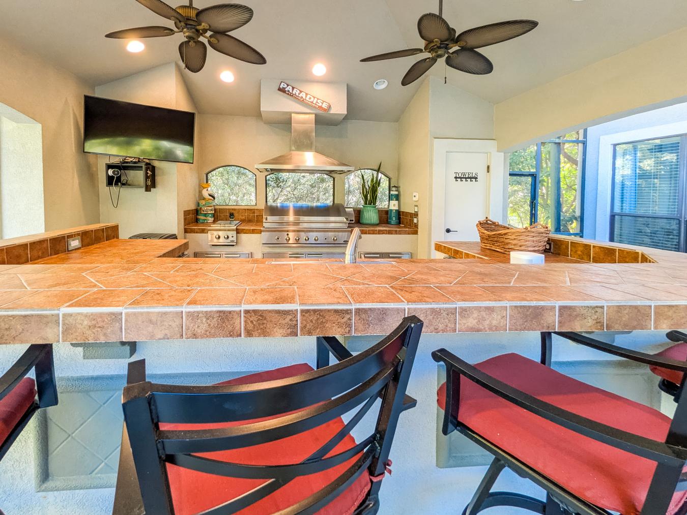 Every sunset feels cinematic from this hilltop retreat in the Vistas at Lake Travis, where 1.6 acres of curated privacy meet the relaxed rhythm of lake and Hill Country living. Designed for both connection and calm, this custom luxury home in Spicewood, TX 78669 blends Mediterranean-inspired architecture with versatile living. A flexible 45 bedroom layout includes dual home offices, a large upstairs game room, and over 400 square feet of walk-in decked storage above the attached two-car garage, while an additional detached two-car garage adds room for vehicles, a workshop, or boat storage. Walls of windows in the formal living and great room flood the space with natural light and frame uninterrupted panoramic views of Bee Creek and the rolling hills beyond. The open kitchen anchors the home with granite counters, warm wood cabinetry, a built-in wine bar, and ice maker, all flowing into both formal and informal dining areas. The main-level owners suite is a retreat in every sense, featuring a private sitting area with breathtaking views, a spa-like bath with an island soaking tub, a walk-through double shower, and a custom closet system with built-ins for effortless organization. Outdoor living is elevated with a resort-style pool and raised spa, surrounded by natural stone, tranquil grotto fountains, and mature trees. The detached cabana includes a full bath, walk-in shower, and a bar for relaxed poolside gatherings, while the true outdoor kitchen-with grill, sink, and sit-up bar-is located just off the informal dining area on the expansive wraparound composite deck. With built-in seating and endless Hill Country skies, the deck invites al fresco dining year-round. Located in a scenic HOA community near Lake Travis marinas, recreation, and top-rated schools, this is more than a modern Hill Country home-its a rare private estate where luxury, lifestyle, and location align. Schedule your private tour today and experience this view-driven sanctuary for yourself.