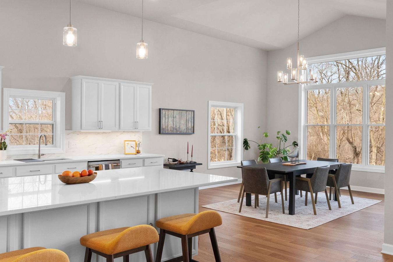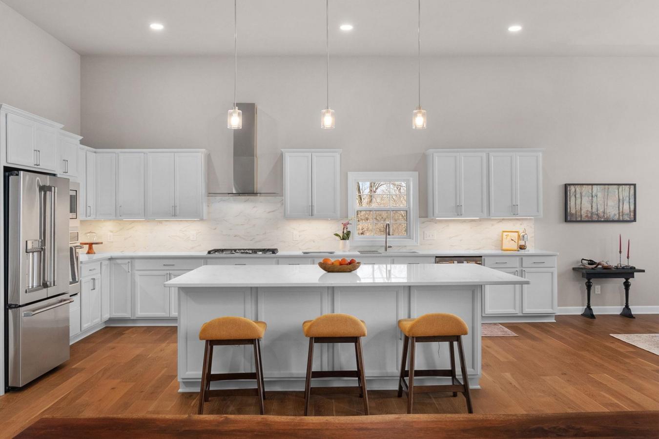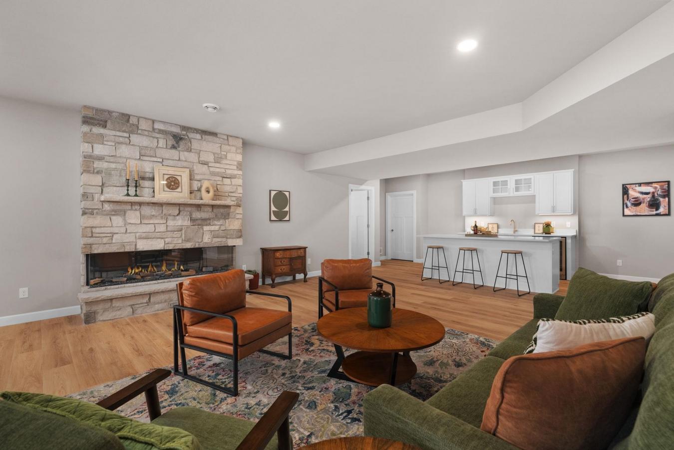 Serenity All Around! This beautiful New Construction 4-bedroom 3 Bath ranch walk-out lower level home checks all the boxes! Located in the quiet Serenity Estates cul-de-sac neighborhood, backing up to mature green space, this 5,883 SF home presents a spacious main level entertaining area with a huge upper patio, a warm fireplace and 21 vaulted ceilings.