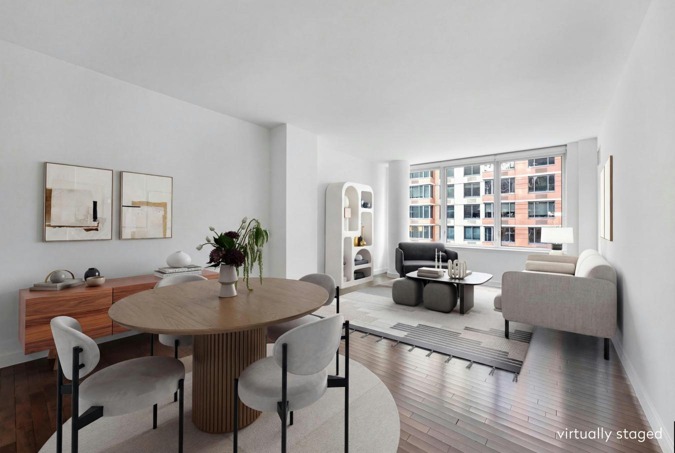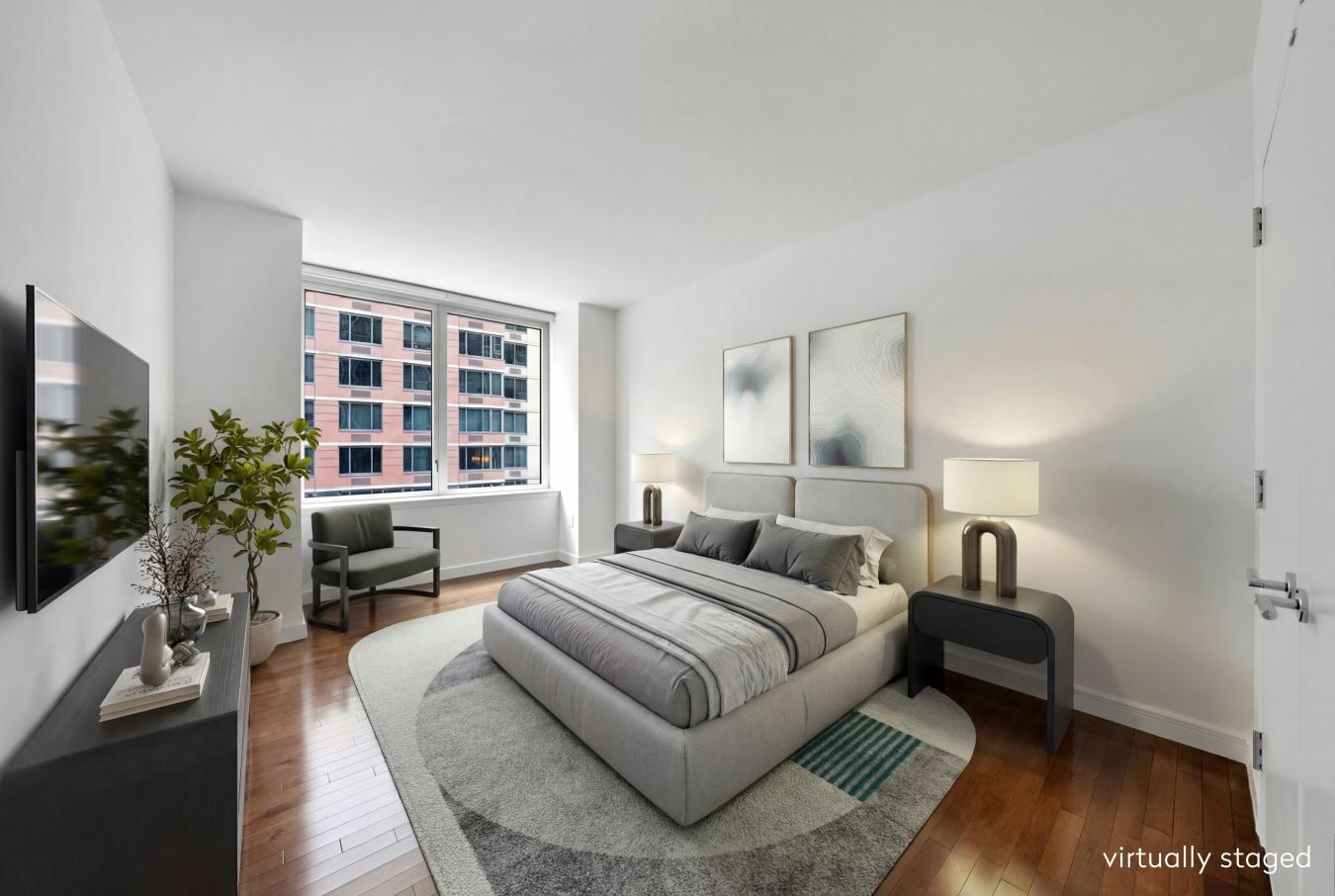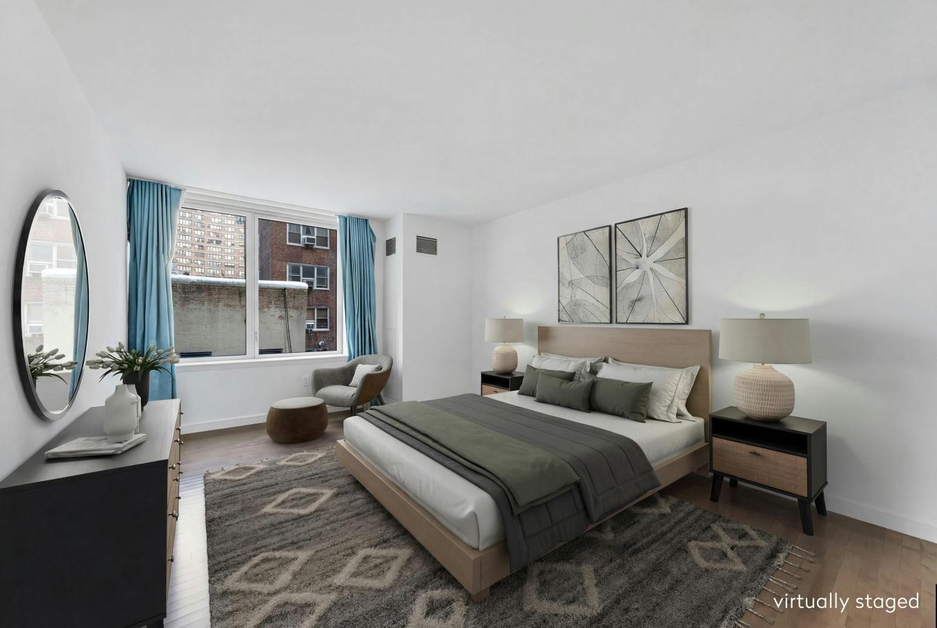 Welcome to apartment 5I at the full-service Charleston Condominium. This corner, 1,345sf (124.9546 square meters) apartment features a thoughtfully designed split bedroom layout allowing for maximum privacy. Additional features include 9ft ceilings, hardwood floors, 3-zone central heat/AC, a washer/dryer in a separate closet, and a spacious open kitchen with stainless appliances including a 36" GE Monogram refrigerator, dishwasher, microwave and sink with garbage disposal. There are two full baths including a large primary with dual sinks and a stall shower. Both bedrooms are spacious and easily accommodate a king size bed with ample room for dresser, nightstands etc. The apartment benefits from large windows and South/North exposures providing excellent natural light. The apartment has a dedicated 25sf locked storage cage in the basement. The Charleston is a well-established full-service pet friendly condominium with a friendly 24-hour door staff, concierge, live-in Resident Manager and a furnished/landscaped roof deck with a separate dog run and panoramic views of NYC. On the second floor is the Charleston Club where the well equipped fitness center is located along with a kitchen/dining room where private events can be held, and an additional outdoor space furnished with tables, chairs and barbecue grills. There are additional laundry units in the basement along with a bike room. There are multiple parking garages nearby. The building is conveniently located in the heart of Murray Hill with the subway (6-train) a few blocks away, crosstown bus on 34th Street, and multiple restaurants, cafes, grocery stores (Trader Joes/Fairway) and AMC movie theater close by.
