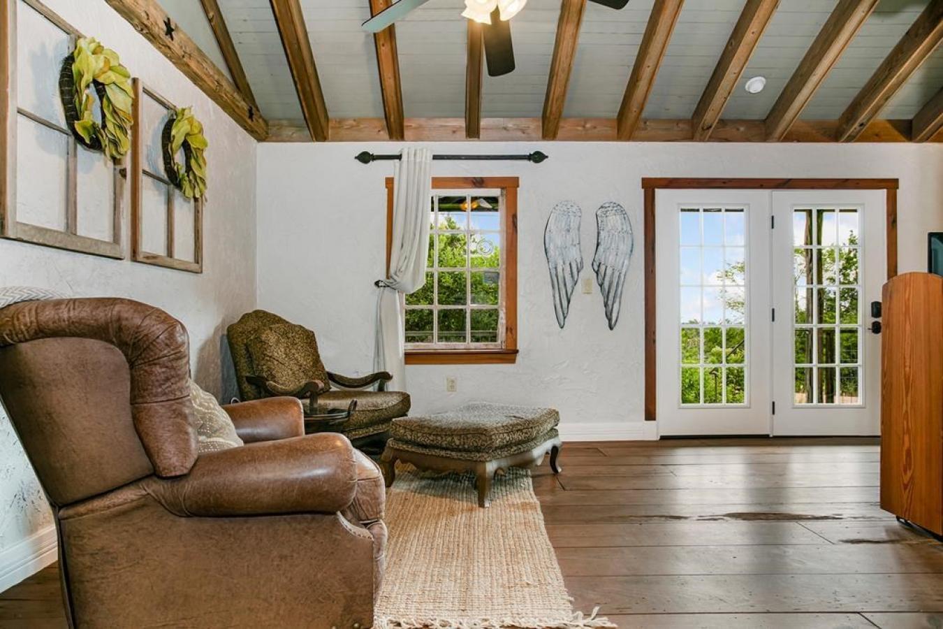Honey Hill Retreat vacation rental is a picturesque 28-acre Hill Country getaway located just minutes from Fredericksburgs Main Street, award-winning wineries, and local dining. This exceptional investment property features four residences: a main home known as The Back 20 and three cottages known as Morning Mimosa, Forget Me Not, and Wild Rose Cabin. Each rental has been thoughtfully designed to take full advantage of the beauty and serenity of the Texas Hill Country. The Back 20 is perfect as a home or a rental (either short term or long term). It offers 2 bedrooms, 2 baths, a full kitchen, an open living area, and a spacious back deck overlooking peaceful countryside views. It also includes an additional apartment that is not currently rented, providing an opportunity for future guest use, caretaker housing, or added income. There is also a 1500-square-foot barn with the back 20. Morning Mimosa, Forget Me Not, and Wild Rose Cabin are 1-bedroom, 1-bath luxury cottages, each featuring king beds, full kitchens, ambiance fireplaces, and unique architectural details that make each property feel completely unique. Step outside to enjoy a private hot tub beneath the stars, the ultimate setting for a romantic Hill Country escape. Surrounded by native trees, open meadows, and abundant wildlife, Honey Hill combines the tranquility of country living with close proximity to town conveniences. With an established short-term-rental history and beautifully maintained interiors, this turnkey investment offers multiple income-producing units along with the flexibility to host guests, family, or friends in complete privacy.
