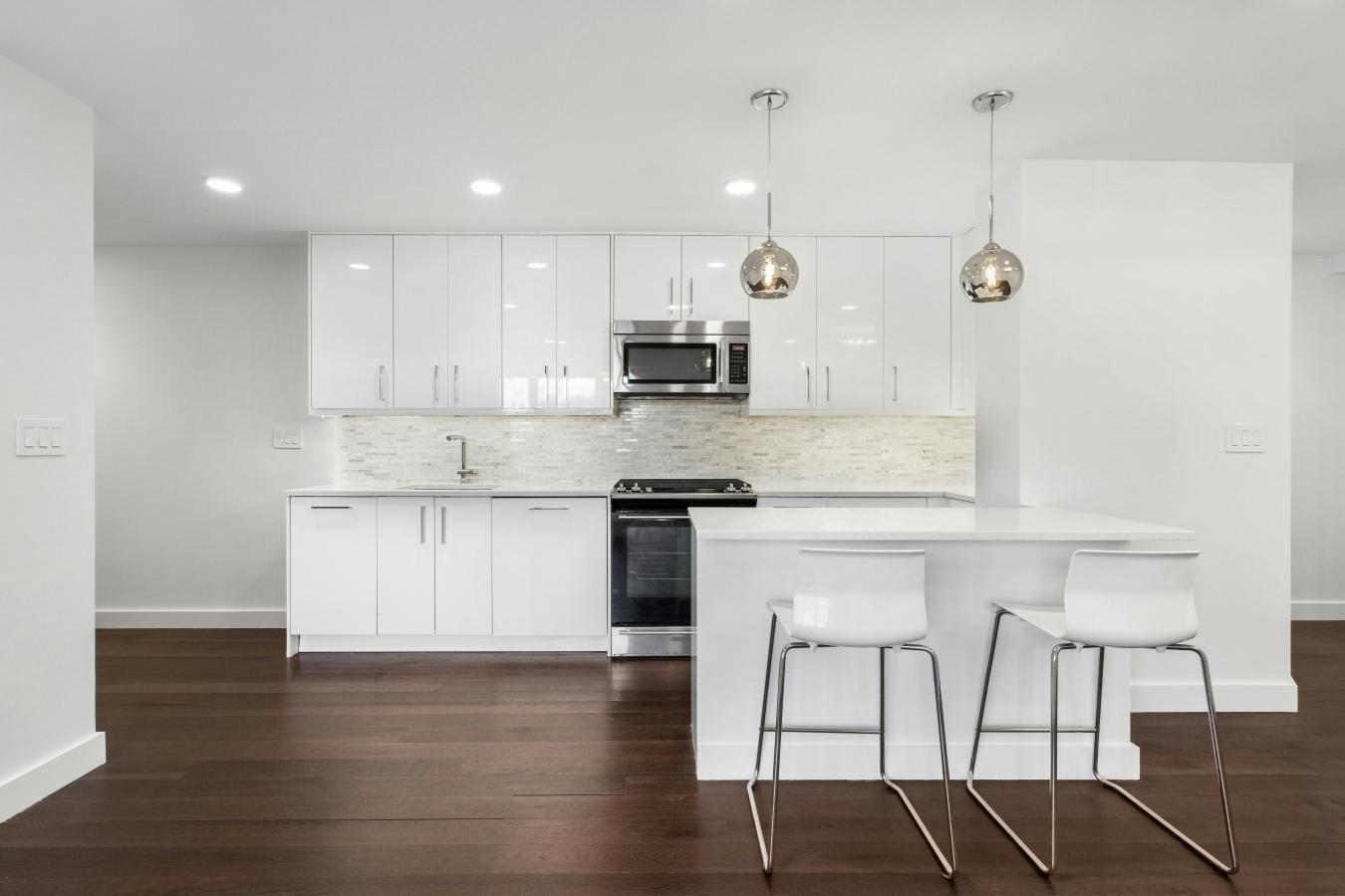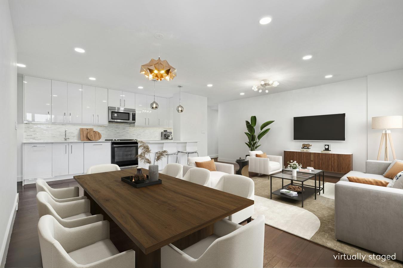 Thoughtfully renovated three bedroom/two bath home in mint condition with custom touches throughout! Modern and stylish with open concept living/dining. Spacious great room with five wrap around windows serving up southeastern & northwestern exposures. Large dining area with space for a 10-seater dining table.