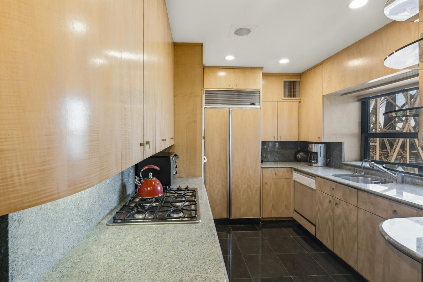 Sleek. Modern. Spacious. Renovated with the finest materials, this oversized one bedroom with large bath plus onyx powder room was designed with a rich and elegant feel. Sweeping city and river views encompass the large corner windows facing north and east. The walnut cabinetry in living room features a bar area with a marble top, a media cabinet and lots of storage for showcasing your collections. The windowed kitchen features beautiful wood cabinets, a subzero refrigerator, wall ovens, microwave and gas cooktop. The laundry area has a GE washer and dryer. The bedroom was designed with a walk in closet, an additional wall of closets and lots of custom cabinetry. The en-suite bath was enlarged and have a tub and separate steam shower.