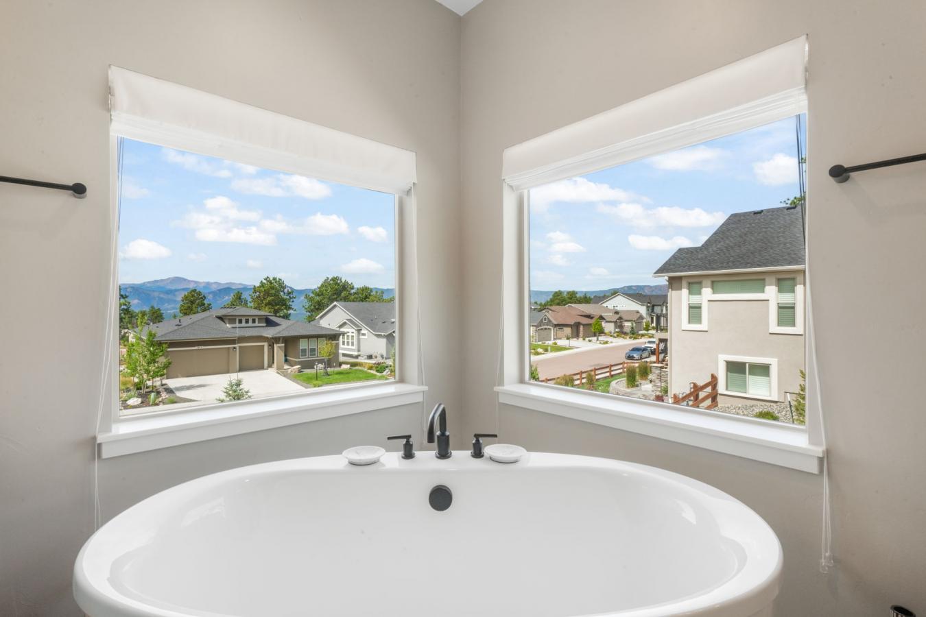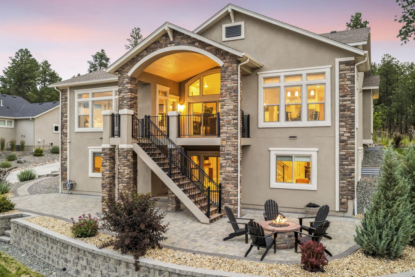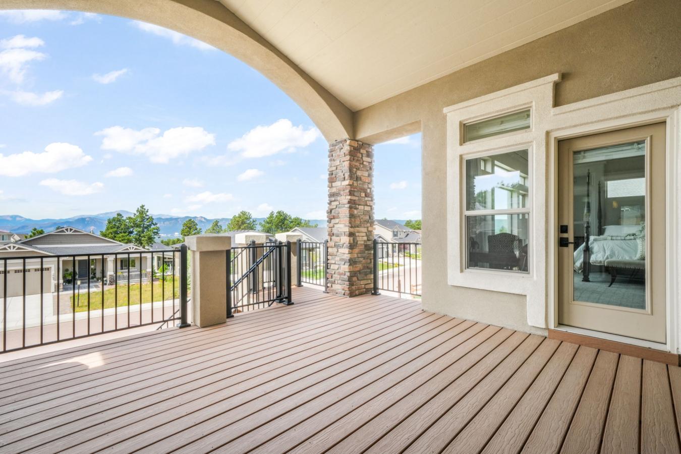 Welcome to your dream home in the prestigious Sanctuary Pointe community, where luxury living meets breathtaking natural beauty. Nestled among towering pines and showcasing unobstructed views of Pikes Peak and the U.S. Air Force Academy, this nearly new ranch-style home offers unmatched curb appeal and thoughtful design throughout. The exterior features a tasteful blend of stucco and stone accents, a spacious 3-car garage, and a professionally landscaped yard complete with a treed basketball court that could easily transform into a private terrace or patio retreat. Inside, the wide-open floor plan flows effortlessly from room to room with many upgraded finishes. The vaulted living room is anchored by a cozy gas fireplace and opens seamlessly to a chefs kitchen featuring a gas cooktop, quartz countertops, eat-in dining, and a formal dining area-perfect for entertaining. Sliding doors lead to an expansive covered deck where youll enjoy some of the most spectacular views Sanctuary Pointe has to offer. The main-level primary suite is a true sanctuary with private deck access, panoramic mountain views, a luxurious en-suite bath with a free-standing tub, walk-in shower, dual vanities, and a large walk-in closet. A second main-level bedroom, full bath, and convenient laundry room complete the main floor. Elegant touches such as custom window treatments-some remote-controlled-elevate the homes refined aesthetic. The fully finished walkout basement offers a bright, open rec-room with a second fireplace, a wet bar, and walk-out access to the beautifully landscaped backyard with built-in fire pit. This level also includes an ensuite guest bedroom, two additional bedrooms with a shared Jack-and-Jill bath, and plenty of space for a home theater, game tables, or fitness area. Located just two blocks from Sanctuary Pointes premiere park and turf field, this exceptional home truly captures the essence of Colorado luxury living.