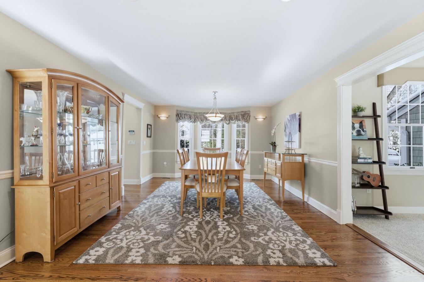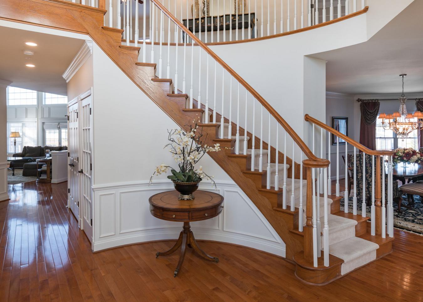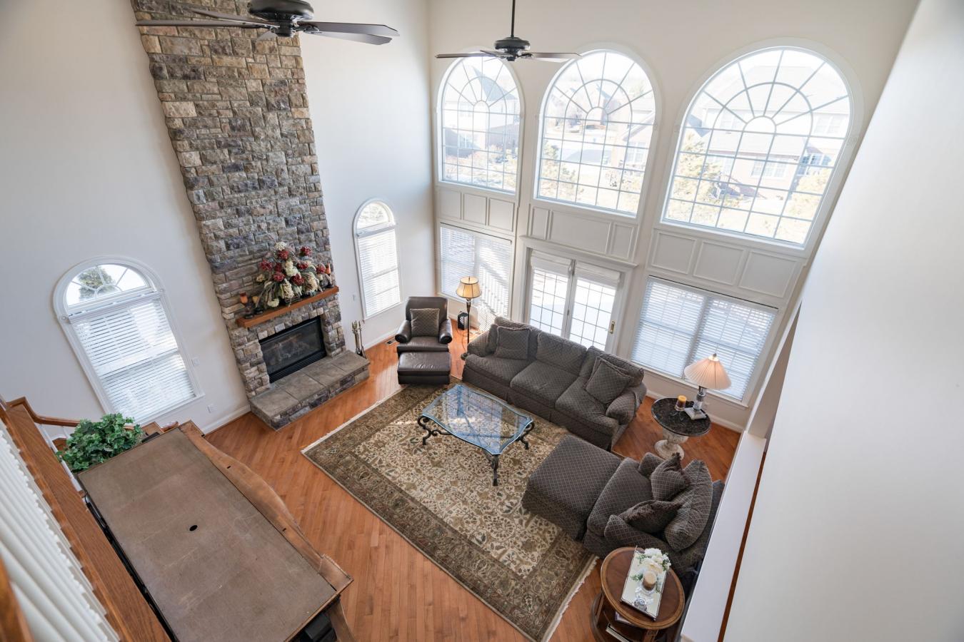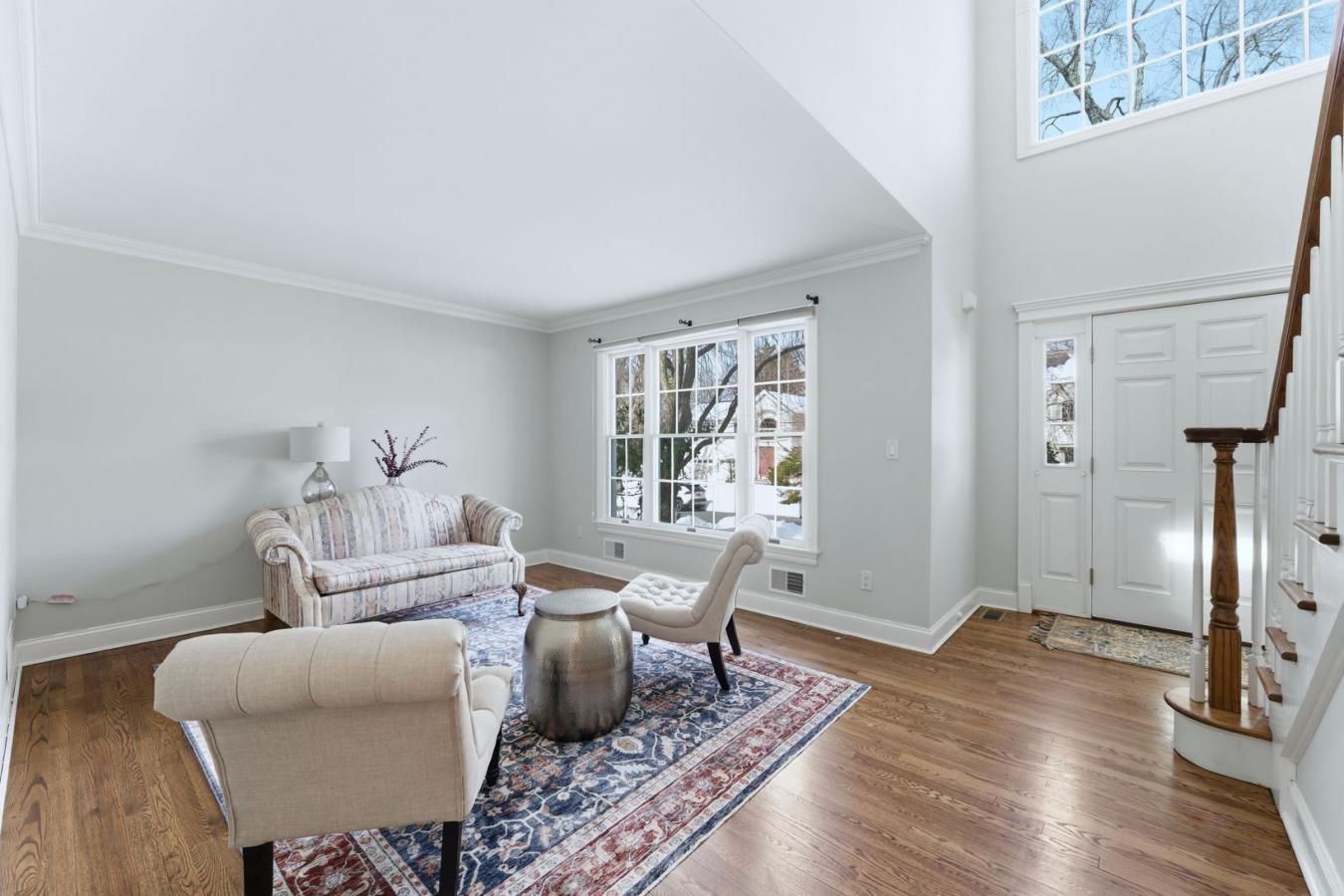 This spacious stone home offers over 3,200 sq ft of finished living space, ideal for large families or multi-generational living. The main floor features a grand foyer with vaulted ceilings, a powder room, and a striking solid maple staircase that sets the tone for the quality throughout.