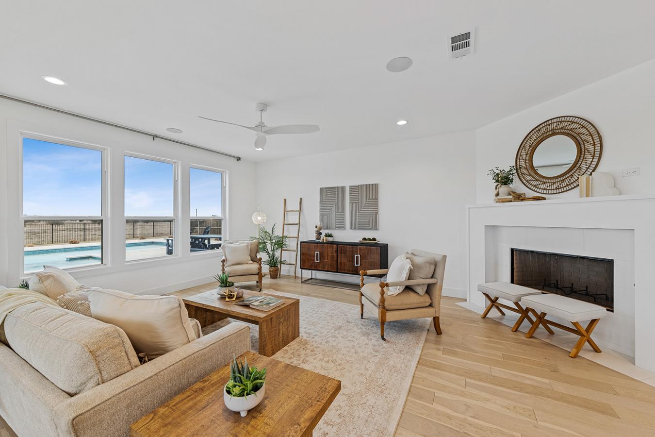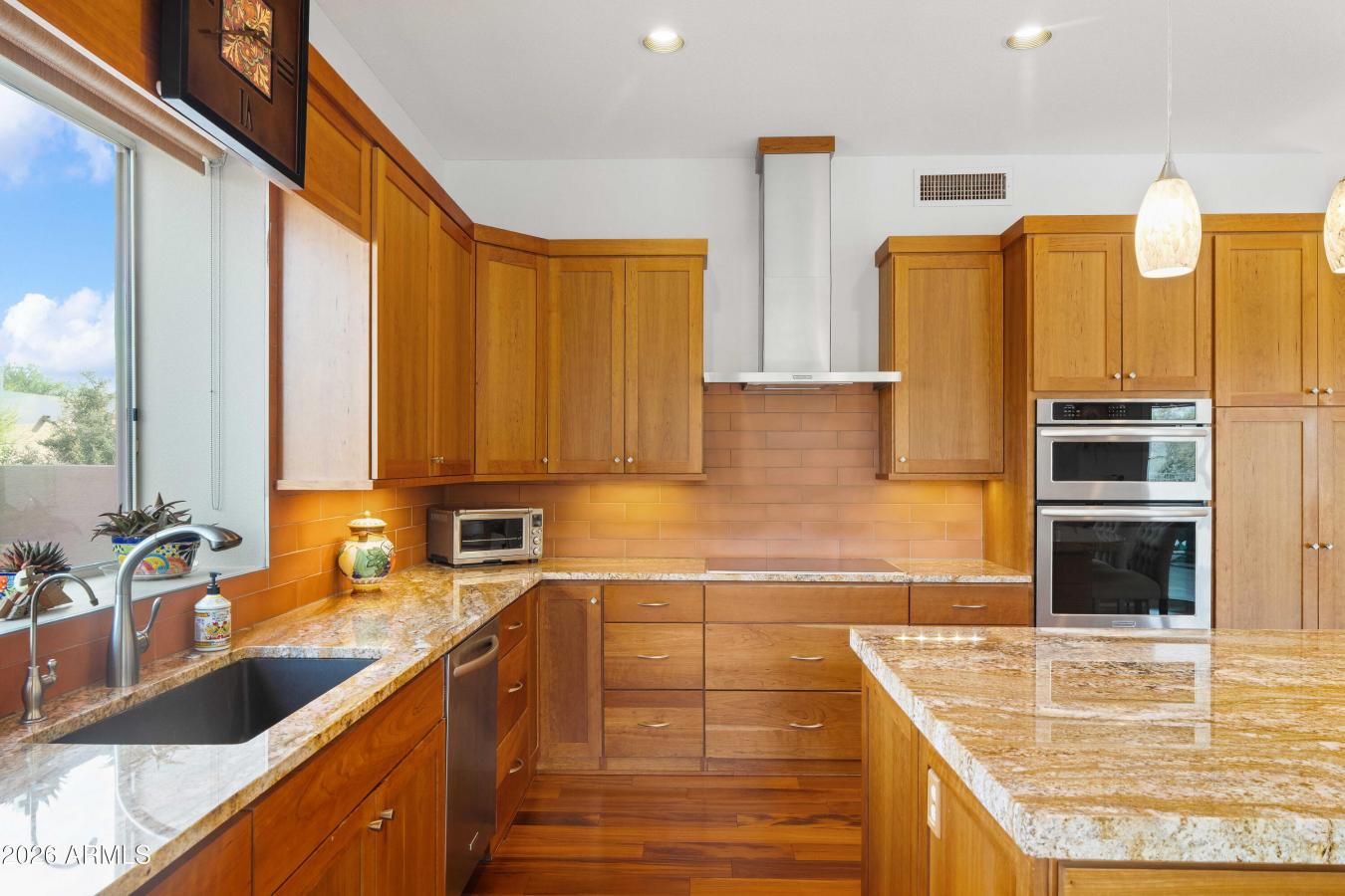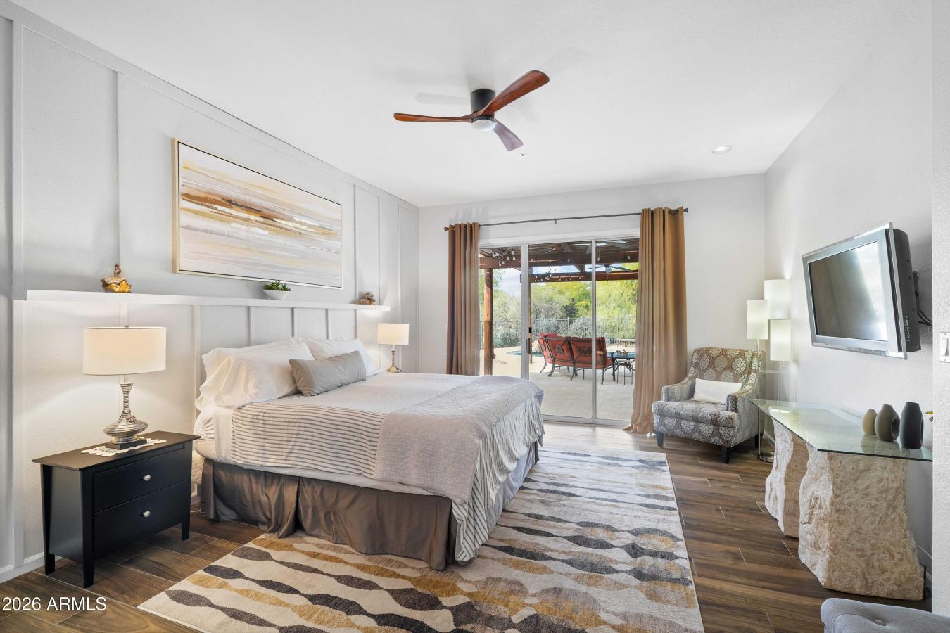 Beautiful single-level home in the desirable Bent Tree community of North Scottsdale, offering the perfect blend of comfort, functionality, and effortless Arizona living. Thoughtfully designed with wide hallways, zero interior steps, and an ADA-compatible primary bathroom, this home provides flexibility and peace of mind for today and for years to come. The versatile layout includes a private third bedroom with its own entrance, ideal for guests, an in-law suite, or a home office. Inside, enjoy warm wood cabinetry, elegant quartzite countertops in the bathrooms and stunning granite in the kitchen, and light-filled living spaces. Step outside to a serene, low-maintenance backyard with pool, travertine tile, custom pergola, and intentional desert landscaping.