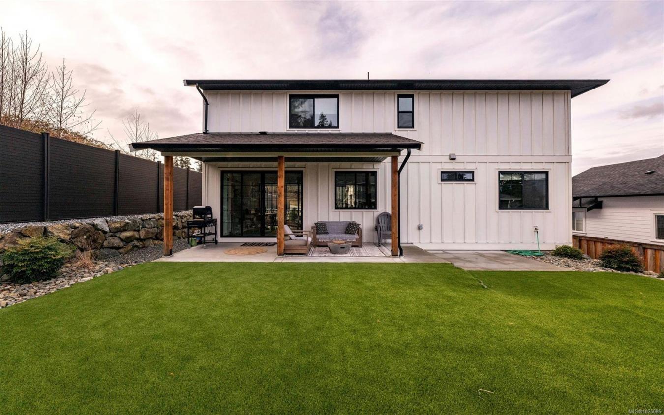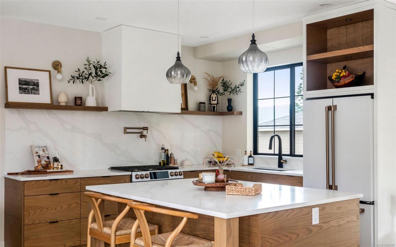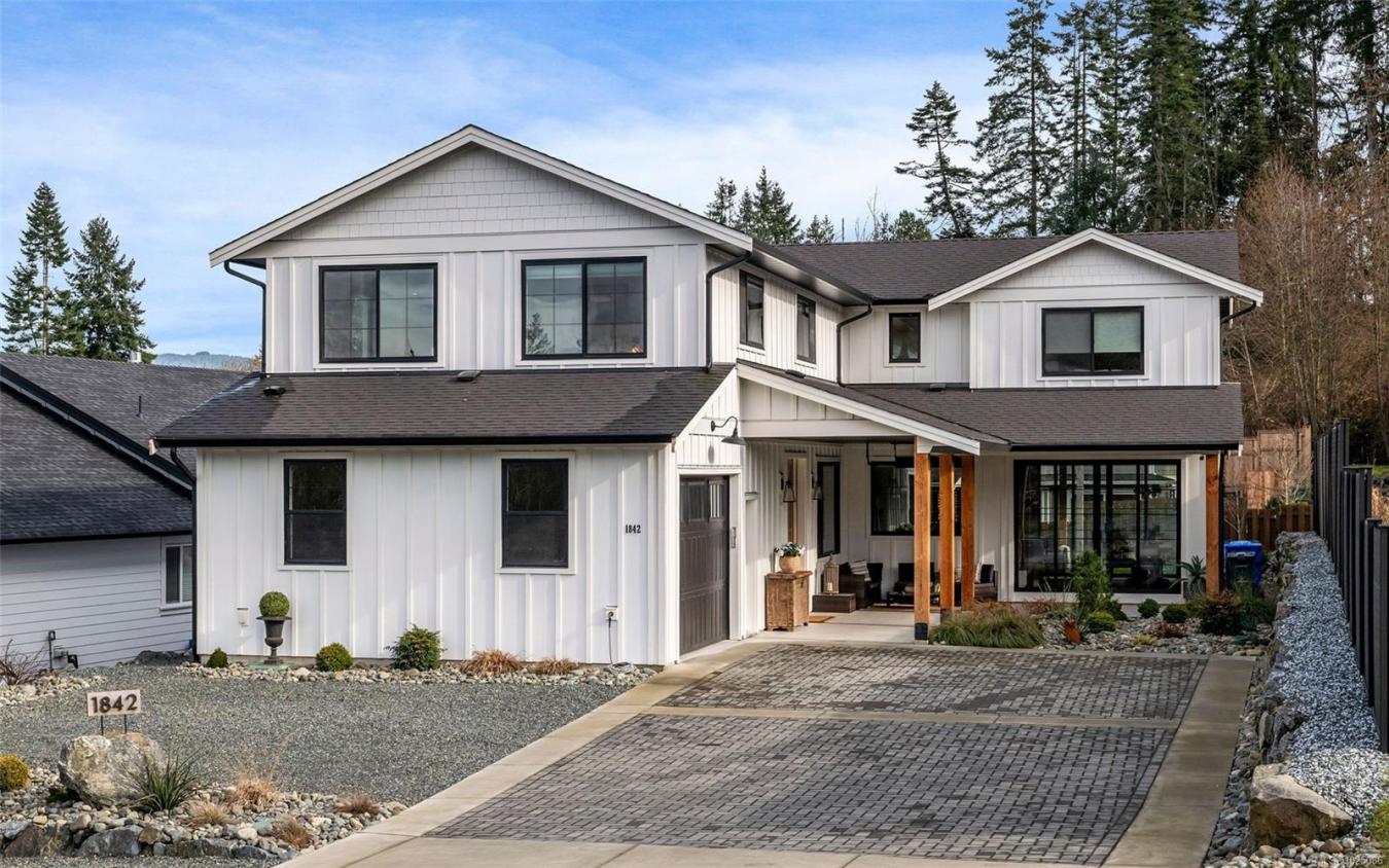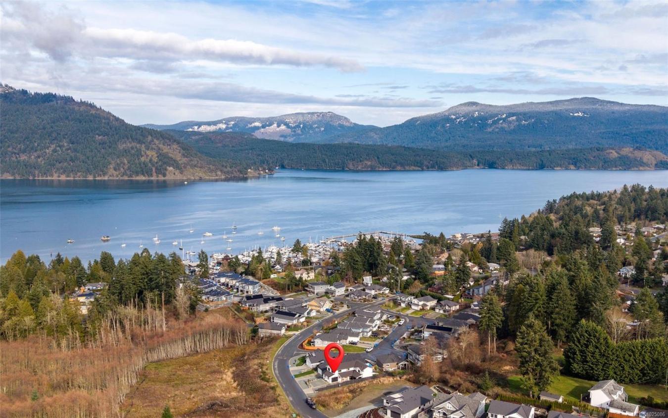 Welcome to this gorgeous, custom-built, one-owner home in the heart of Cowichan Bay. Offering 2,920 sq ft of beautifully finished living space, this 4-bed, 3-bath home combines quality craftsmanship with exceptional comfort. The main floor features a spacious living room with a gas fireplace, a stunning custom Heronwood kitchen, & an inviting dining area that creates a warm & loungy atmosphere perfect for entertaining. Step out to two covered patios & enjoy seamless indoor-outdoor living, while the landscaped yard & irrigated gardens provide low-maintenance living. Also on the main level are a large pantry, laundry room, bedroom & 4-piece bath, ideal for guests or main-floor living. Upstairs offers 2 more beds, a 4-piece bath, a family room & a stunning primary with ocean/mountain views, a walk-in closet & an ensuite with heated floors. Additional features: engineered hardwood, 5 ft crawl, attached garage, home warranty & a location close to trails, amenities & commuter routes, and an exceptional lifestyle opportunity for families. No GST.