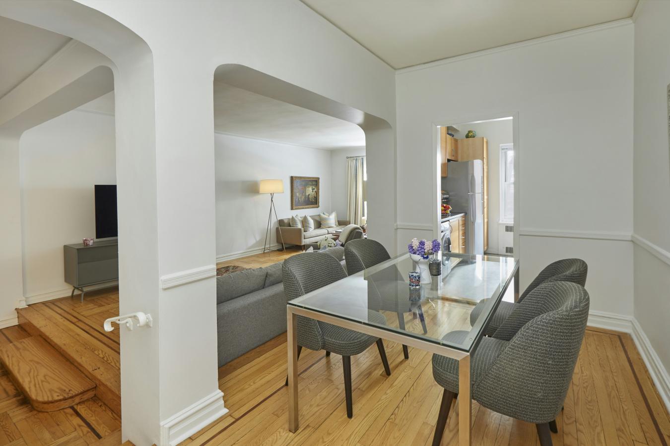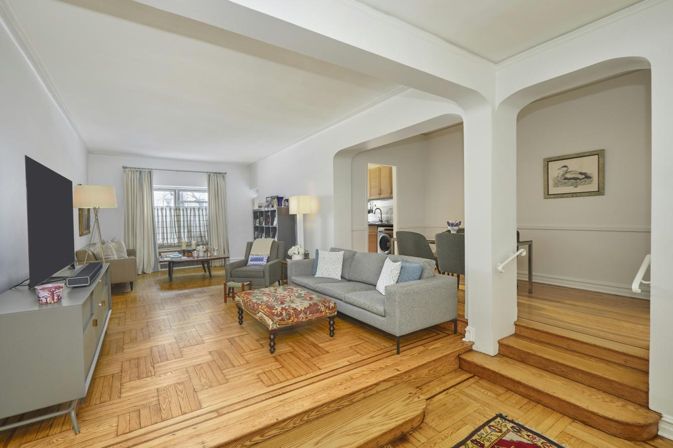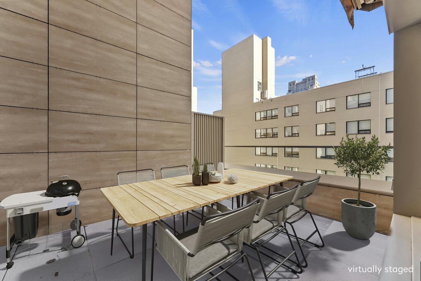 Beautifully renovated and thoughtfully converted from a one-bedroom into a true two-bedroom, this bright, one-bath coop offers exceptional indoor-outdoor living. Two private terraces with East, South, and West exposures provide open sky views and wonderful natural light all day.