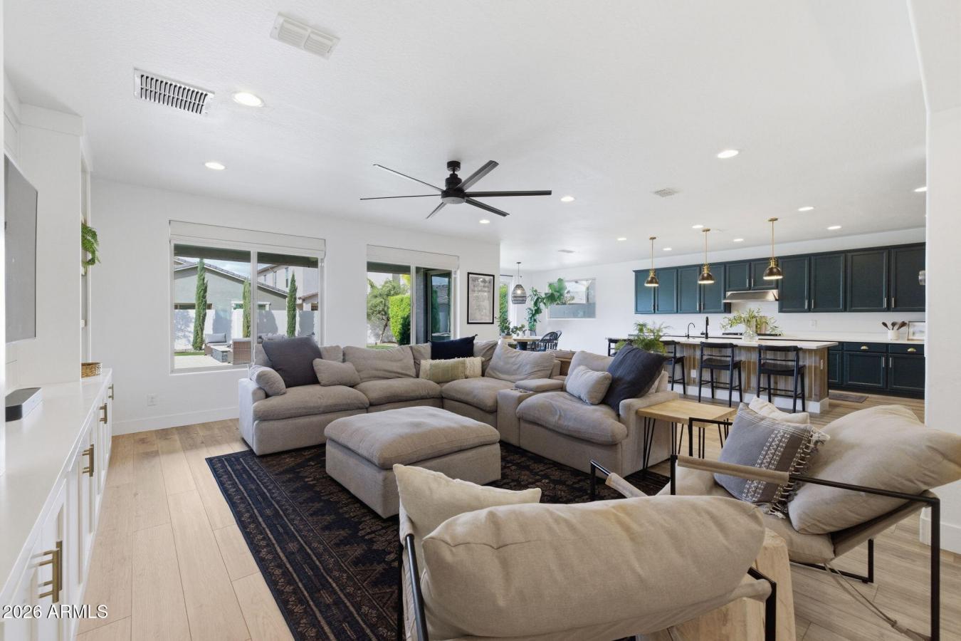 Welcome home to elevated living in Eastmark. From the moment you arrive, the curb appeal makes a statement with low maintenance desert landscaping, modern accents, a pavered driveway, covered front patio, and beautiful landscape lighting that highlights the homes charm. Step inside and youre immediately greeted by a bright, open feel and a stunning half spiral staircase with accent tile inlays. Natural wood-look LVP flooring flows seamlessly throughout the main living spaces, creating warmth and continuity. The living room is a true showpiece with custom built in cabinetry, wood shelving, and a shiplap accent wall behind the TV, and perfectly positioned windows to capture the picturesque backyard views. The gourmet kitchen opens effortlessly to the living and dining areas, making it ideal for entertaining. Dark green cabinetry with gold hardware creates a stunning designer look, while the massive island wrapped in wood accents showcases quartz countertops and upgraded gold pendant lighting. A gas cooktop anchors the space, complemented by a single apron sink, sleek black fixtures, and a reverse osmosis system for added convenience. A casual dining space sits just off the kitchen, with a formal dining area located on the other side of the walk-in pantry, offering flexibility for both everyday living and special gatherings. The primary suite on the first floor is massive in size with an abundance of natural light. The ensuite bath includes a separate tub and shower, dual vanities with a sitting area, and a spacious walk in closet. An additional downstairs bedroom also features its own upgraded ensuite bath, perfect for guests or multigenerational living. Upstairs, enjoy an oversized loft with a separate nook ideal for a dedicated office space. The additional bedrooms offer newer carpet, modern accent walls in most rooms, and walk in closets. The backyard is a dream with a large covered patio, mature landscaping, and landscape lighting that creates the perfect evening ambiance. The expansive pool features a baja step and a spa that holds up to 12 and flows beautifully into the pool. A generous turf area provides additional space to play, and the pool fence is stored in the garage and will convey. The third bay garage is currently set up as a studio and the home also includes solar for added efficiency. Located in Eastmark, youll enjoy a resort style lifestyle with community pools, splash pads, parks, Steadfast Farm, and the clubhouse known as The Mark. This is more than a home. It is a lifestyle waiting for you.
