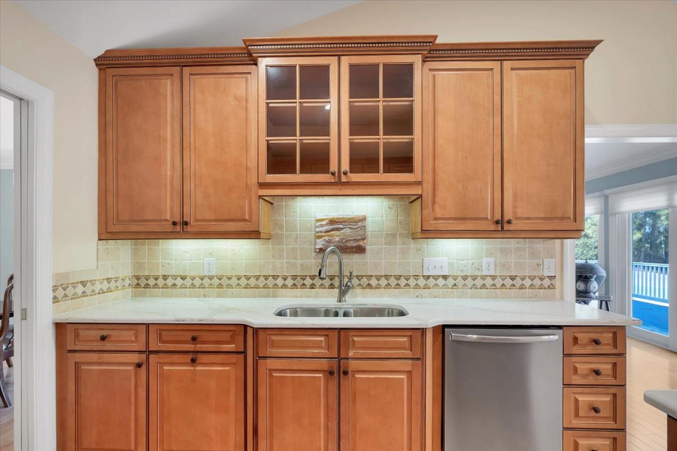 Welcome home to 939 Manor Lane in Bay Shore. This meticulously maintained 4-bedroom, 2.5-bath Split Style home offers both comfort and modern design. The heart of the home is the designer, custom oversized kitchen renovated 2022 featuring a stunning Cambria quartz waterfall island with microwave drawer, European Style cabinetry with pantry pull-outs, under cabinet lighting, porcelain plank tile and stainless appliances-making it a true entertainers kitchen. Radiant heat runs throughout the entire main floor adding warmth and comfort underfoot. The oversized kitchen flows seamlessly into the living room, where soaring ceilings that creates an open and airy layout. An Anderson slider opens to a spacious Trex deck, perfect for outdoor dining. Step down to a lovely den with a custom granite window ledge and a tiled bathroom. For added convenience, a private laundry room with a new washer and dryer offers extra storage. Additional notable features include a 3-zone new heating system, separate new hot water heater, 200-amp electric service, a generator connection box/transfer switch for a portable or home generator for peace of mind, ductless air conditioning, central air, an in-ground sprinkler system, security camera system, and waterproof LVP flooring. The backyard is an entertainers delight, showcasing an 18 x 36 heated L-shaped in-ground pool w new liner, new heater & solar cover, surrounded by brick pavers, a screened-in gazebo with electric for shaded relaxation, and a dedicated play area with a wood kingdom playset. This is the perfect home for both relaxation and entertaining. Do not miss this Bay Shore Beauty!!