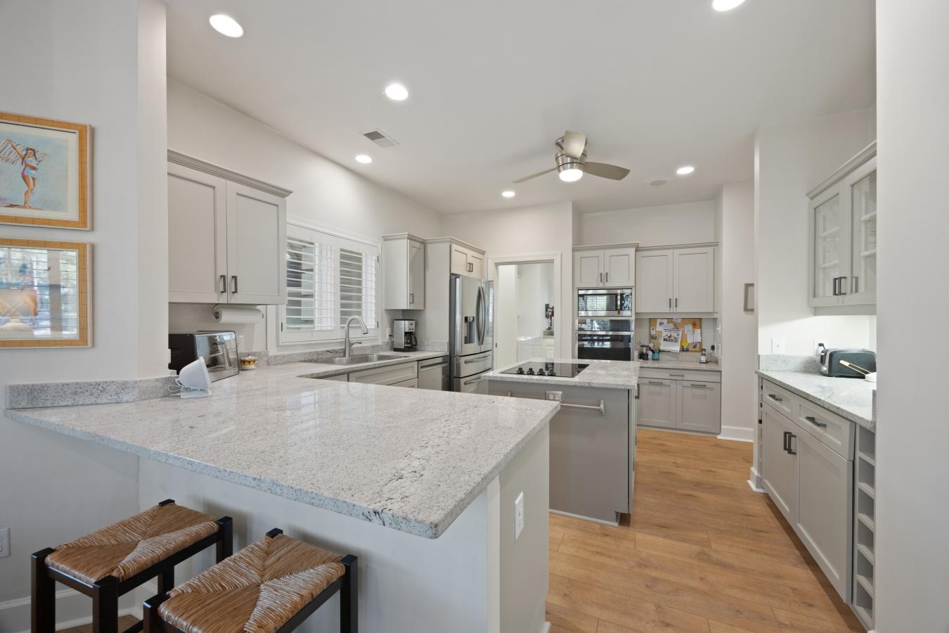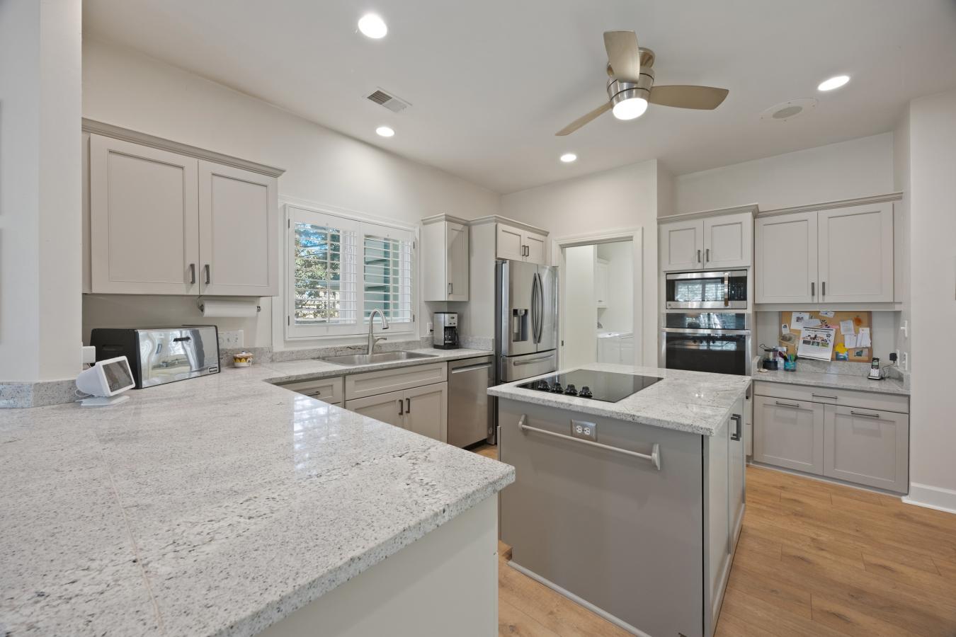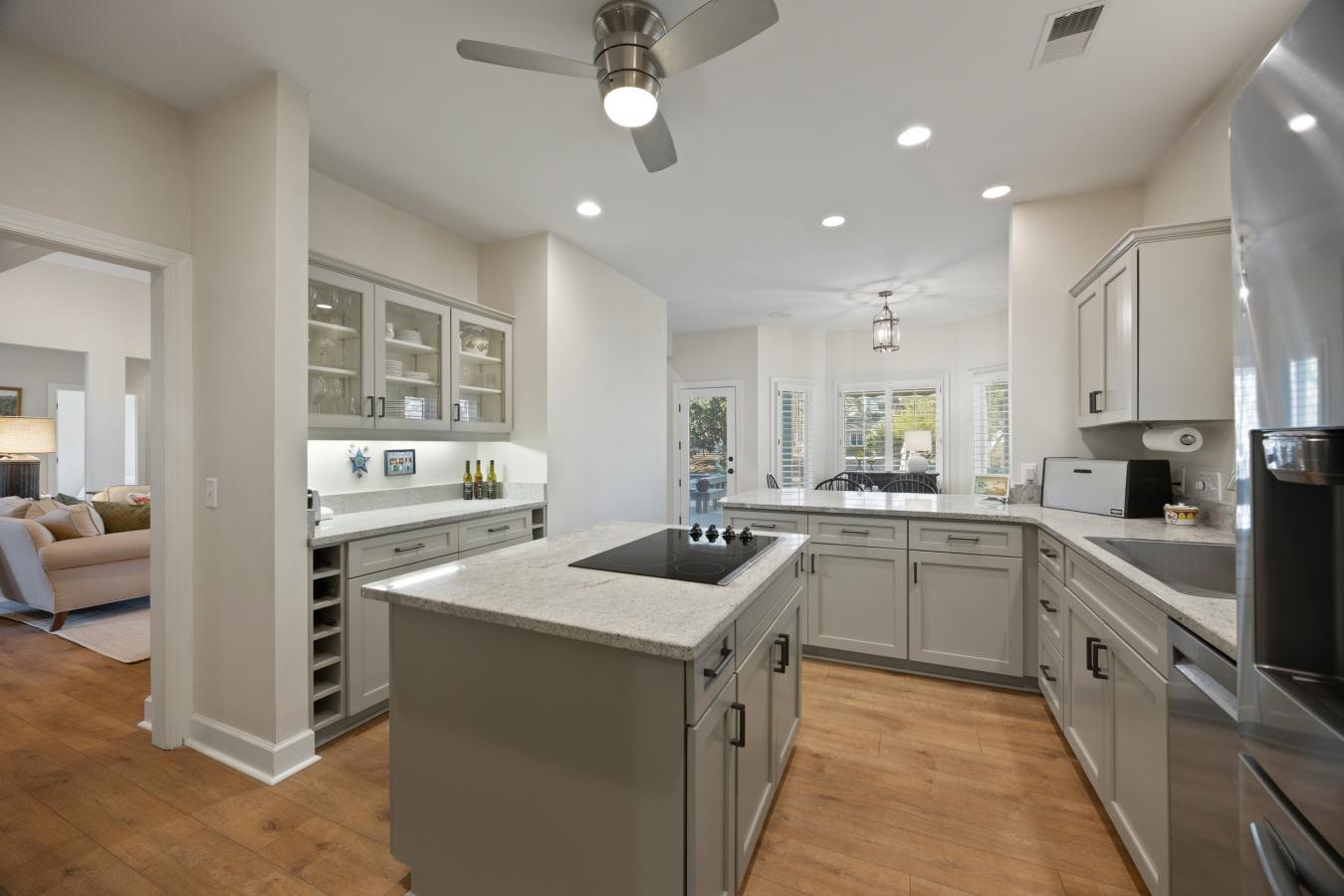 Welcome to 80 Peninsula Drive in Moss Creek, where sweeping lagoon views and Lowcountry charm define this beautifully refreshed 3BR office home. Brand-new flooring enhances the main living spaces, while the kitchen shines with refreshed cabinetry and updated hardware for a clean, modern feel.