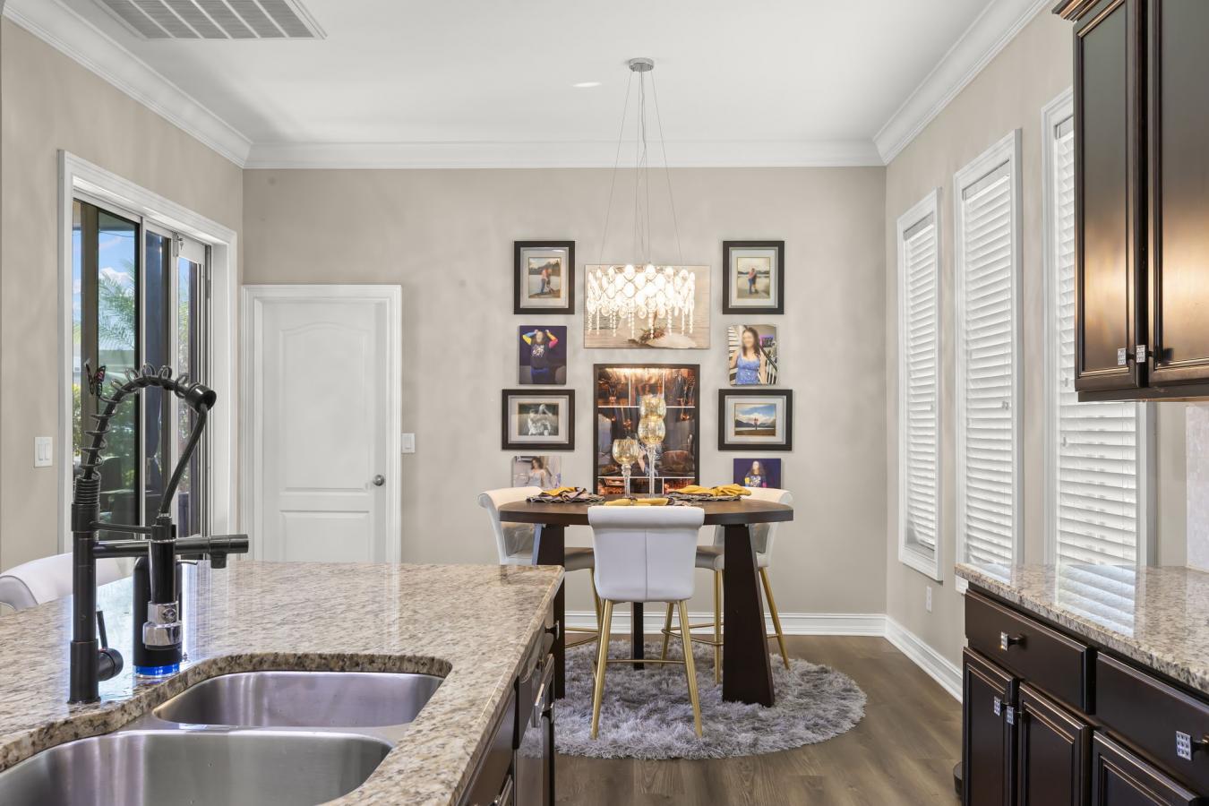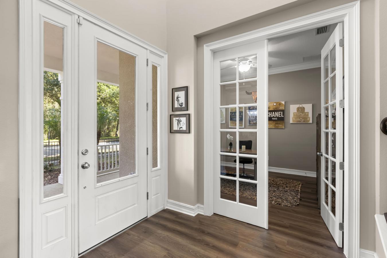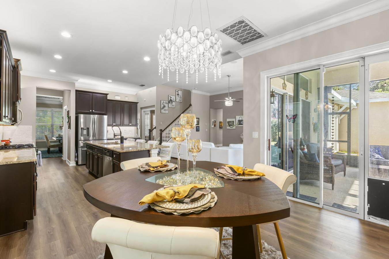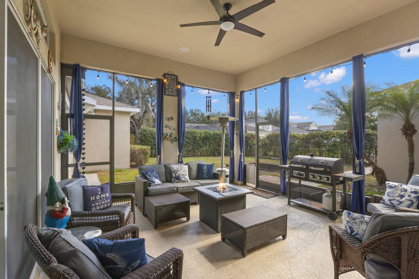 Welcome home to 5906 Fishhawk Crossing Blvd in Lithia, Florida, located in the heart of FishHawk Ranch. This outstanding home offers timeless curb appeal with a large covered front porch, classic architectural detailing, and a rear-entry three-car garage, creating an inviting streetscape. Built in 2013, the home features 5 bedrooms, 4 full bathrooms, a large media room, a den, and approximately 3,640 square feet of heated living space, thoughtfully designed with open sightlines and abundant natural light throughout. The formal dining room is a standout space, highlighted by coffered ceilings, custom millwork, and generous proportions ideal for both everyday use and larger gatherings. New luxury vinyl flooring enhances the downstairs living areas, providing easy-care durability while complementing the homes clean, modern aesthetic. The kitchen anchors the main living space with granite countertops, under-cabinet lighting, stainless steel appliances (approximately two years old), a gas range, an oversized island with seating, a walk-in pantry, a butlers pantry that is located in between the kitchen and dining room, and a spacious dining nook with ample room for a full table and chairs. The open great room flows seamlessly to a screened lanai and private fenced backyard, supporting comfortable indoor-outdoor living. A downstairs den or office offers flexible space for work or additional living needs, while the owners suite includes coffered ceilings, dual vanities, a garden tub, a walk-in shower, and a custom walk-in closet. Upstairs, a theater-style bonus room, an additional bedroom, a full bath, and a private balcony provide versatile space for entertainment or guests. Recent upgrades include a gas tankless hot water heater installed in 2025, a Culligan whole-home water filtration system, and a rear-entry garage with a new door and motor (2024) featuring RaceDeck flooring and a newly pavered driveway. FishHawk Ranch residents enjoy an extensive amenity offering that includes resort-style pools, fitness centers, tennis and pickleball courts, sports fields, parks, playgrounds, splash pads, dog parks, miles of walking and biking trails, and a vibrant Town Square with restaurants, cafes, and year-round community events, plus yoga and wellness studios. Conveniently located near shopping, dining, major roadways including I-75 and US-301, downtown Tampa, and MacDill Air Force Base, this home delivers space, comfort, and connectivity in one of Hillsborough Countys most desirable master-planned communities. Call today for your private showing. The seller is willing to leave the home partially furnished.