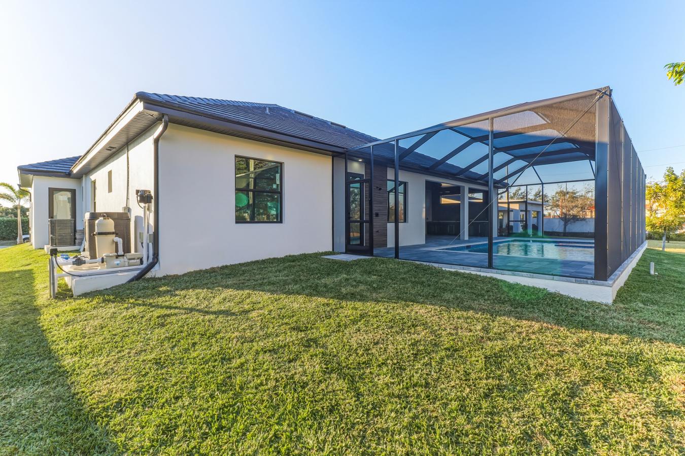 What a find, a SouthWest Cape Coral Florida Luxurious Pool and Spa home Nestled in the highly sought-after homes located "South of Cape Coral Parkway" in Cape Corals exclusive SW corridor of Luxurious Estate gulf access homes. This luxurious single-story Custom New build offers the perfect blend of elegance, comfort, and modern sophistication. From the moment you arrive, youll be captivated by the homes clean architectural lines, expansive driveway, and impeccable curb appeal. Step inside to soaring ceilings, premium finishes, and a light-filled open-concept design that seamlessly blends indoor and outdoor living. This magnificent residence features a thoughtfully designed 3-bedroom Den/office, 3-bathroom layout that caters to both relaxed living and stylish entertaining. The chef-inspired kitchen boasts custom cabinetry, walk in Pantry ,quartz waterfall edge custom center island and quartz countertops with stainless steel appliances includes separate cooktop and built in oven and Microwave combo all flowing effortlessly into the main living space. Designer Porcelain tile flooring runs throughout the home adding to the upscale luxurious feel. The spa-like primary suite offers a serene retreat with dual vanities, a walk-in shower and separate soaking tub within, spacious custom built walk-in closets. Two additional bedrooms provide plenty of space for family or guests. For added safety and energy efficiency, the home is equipped with Low E impact-resistant full storm protection windows and doors, offering year-round peace of mind. Step outside to the covered lanai featuring a fully equipped outdoor kitchen, complete with a built-in gas grill, drink cooler fridge and sink-ideal for effortless outdoor cooking and entertaining. Adjacent to the pool area, a convenient pool bathroom offers easy access and added comfort for swimmers and guests. The beautifully landscaped backyard also showcases a custom-designed saltwater pool heated pool and European style spa that disappears within pool creating a private oasis fully screened for relaxation and outdoor enjoyment. Located just minutes from Cape Harbour, waterfront dining, boutique shopping and some of Southwest Floridas finest beaches. This Newly constructed luxurious home delivers an exceptional living experience in one of Cape Corals most desirable neighborhoods. Walking distance to shopping is difinetly a plus for this homes location. No HOA fees.