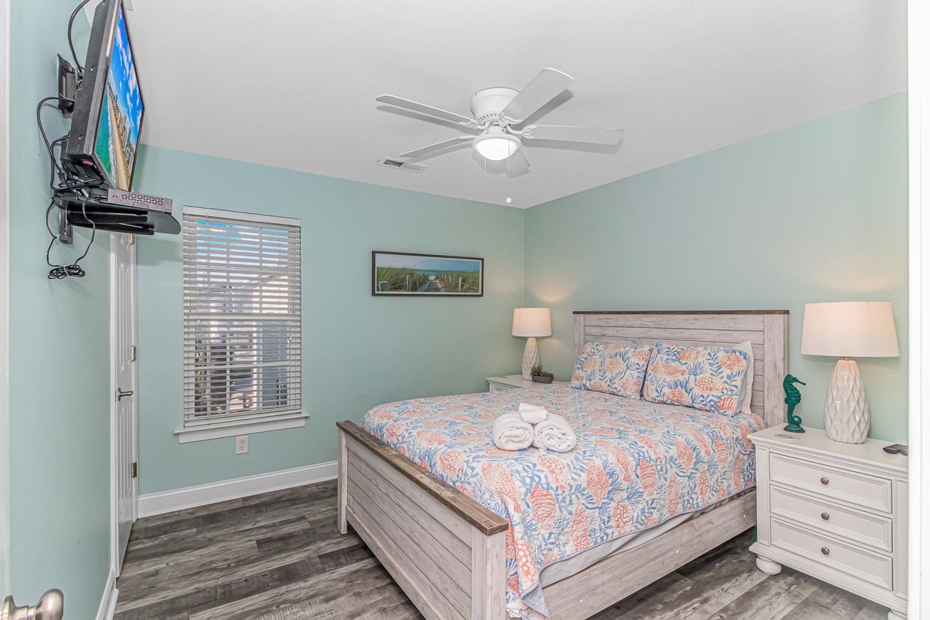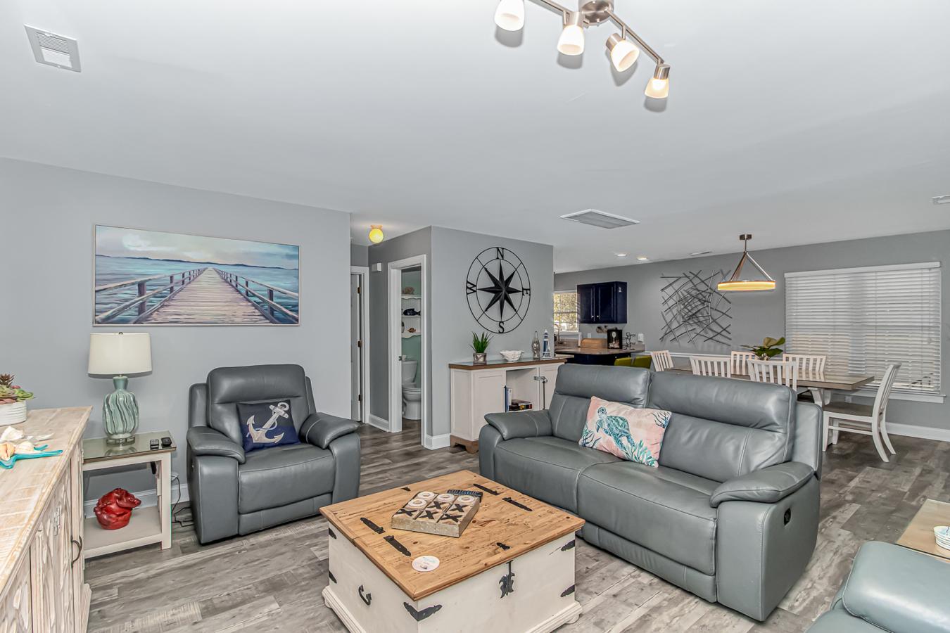 This very open and spacious 5 Bedroom, 4.5 Bath raised beach house is just a very short walk or golf cart ride to the beach. The kitchen has a nice breakfast counter to sit at and a large dining table, LVP flooring throughout, a huge master suite with access to porch.