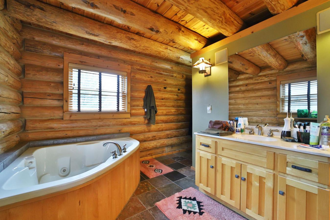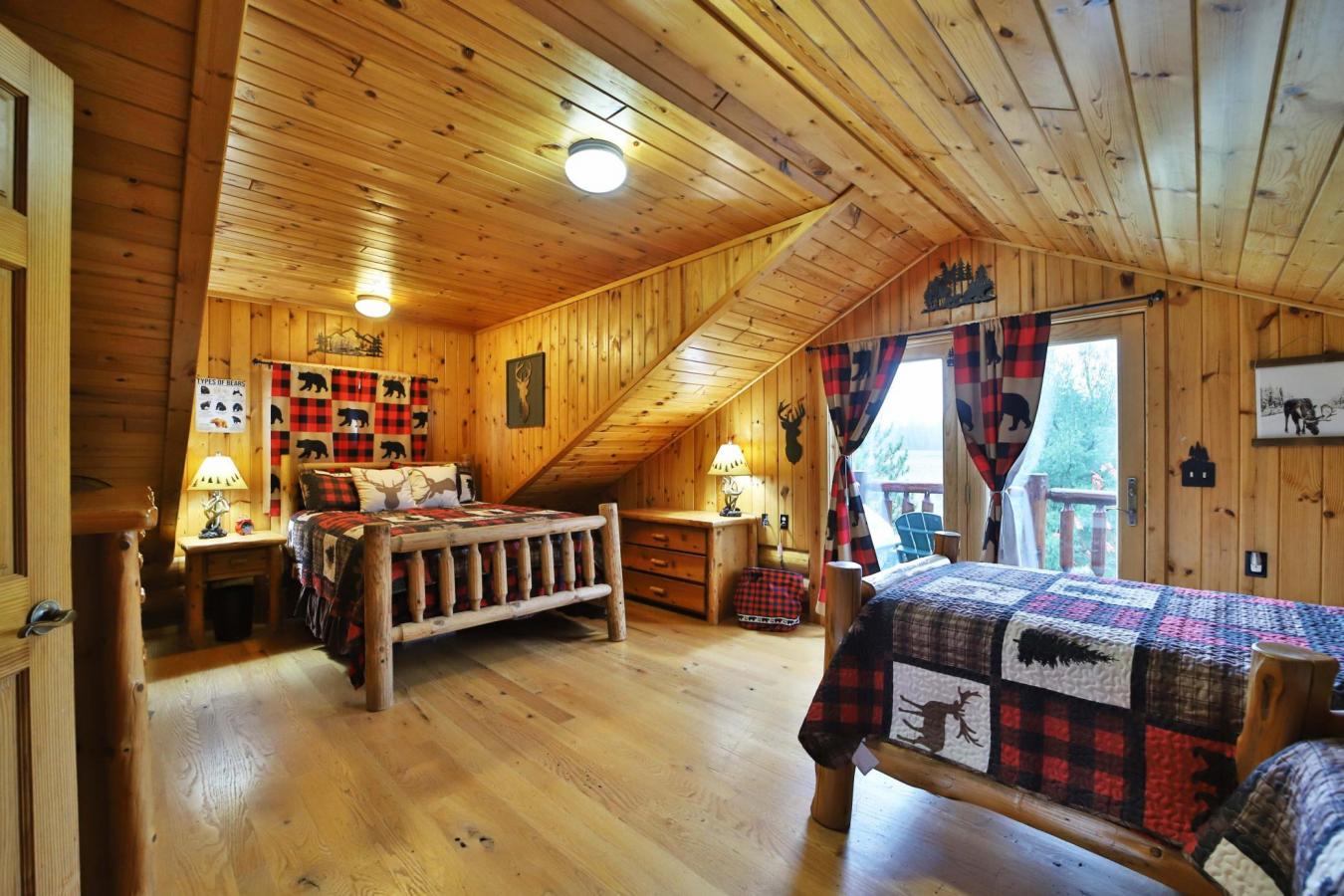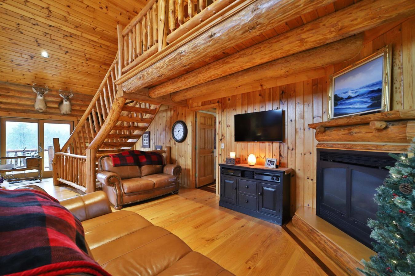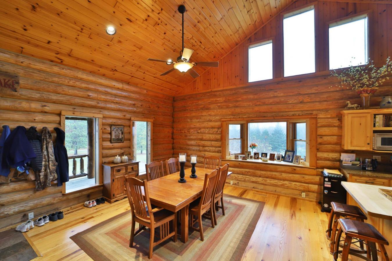 This well-built log home sits on over 10 beautiful acres bordered by 100 acres of state land, ideal for trail riding and hunting. A covered porch welcomes you into an open floor plan featuring vaulted ceilings and a kitchen with custom maple cabinets, stainless steel appliances, granite countertops, and a maple butcher block island. The cozy living room offers a gas fireplace, office nook, and ample storage. The main-level primary bedroom includes a walk-through bath with a jetted tub and tile shower, while log stairs lead to a loft bedroom with a private deck overlooking the pasture and barn. The lower level contains a safe room/library, a bedroom, full bath, living area with epoxy floors, and laundry. The detached garage is split into a heated two-stall section and a single-stall area leading to a two-bedroom plus loft apartment, currently adding 1600 per month in rent. The property also features a working hay elevator in the barn, 10 oak stalls, a tack room, and more leasable pasture acres available from neighbors. Amazing ATV and snowmobile trails are nearby, with Crystal Lake public access less than 1 mile away and 120 lakes within a 10-mile radius.