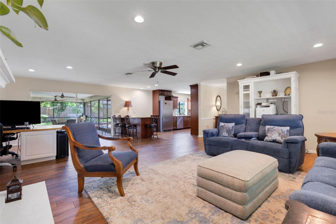 Welcome to Christina Woods, one of South Lakelands most sought-after neighborhoods, where shady trees, lush landscaping, and an oversized corner lot set the stage for this beautifully updated 4-bedroom, 3-bath pool home. From the moment you step inside, youll notice the charm and thoughtful updates throughout, including wood-look ceramic tile in the main living areas and brand-new carpet in the primary suite. The gourmet kitchen is a showstopper with raised-panel wood cabinetry, soft-close features, granite countertops, stainless steel appliances, a gas cooktop with decorative exhaust hood, a built-in oven and convection oven, plus a spacious island with seating, extra storage, and a convenient pass-through window to the pool area. Formal living and dining rooms offer traditional appeal, while the gorgeous family room steals the spotlight with its wood-burning fireplace, custom bookcase, and built-in desk perfect for work or hobbies. The split-bedroom layout provides privacy for everyone. The glamour primary suite is your private retreat with sliding doors to the pool area, a huge walk-in shower, dual vanities with granite counters, and a separate bath area. Three additional bedrooms are generously sized, one with its own ensuite bath, another with direct porch access, and a shared pool bath with double sinks and granite counters. Sliding doors from the kitchen, living room, and primary suite lead to the entertainment-sized screened porch with a custom tile floor and sparkling pool surrounded by a paver deck. Additional features include a 2-car side-entry garage, inside laundry with storage and a mop sink, 2 hot water heaters, and a wood privacy fence. All of this in a fantastic location close to schools, parks, shopping, dining, and all that Lakeland has to offer. Call today for your private showing!