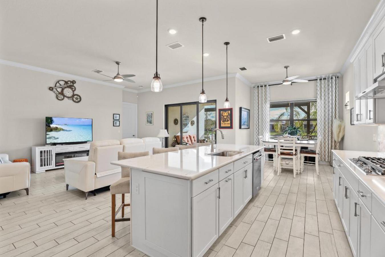 Lakefront resort-style living in Veranda Gardens. This 2023-built 3-bedroom, 2-bath home with a 2-car garage offers an open-concept floor plan, impact windows throughout, and modern upgrades designed for everyday living. The gourmet kitchen features stainless KitchenAid appliances, a gas range, quartz countertops, upgraded cabinetry, designer backsplash, a large center island, and pantry.
