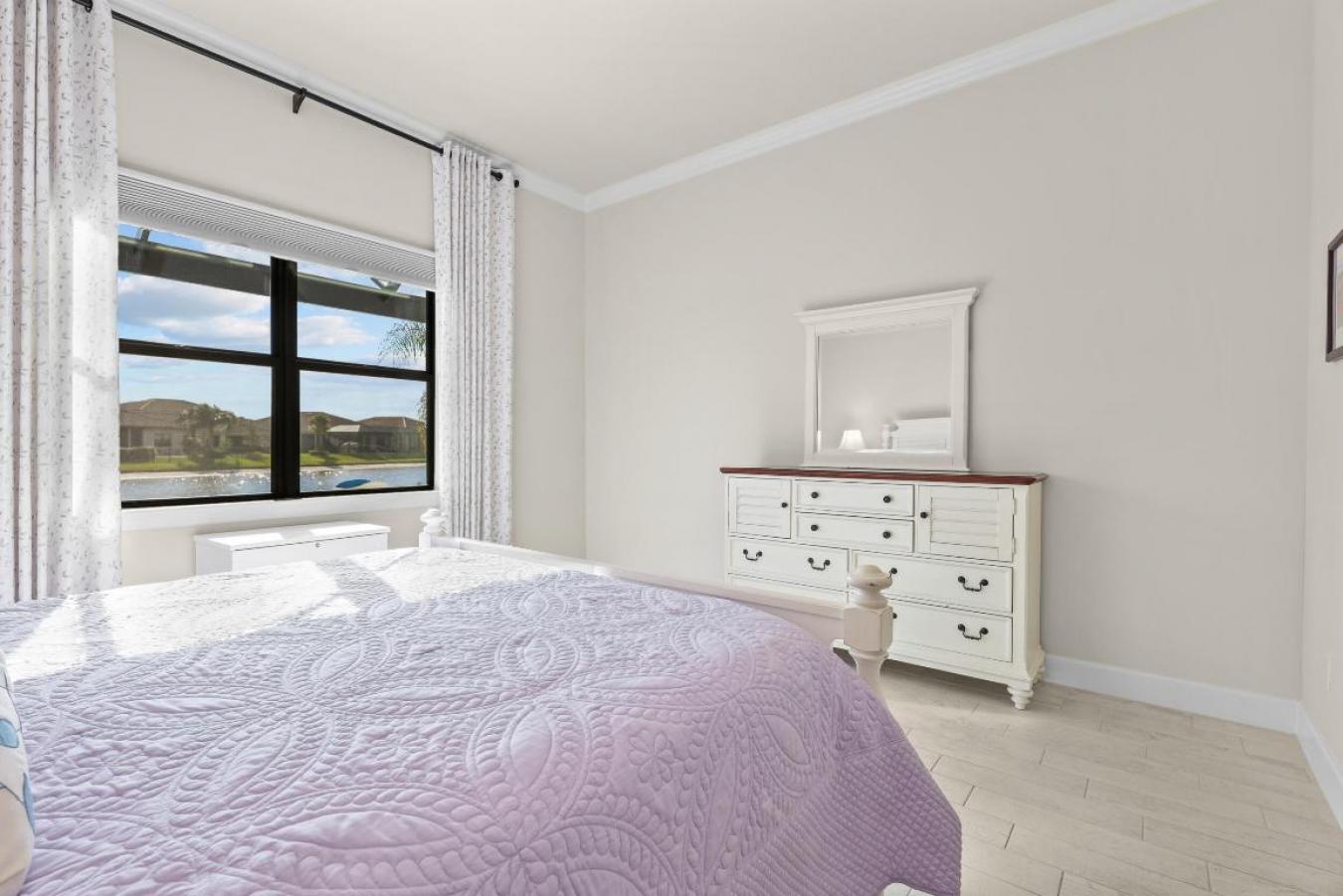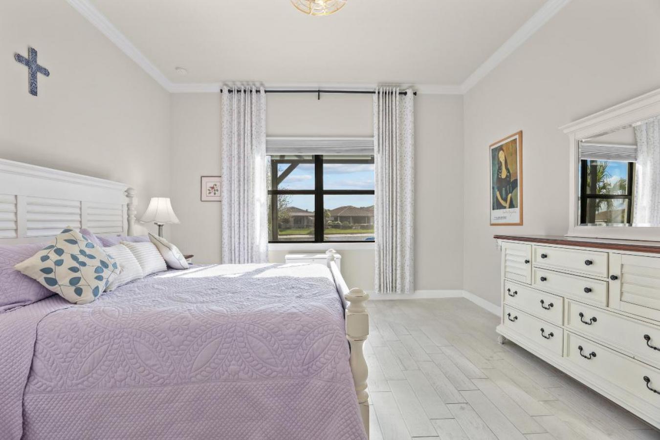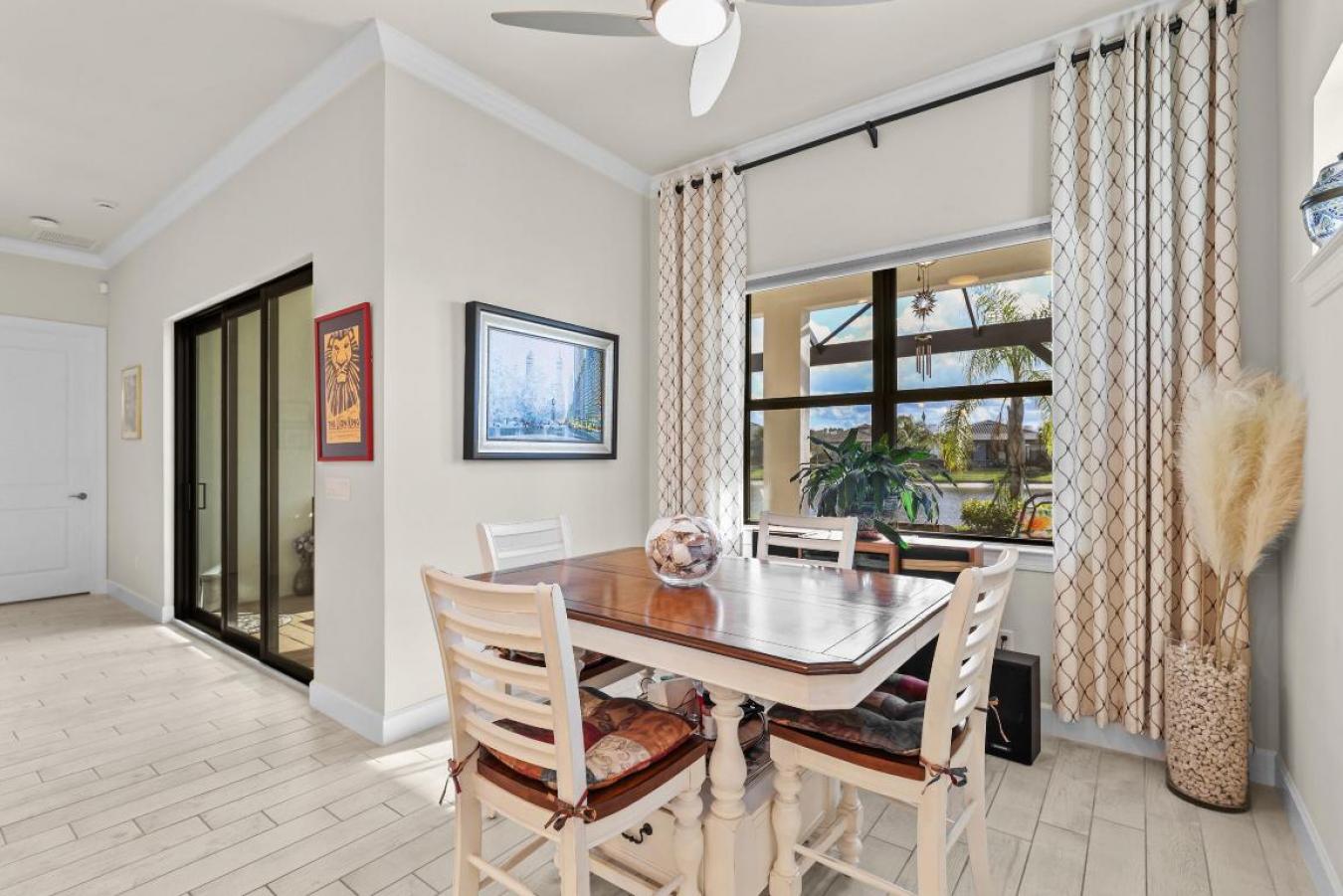 Lakefront resort-style living in Veranda Gardens. This 2023-built 3-bedroom, 2-bath home with a 2-car garage offers an open-concept floor plan, impact windows throughout, and modern upgrades designed for everyday living. The gourmet kitchen features stainless KitchenAid appliances, a gas range, quartz countertops, upgraded cabinetry, designer backsplash, a large center island, and pantry. The primary suite includes a spacious ensuite with walk-in shower and bench, dual sinks, two oversized walk-in closets, and a linen closet. A well-appointed laundry room includes washer, dryer, cabinetry, and utility sink. Step outside to a covered patio and additional screened, cage-enclosed lanai overlooking a peaceful lake with sunset views. Veranda Gardens is a gated, amenity-rich community offering lawn maintenance, a clubroom, resort-style pool, lap pool, fitness center, tennis, pickleball, bocce, basketball courts, dog park, and playground. Ideally located in South Port St. Lucie with easy access to major highways, the Florida Turnpike, Palm City, Stuart, beaches, shopping, dining, and Palm Beach County. A move-in-ready lakefront home built in 2023 with resort amenities and commuter-friendly access.