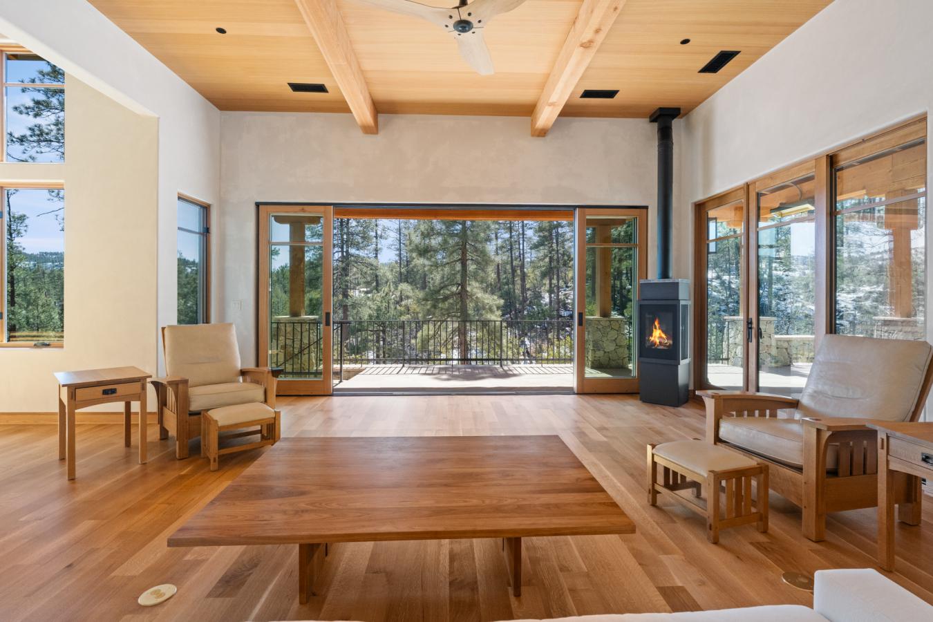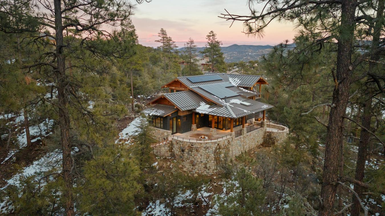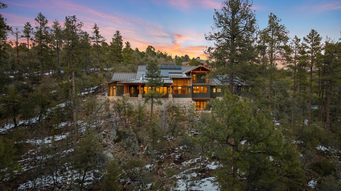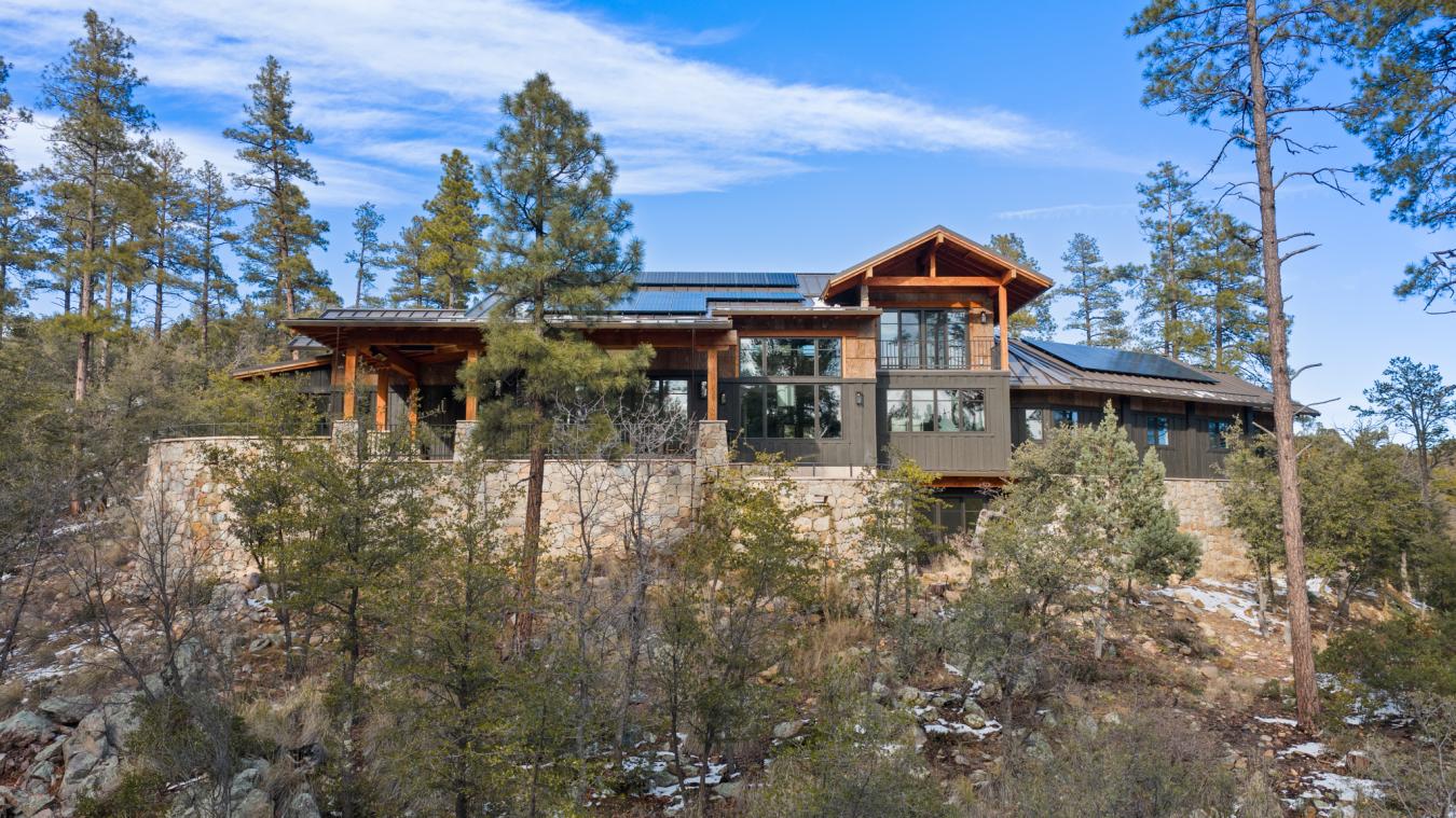 Architecturally significant modern luxury in the private gated community of High Valley Ranch -- located just minutes from historic downtown Prescott while offering exceptional privacy surrounded by pristine pines. Completed in December 2023 and only lightly lived in due to extensive travel, this custom-built, site-specific, near new, residence represents a distinct tier of construction within the community. Designed to integrate seamlessly with its pine forest surroundings, the main living areas were intentionally oriented to capture both sunrise and sunset, allowing natural light to define the interior experience throughout the day. Unlike many homes in the area, this residence is anchored by massive Arizona stone retaining walls rising from a full solid concrete foundation -- creating structural permanence, thermal stability, and sculptural presence. Rustic timbers and distinctive Poplar wood tiles enrich the exterior aesthetic, blending natural materials with modern refinement. A durable metal roofing system crowns the structure, selected for longevity and architectural cohesion. A dramatic retractable glass wall system forms the architectural centerpiece of the living room, opening fully to expansive outdoor entertaining spaces. This seamless indoor-outdoor living design creates year-round connection to the incredible landscape. Inside, refined modern finishes reflect elevated craftsmanship: hand-troweled plaster walls with smooth wax texture, white oak flooring, soaring ceilings approaching 20 feet lined with white oak veneer, and custom solid white oak soft-close cabinetry and drawers extending throughout the kitchen, bathrooms, and garage. Taj Mahal quartzite surfaces, solid wood doors, and carefully curated materials reinforce both durability and design integrity. The chefs dream kitchen anchors the main level with an expansive quartzite island, SubZero refrigeration, Wolf cooking appliances, Miele dishwasher, a thoughtfully integrated butlers pantry and beautiful views of the forest. The open-concept layout was designed for effortless entertaining while maintaining architectural cohesion. Spa-inspired baths feature heated natural limestone flooring and river rock walk-in showers. The main-level primary suite provides patio access and a cedar-lined walk-in closet, creating a private retreat designed for full-time living. Additional highlights include a Nexo freestanding gas stove, built-in gas fire pit, integrated patio heaters, plush wool bedroom carpeting, private theater room, stainless-steel chemical-free hot tub, large sauna, 15.4 kW solar system, multi-zone Mitsubishi climate control, whole house humidity control, whole-house water filtration and softener, and an insulated oversized three-car garage with EV charging, built-in heaters, custom cabinetry and stainless-steel sink. Purposefully constructed for long-term performance, this residence stands apart as one of High Valley Ranchs most recently completed architectural homes -- offering modern craftsmanship, structural integrity, luxury, and enduring design within one of the most beautiful natural settings in Prescott.