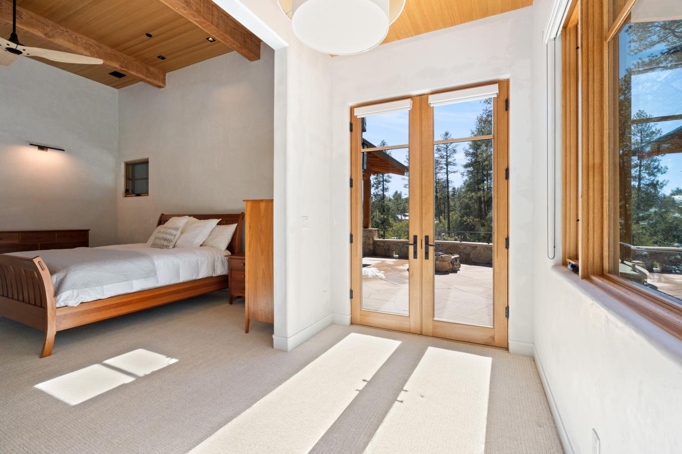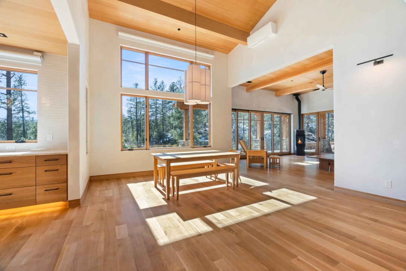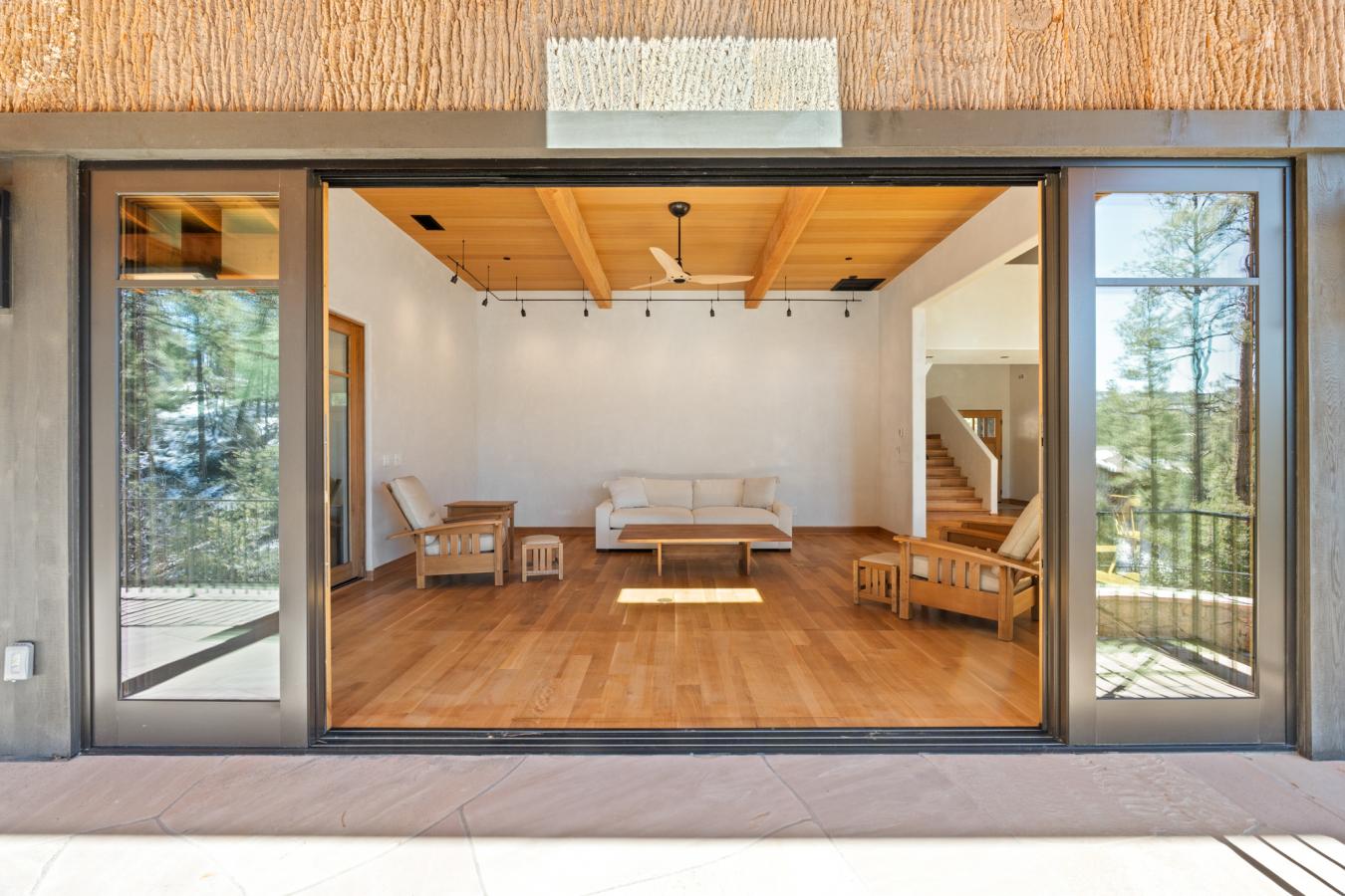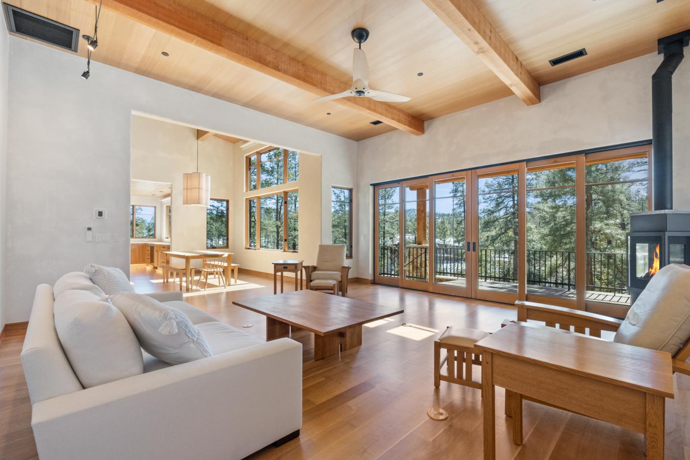 Architecturally significant modern luxury in the private gated community of High Valley Ranch -- located just minutes from historic downtown Prescott while offering exceptional privacy surrounded by pristine pines. Completed in December 2023 and only lightly lived in due to extensive travel, this custom-built, site-specific, near new, residence represents a distinct tier of construction within the community. Designed to integrate seamlessly with its pine forest surroundings, the main living areas were intentionally oriented to capture both sunrise and sunset, allowing natural light to define the interior experience throughout the day. Unlike many homes in the area, this residence is anchored by massive Arizona stone retaining walls rising from a full solid concrete foundation -- creating structural permanence, thermal stability, and sculptural presence. Rustic timbers and distinctive Poplar wood tiles enrich the exterior aesthetic, blending natural materials with modern refinement. A durable metal roofing system crowns the structure, selected for longevity and architectural cohesion. A dramatic retractable glass wall system forms the architectural centerpiece of the living room, opening fully to expansive outdoor entertaining spaces. This seamless indoor-outdoor living design creates year-round connection to the incredible landscape. Inside, refined modern finishes reflect elevated craftsmanship: hand-troweled plaster walls with smooth wax texture, white oak flooring, soaring ceilings approaching 20 feet lined with white oak veneer, and custom solid white oak soft-close cabinetry and drawers extending throughout the kitchen, bathrooms, and garage. Taj Mahal quartzite surfaces, solid wood doors, and carefully curated materials reinforce both durability and design integrity. The chefs dream kitchen anchors the main level with an expansive quartzite island, SubZero refrigeration, Wolf cooking appliances, Miele dishwasher, a thoughtfully integrated butlers pantry and beautiful views of the forest. The open-concept layout was designed for effortless entertaining while maintaining architectural cohesion. Spa-inspired baths feature heated natural limestone flooring and river rock walk-in showers. The main-level primary suite provides patio access and a cedar-lined walk-in closet, creating a private retreat designed for full-time living. Additional highlights include a Nexo freestanding gas stove, built-in gas fire pit, integrated patio heaters, plush wool bedroom carpeting, private theater room, stainless-steel chemical-free hot tub, large sauna, 15.4 kW solar system, multi-zone Mitsubishi climate control, whole house humidity control, whole-house water filtration and softener, and an insulated oversized three-car garage with EV charging, built-in heaters, custom cabinetry and stainless-steel sink. Purposefully constructed for long-term performance, this residence stands apart as one of High Valley Ranchs most recently completed architectural homes -- offering modern craftsmanship, structural integrity, luxury, and enduring design within one of the most beautiful natural settings in Prescott.