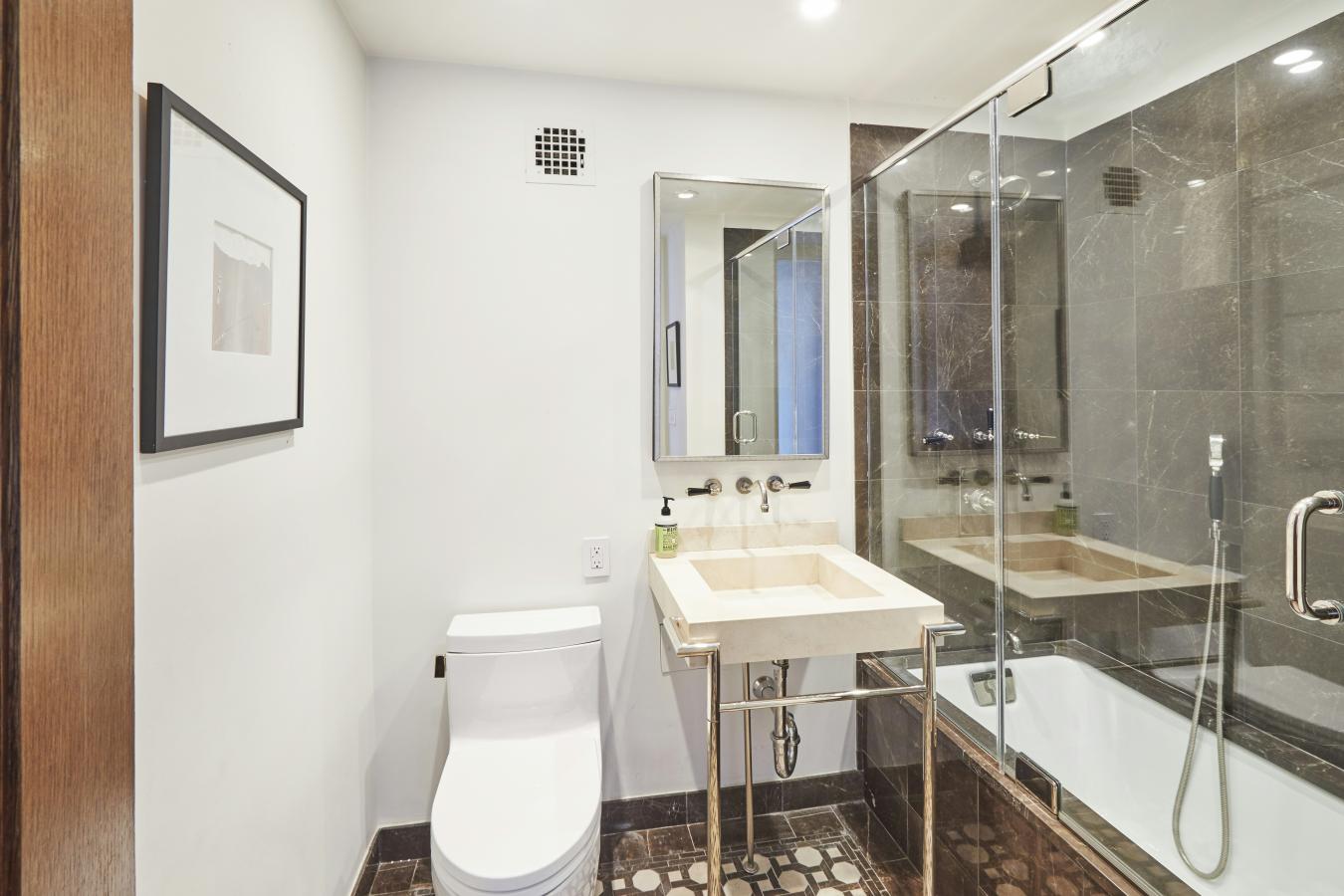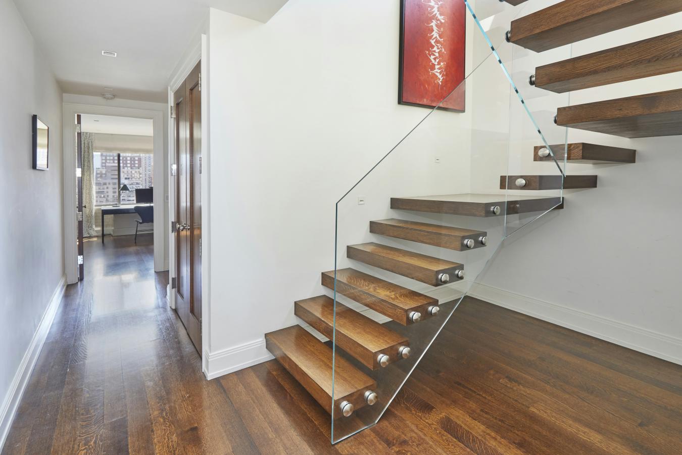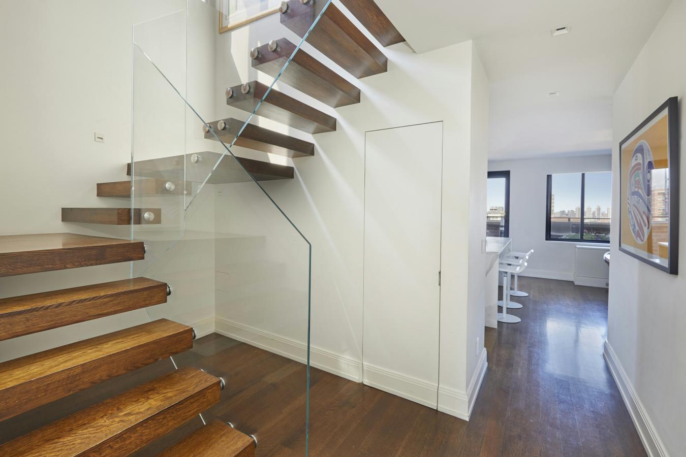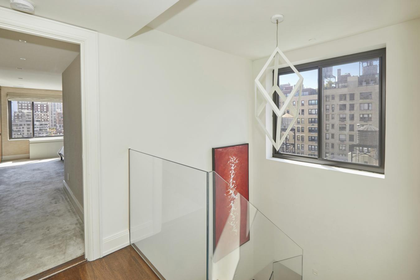 Penthouse 15B is a rare and architecturally distinctive duplex offering approximately 1,735 square feet of elegant interior living space and two private terraces high above Carnegie Hill. Quiet and sun-filled, this exceptional residence combines soaring volume, a wood-burning fireplace, expansive outdoor space, and panoramic city and East River views, an extraordinary combination seldom found in the neighborhood. The first level is designed for gracious entertaining. A dramatic living room with a vaulted ceiling is anchored by a striking double-sided wood-burning fireplace, creating warmth and architectural presence. Floor-to-ceiling glass doors open to a wraparound terrace spanning the length of the home, offering breathtaking open views and a seamless extension of the living space, ideal for dining, relaxing, and entertaining. The open gourmet kitchen is both refined and functional, featuring a Wolf range and microwave, Sub-Zero refrigerator, wine cooler, ice maker, and an expansive marble-topped island that serves as a breakfast bar and natural gathering place. An elegant dining area flows effortlessly into the kitchen and living space, creating an ideal layout for both everyday living and hosting. This level also includes a versatile third bedroom or home office, with a full bathroom, privately positioned. A striking floating glass staircase leads to the upper level. The tranquil, south-facing primary suite is flooded with natural light and features an en-suite marble bath with heated floors and a steam shower, along with three closets, including a custom walk-in. The second bedroom offers its own en-suite bath and direct access to a generous north-facing terrace with a retractable awning, an intimate and private outdoor retreat. The residence is enhanced by Savant and Lutron smart home technology controlling lighting and custom shades, Sonos audio throughout, through-wall heating and air conditioning with individual room controls, and an in-home washer and dryer. The Royal Carnegie is a full-service, pet-friendly boutique condominium with a full-time doorman and staff, fitness center, and beautifully maintained garden. Perfectly positioned on a tree-lined Carnegie Hill street moments from Central Park, Museum Mile, Madison Avenue shopping, fine dining, top hospitals, schools, and buses and subway, Penthouse 15B offers a rare opportunity to own a true penthouse with exceptional light, outdoor space, and architectural character in one of Manhattans most coveted neighborhoods.
