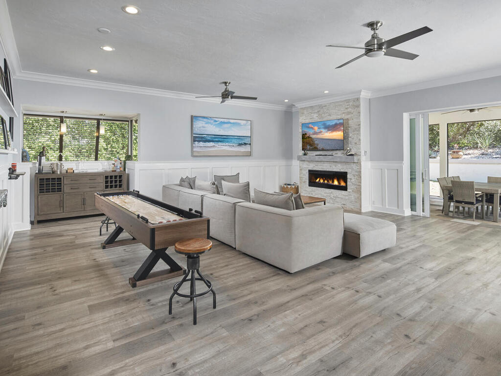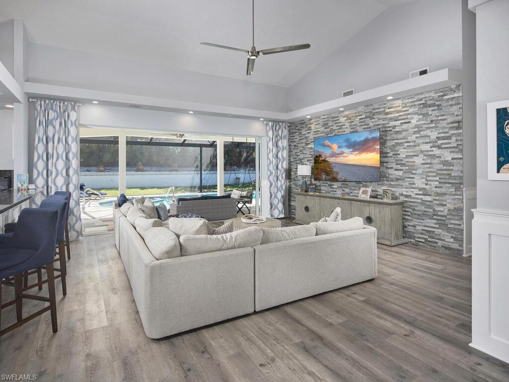 Exceptional 4 bedroom, 3 and a half bath home located in the prestigious Estates of Marco Island. Upon entering the home, you will be impressed by the soaring ceilings, light and bright interior, and luxurious finishes throughout. The living room offers a beautiful stone feature wall and views of the spacious lanai.
