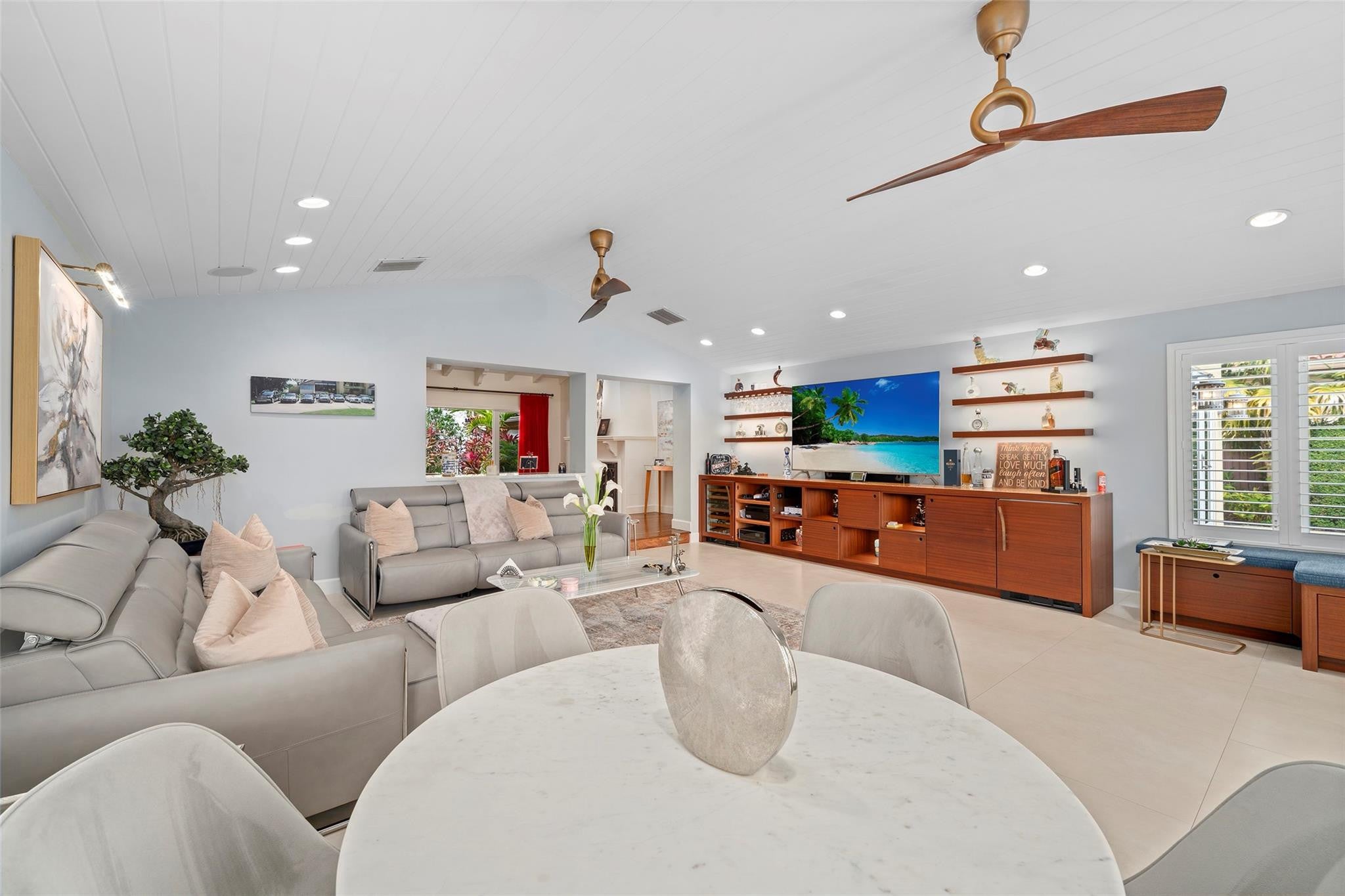 Welcome to this renovated Florida bungalow with 100 feet of waterfront on 200-foot-wide Oriente Lagoon, offering direct Intracoastal access, no fixed bridges. This single-story smart home features a split floor plan with 4 beds, 4 baths, 2 half baths. Enjoy a formal living room with vaulted beamed ceilings and fireplace, formal dining, and family room opening to the pool and patio.