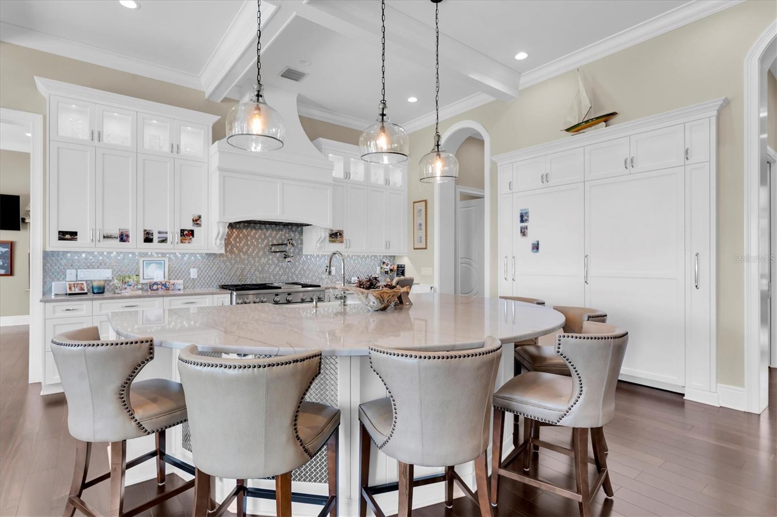 Welcome to Eleanor Beach, an extraordinary beachfront luxury residence in the heart of Perdido Key. This like-new custom home (built circa 2023) offers 5,046 sqft heated & cooled and showcases hurricane-resilient, elevated construction designed for both elegance and durability. Designed by renowned Bob Chatham Custom Home Design with interiors by Melanie Martin Interiors, the home blends refined coastal living with architectural distinction, including a Dutch West Indiesstyle parapet roof reminiscent of Rosemary Beach. Built on precast concrete pilings, the elevated main living level and pool deck provide superior storm protection, while an ICF concrete North wall enhances structural strength, energy efficiency, and sound insulation. An elevator offers access between all 3 levels. Enjoy 12 ceilings on the main floor and 11 ceilings on the third floor, creating an expansive, light-filled atmosphere. The kitchen features a Wolf 6-burner gas range with pot filler, two dishwashers, a full-size refrigerator and separate full-size freezer, a wet bar with wine cooler, and a massive walk-in butlers pantry. Double floor-to-ceiling sliding glass doors open to the pool deck, delivering exceptional indoor-outdoor living. A striking 42 gas fireplace carries through from the living room into the Gulf-front primary bedroom. The home offers two primary suitesone Gulf-front on the third floor with a private balcony and wet bar with wine cooler, and one on the main floor featuring dramatic 9 windows. Total accommodations include 5 bedrooms with en suite baths, a bunk room, a half bath, and a heated/cooled ground-level bonus area ideal for a game room or media space, and 4 car garage. Designer touches include wallpapered bedroom ceilings and Lutron smart blinds throughout. Sold fully furnished with upscale coastal dcor, Eleanor Beach is perfect as a primary residence, luxury vacation retreat, or high-end investment property. Experience elevated Gulf Coast living at its finest.